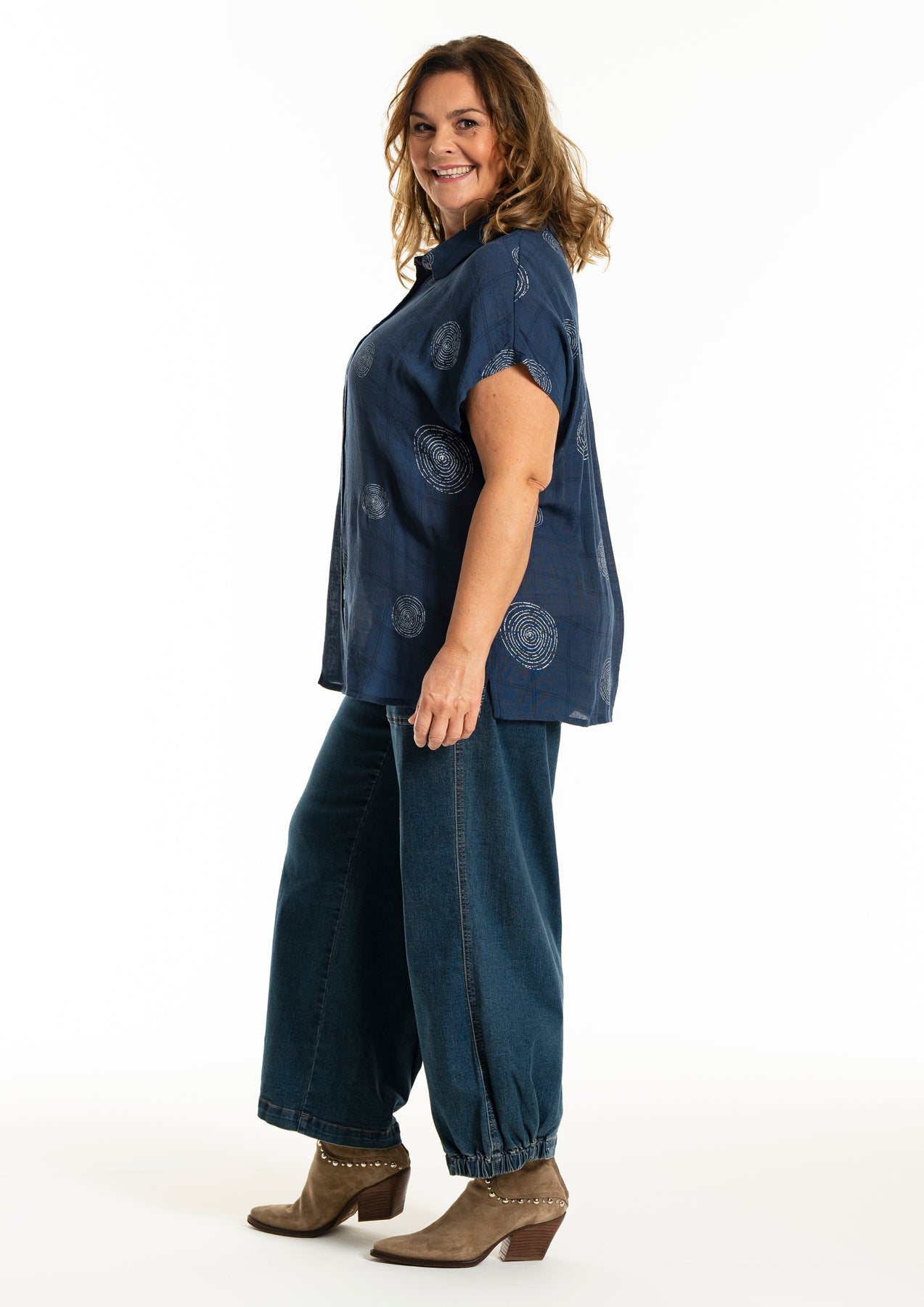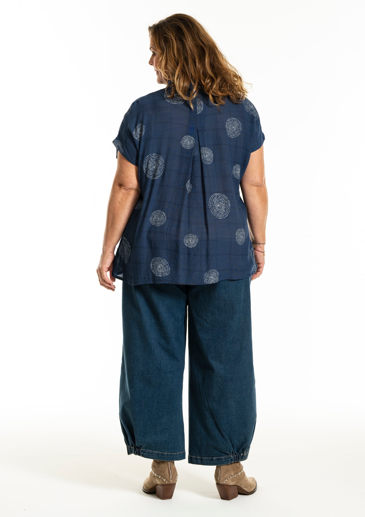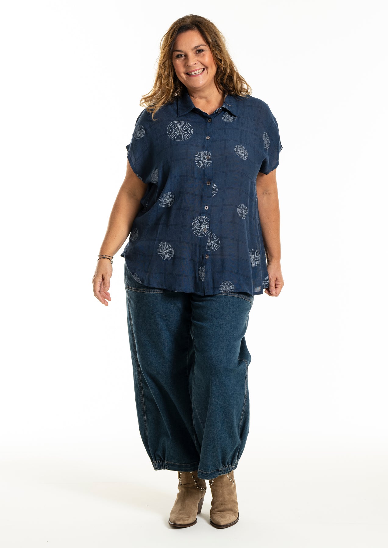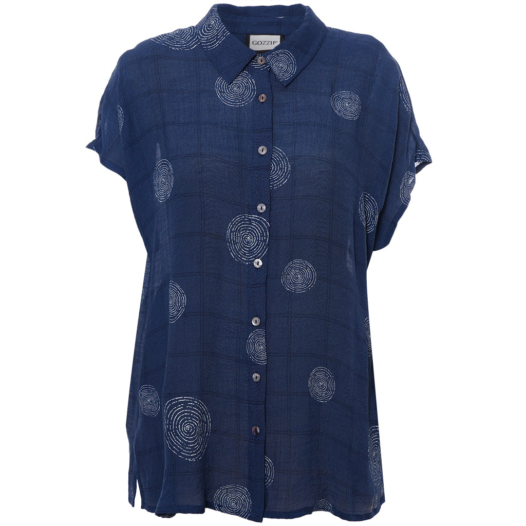 Gozzip - Kaisa flott og sparileg blússa með mynstri. Stuttar ermar, skyrtukragi, hneppt að framan, A-snið, klauf á hlið, með fellingu í baki sem gefur góða vídd.
