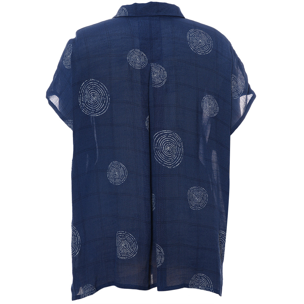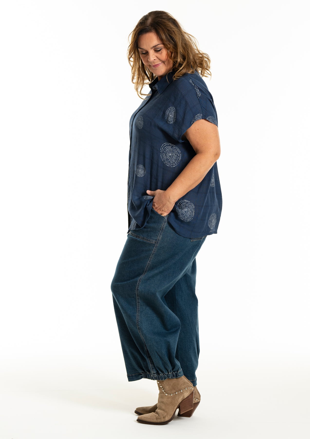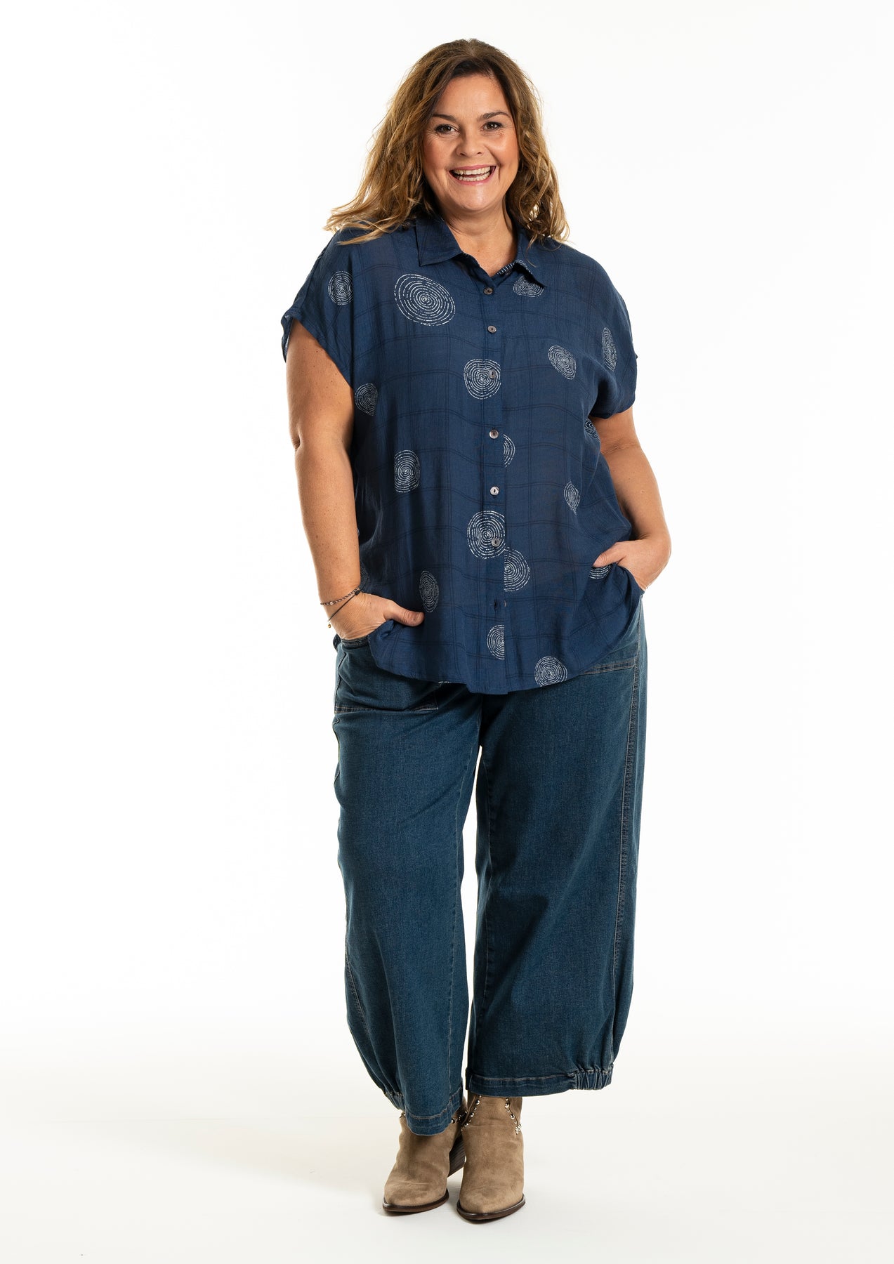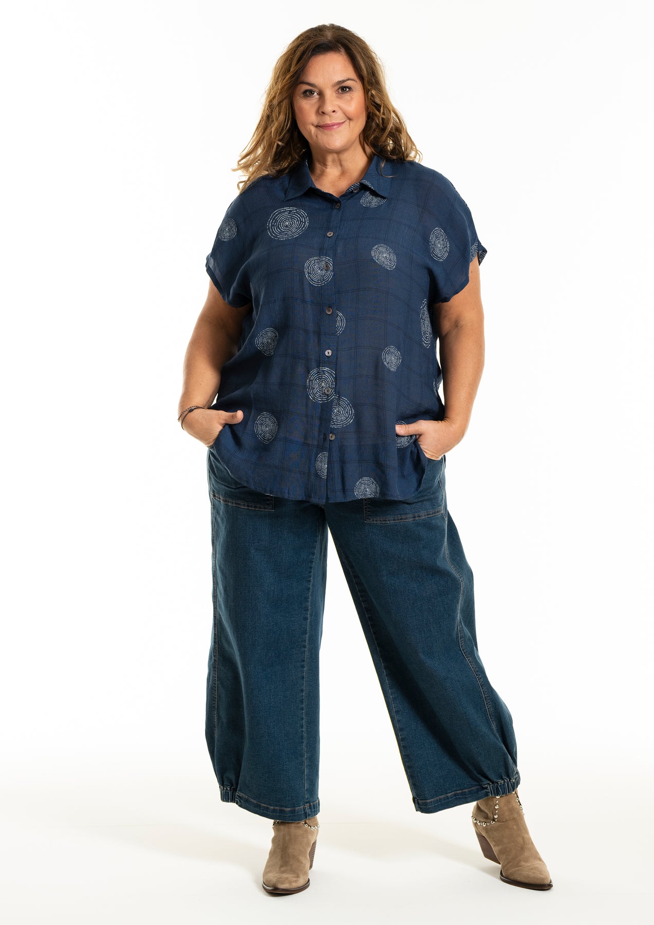 Gozzip - Kaisa flott og sparileg blússa með mynstri. Stuttar ermar, skyrtukragi, hneppt að framan, A-snið, klauf á hlið, með fellingu í baki sem gefur góða vídd.