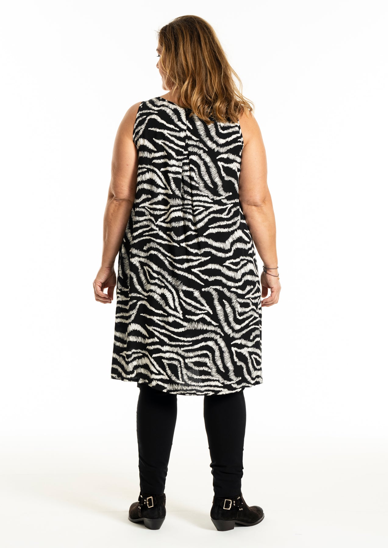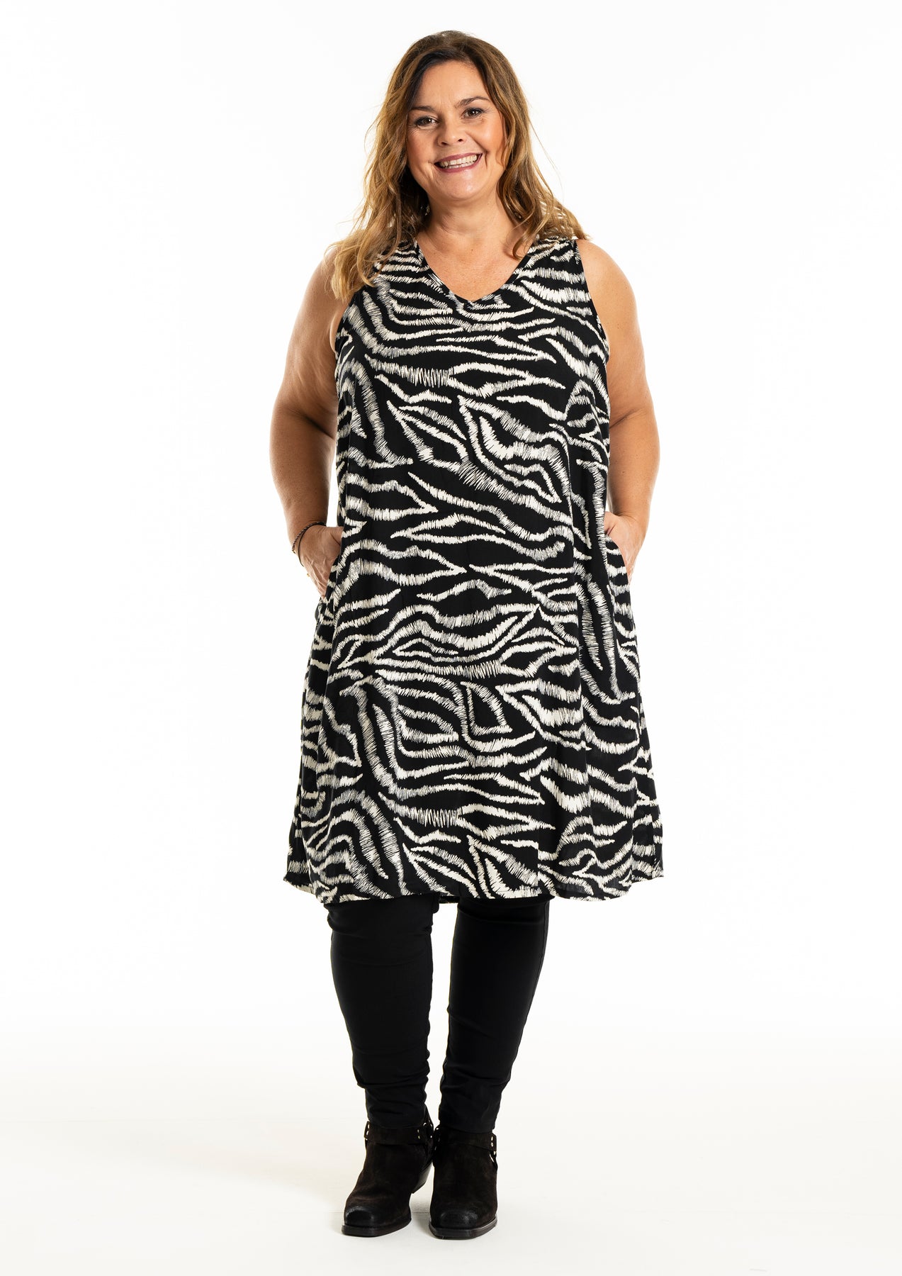 Gozzip - Karrie hlýrakjóll með flottu mynstri. V-hálsmál, breiðir hlýrar, góðir vasar að framan, A-snið. Flottur undir jakka eða bara einn og sér, virkar vel bæði spari og hversdags.