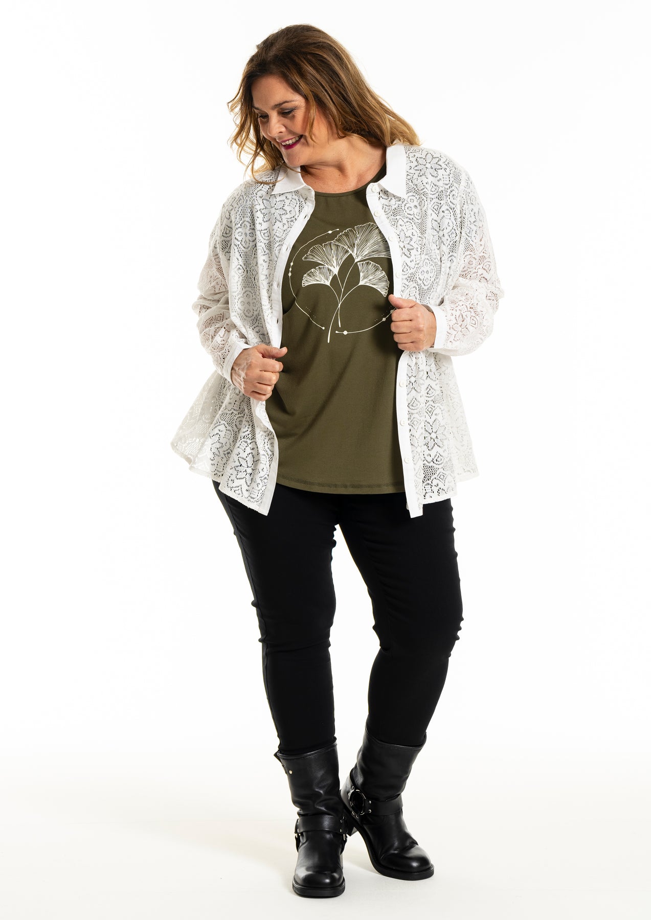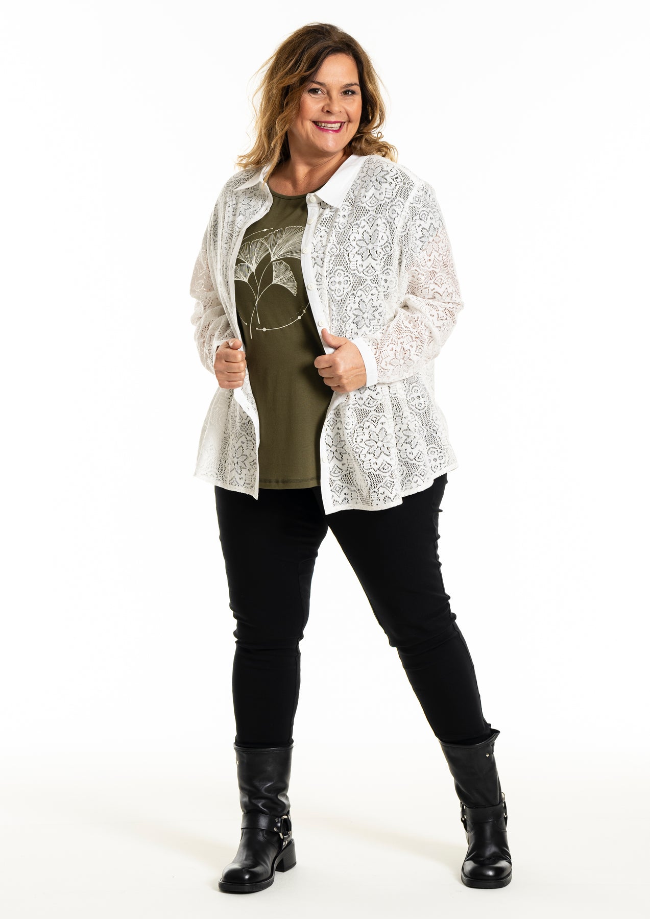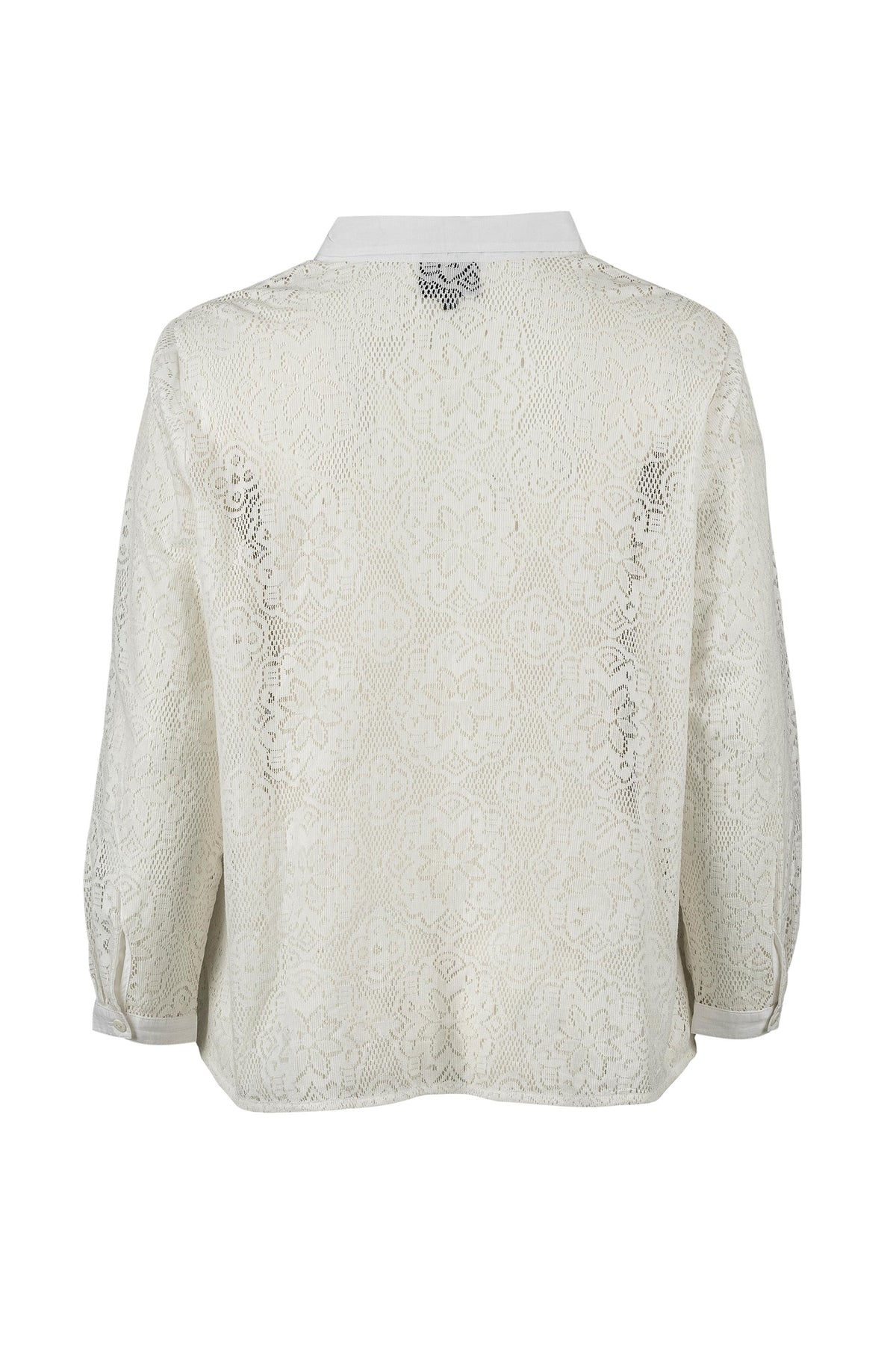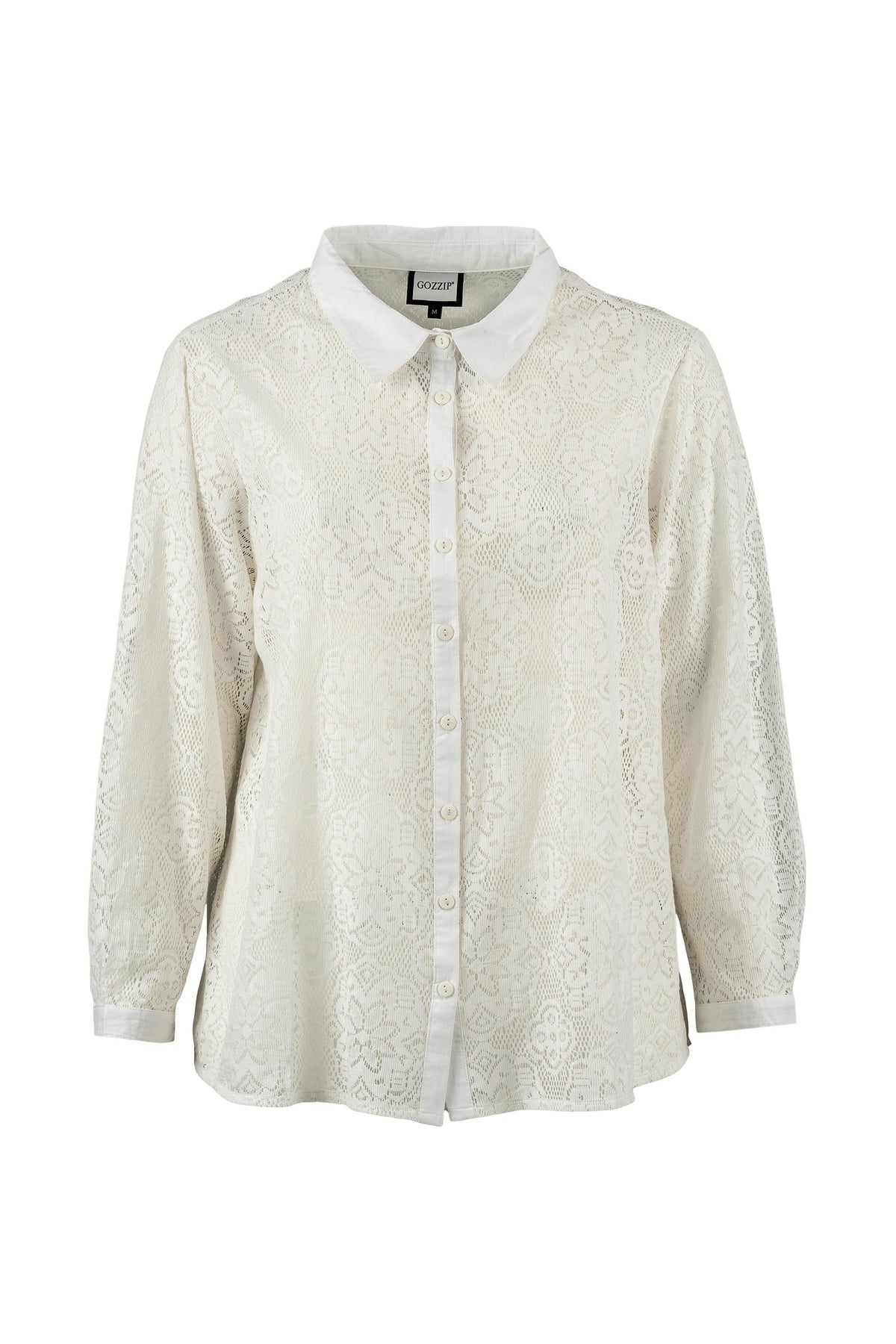 Gozzip - Myra falleg og sparileg blúnduskyrta. Skyrtukragi, hneppt niður að framan, langar ermar, hálfgegnsætt efni. Hægt að nota opna yfir buxur og topp eða lokaða.