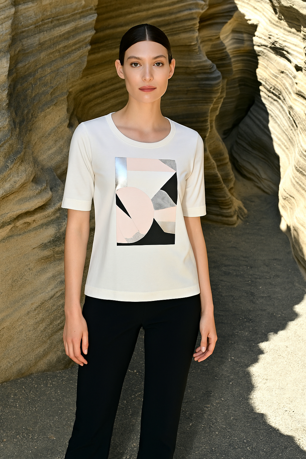 I'cona - Patsy stuttermabolur með mynd og rúnuðu hálsmáli. Léttur og þægilegur og er smart einn og sér eða undir jakka eða peysu.