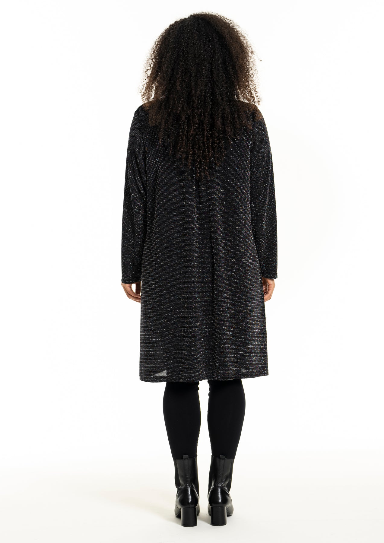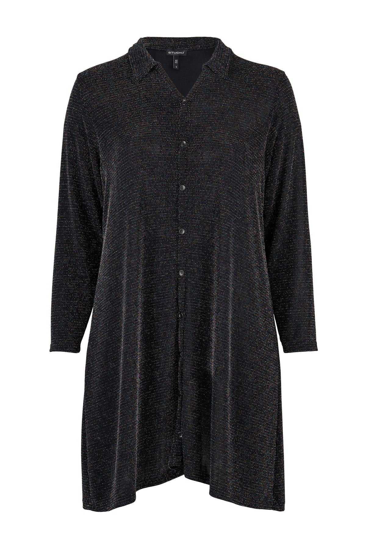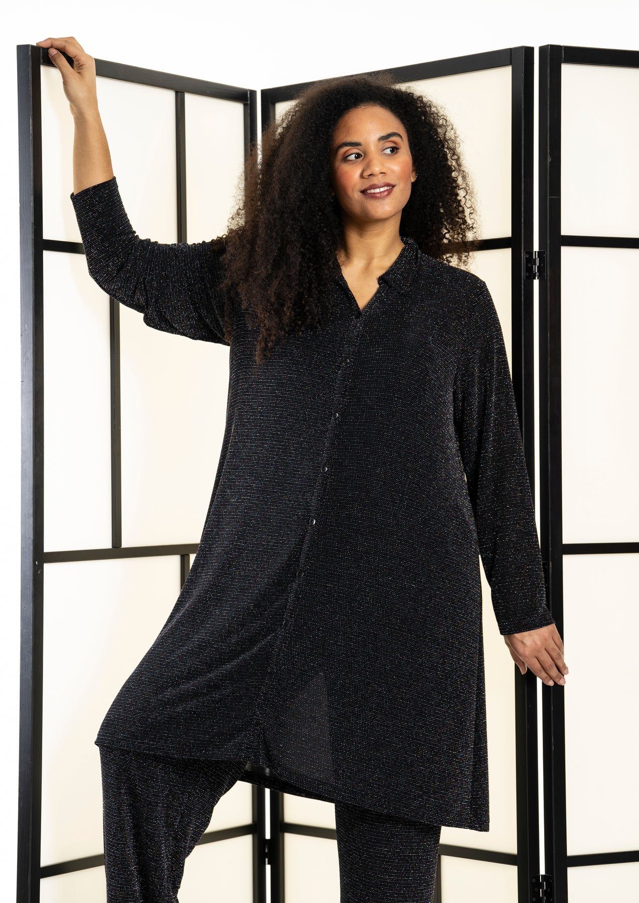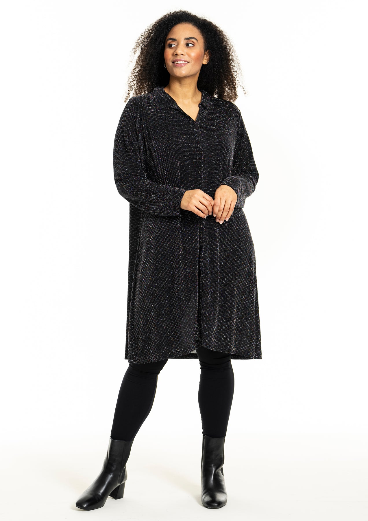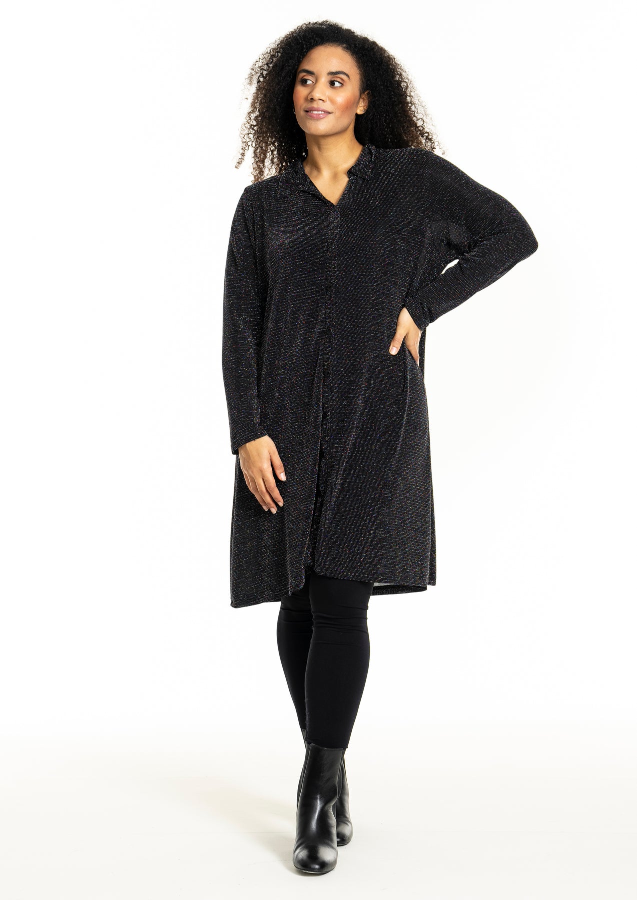 Studio - Emilie síð skyrta með lituðu glimmer í efni, hneppt alla leið niður, með kraga, langar ermar og rykking í baki. Hægt að nota opna yfir buxur og topp eða lokaða eins og kjól.