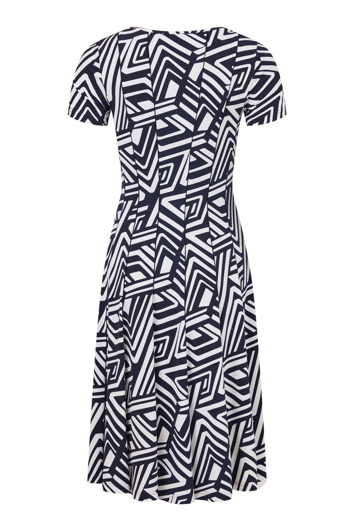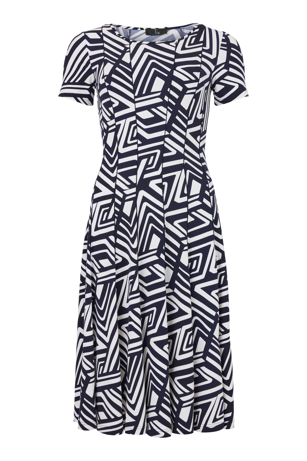 Tia - Ellen fallegur kjóll með flottu mynstri, rúnuðu hálsmáli og stuttum ermum. Þétt efni, saumar niður eftir kjól sem liggur vel og gefur efninu góða hreyfingu.