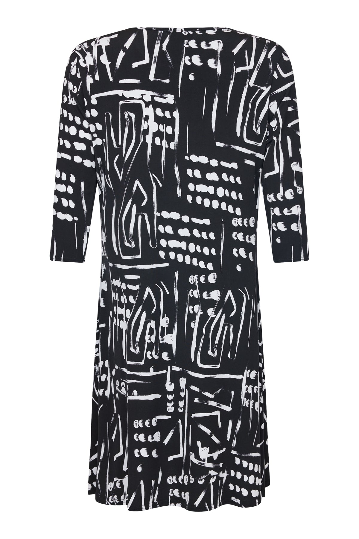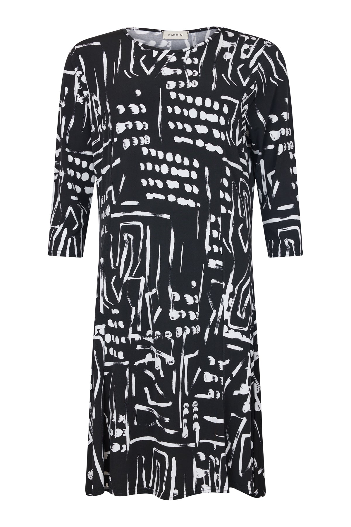 Bassini - Miah fallegur og sparilegur kjóll með flottu mynstri. Rúnað hálsmál, kvartermar og A-snið. Flottur einn og sér og undir fínan jakka eða opna peysu.