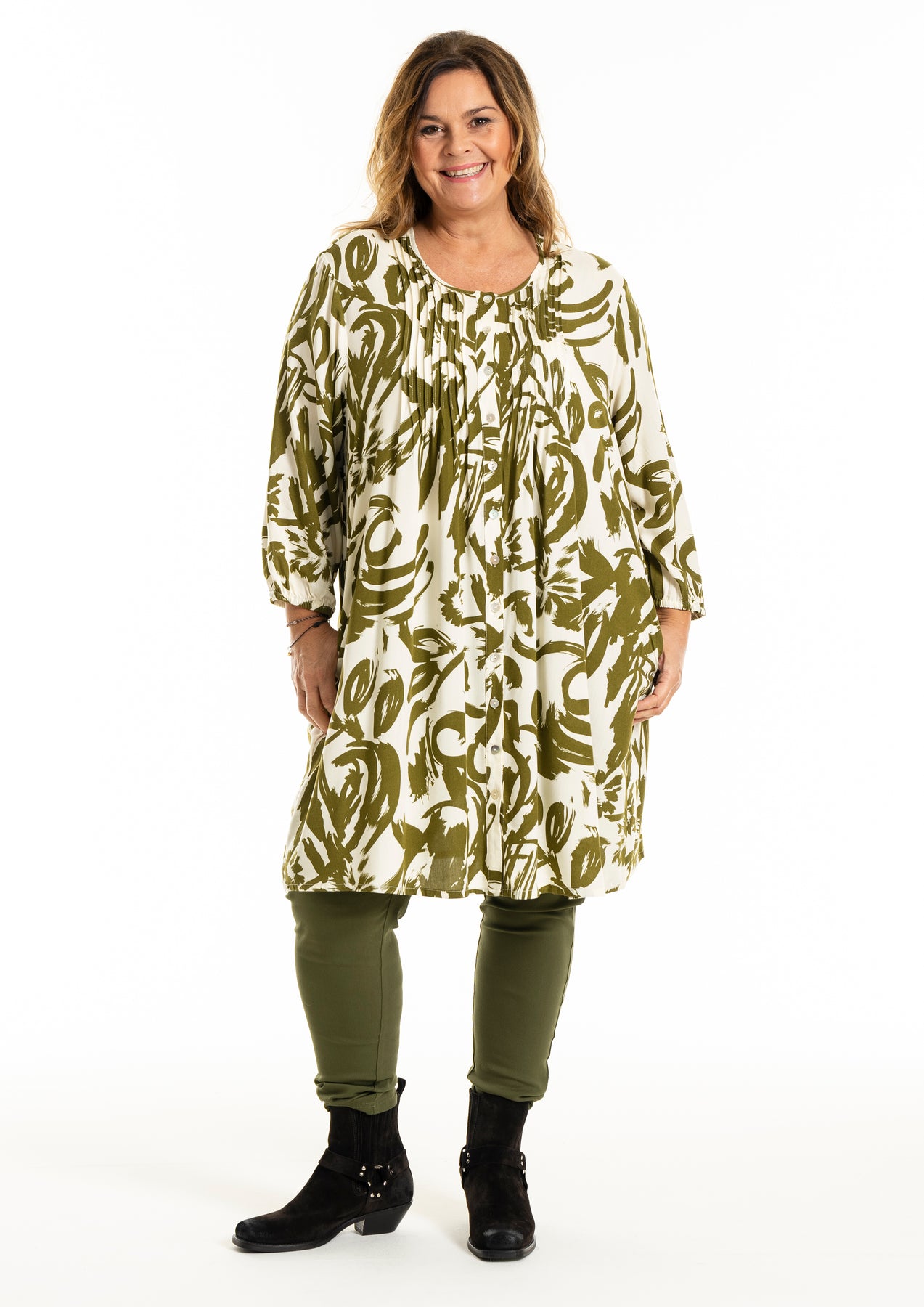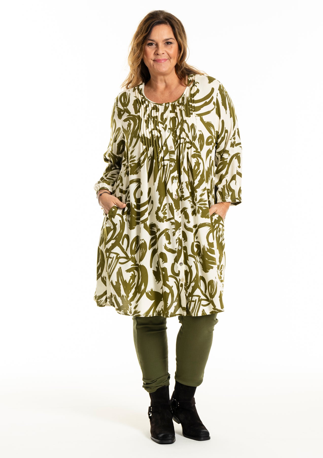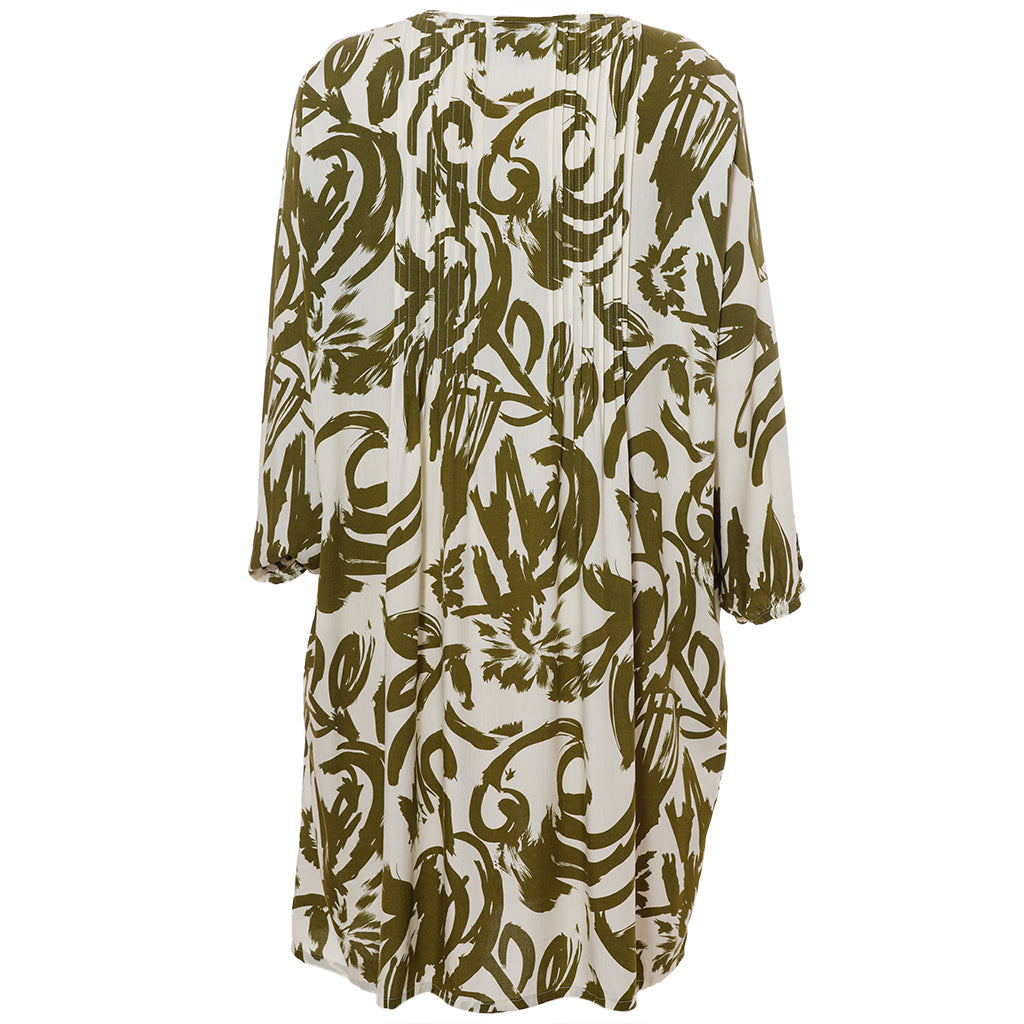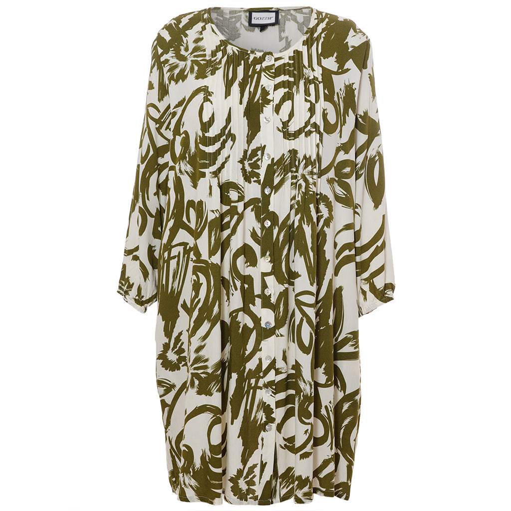 Gozzip - Johanne skyrtukjóll með kremhvítu og grænu mynstri. Látlaus með plíseringu að framan, tölur alla leið, langar ermar með teygju og góðum vösum, hægt að nota opinn yfir buxur og topp eða lokaðan eins og kjól eða tuniku.