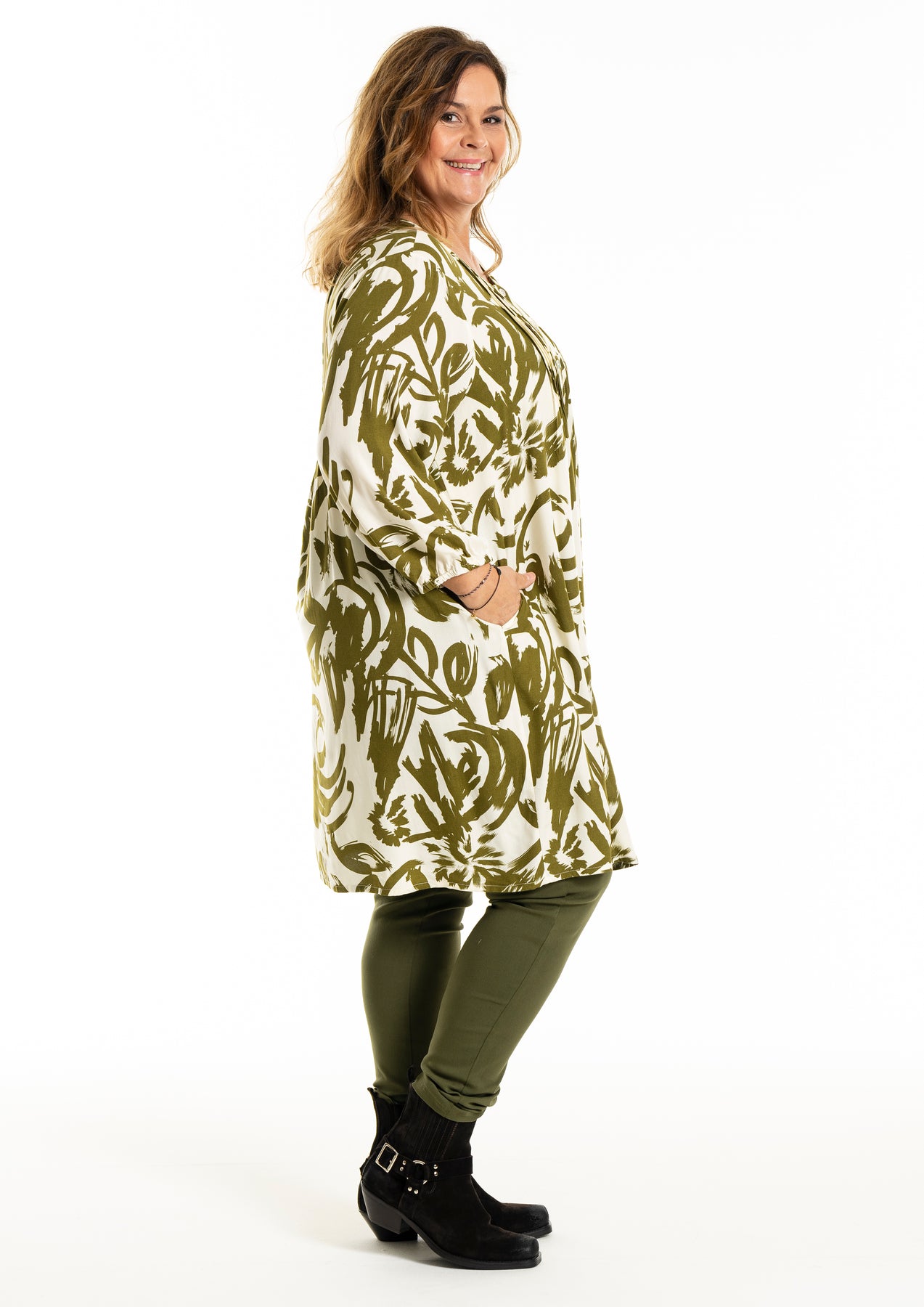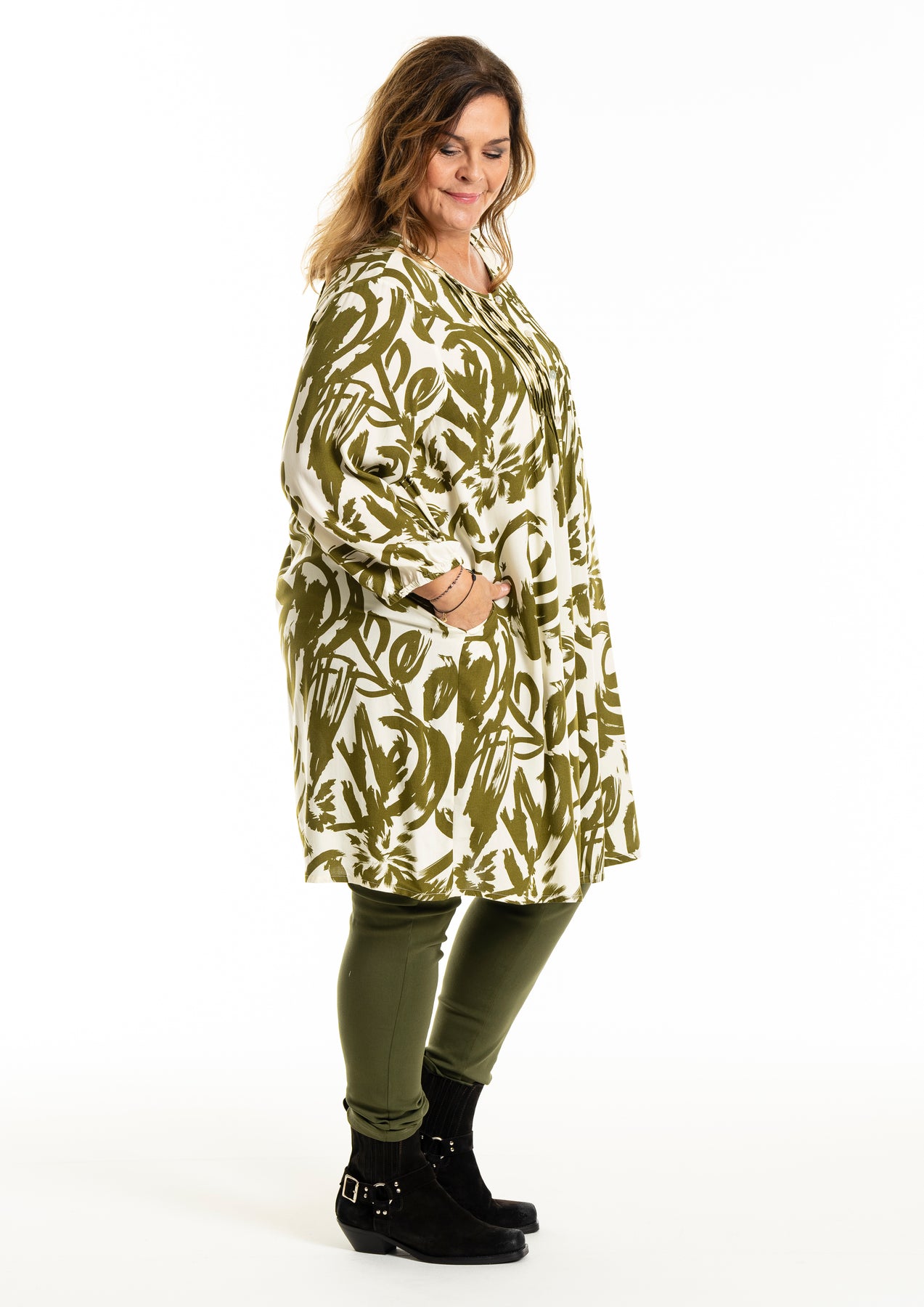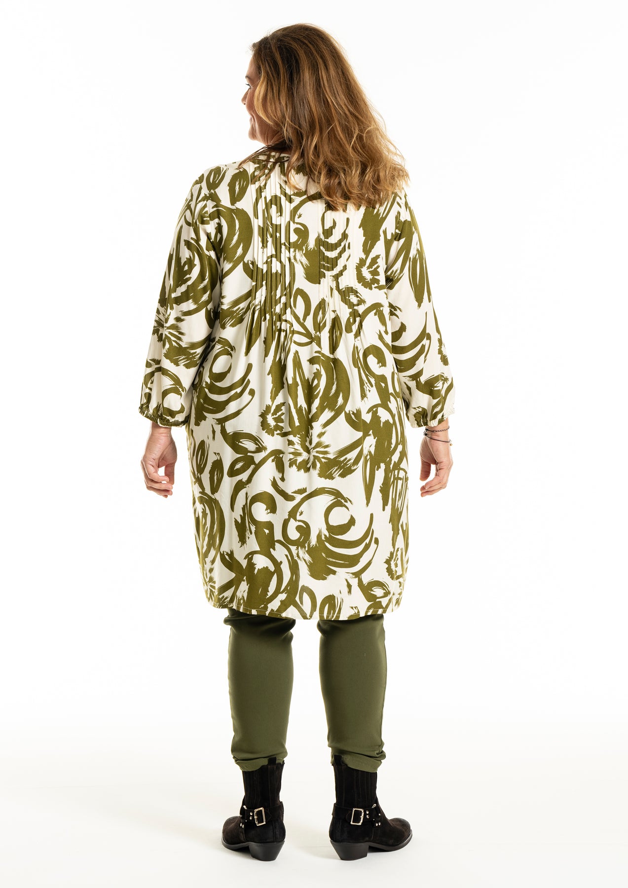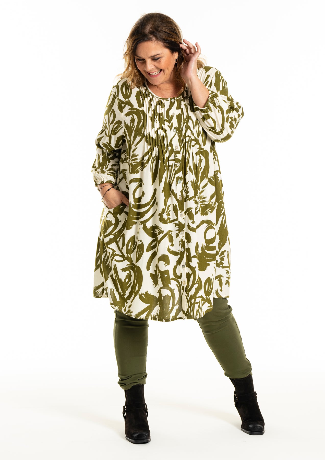 Gozzip - Johanne skyrtukjóll með kremhvítu og grænu mynstri. Látlaus með plíseringu að framan, tölur alla leið, langar ermar með teygju og góðum vösum, hægt að nota opinn yfir buxur og topp eða lokaðan eins og kjól eða tuniku.