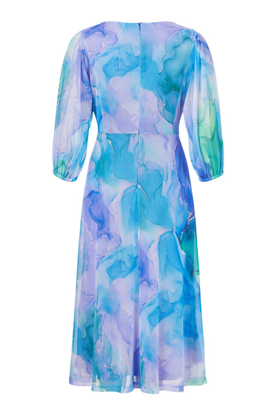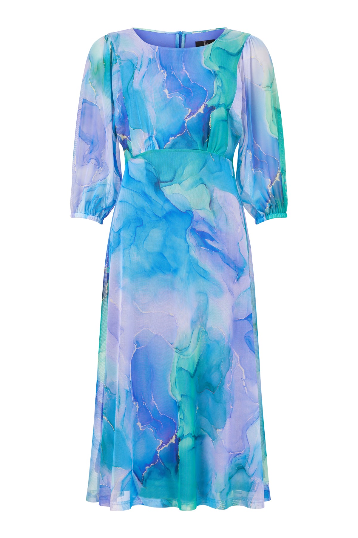 Tia - Jalen, glæslegur kjóll í bláum tónum. Kjóllinn er með rúnað hálsmál, kvartermar með teygju neðst, áfastur undirkjóll og rennilás að aftan. Tilvalinn fyrir brúðkaup eða önnur hátíðleg tilefni. Þessi kjóll er búinn til úr þægilegri blöndu af polyester og elastine og tryggir bæði stíl og þægindi allan daginn.