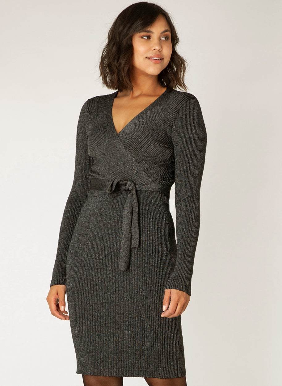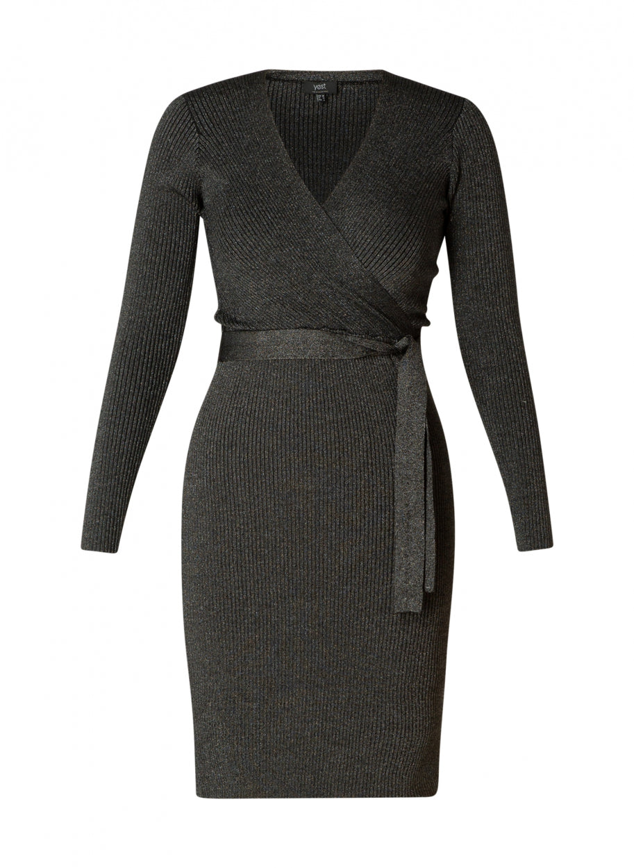 Yest - Chaimae flottur og sparilegur wrap kjóll með silfurþráðum. Rifflað efni, langar ermar og V-hálsmál.