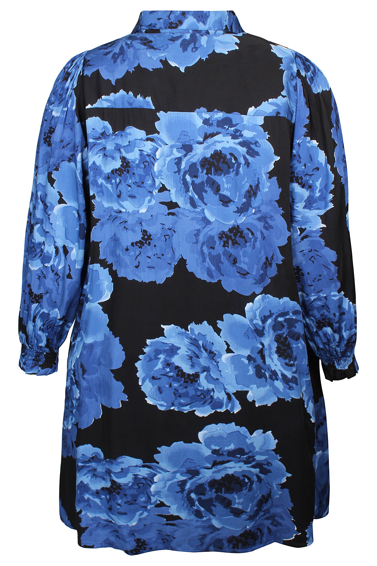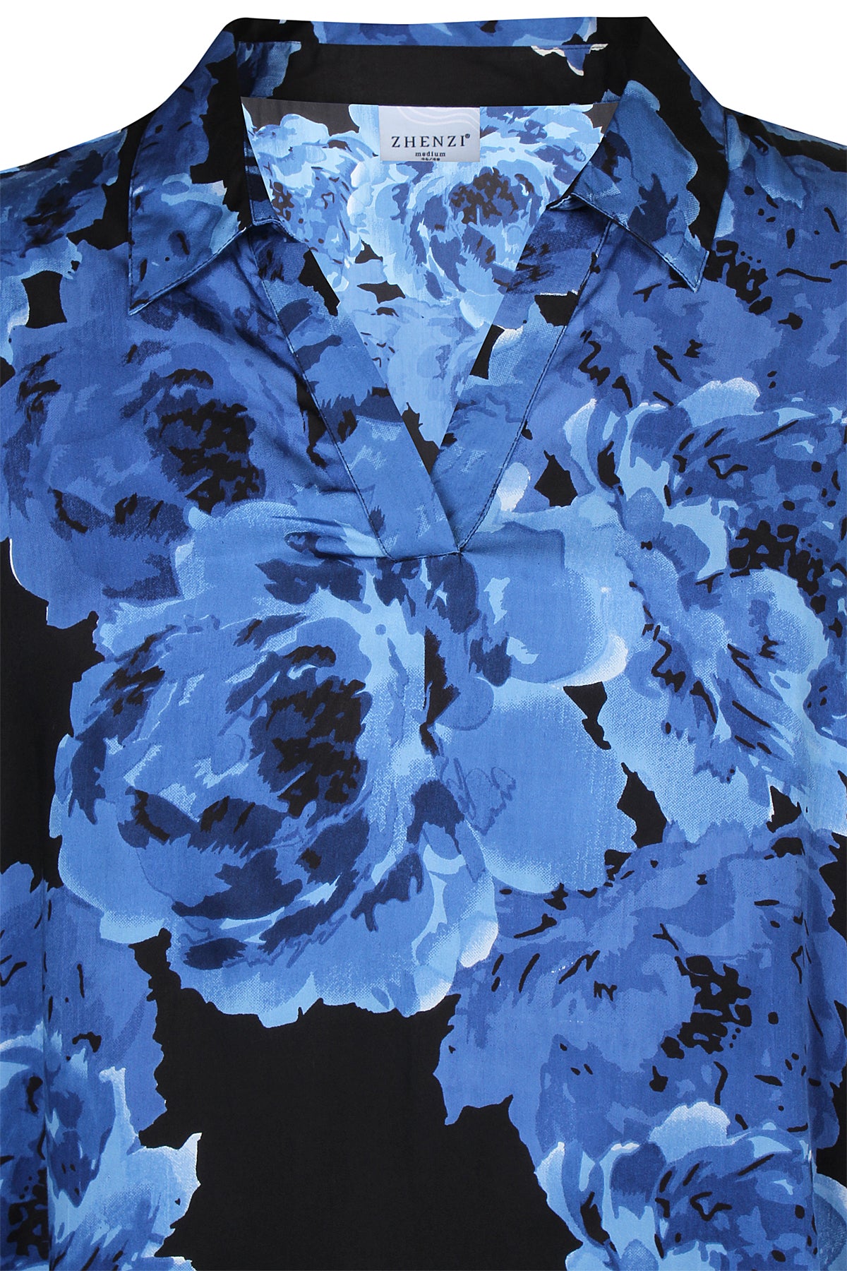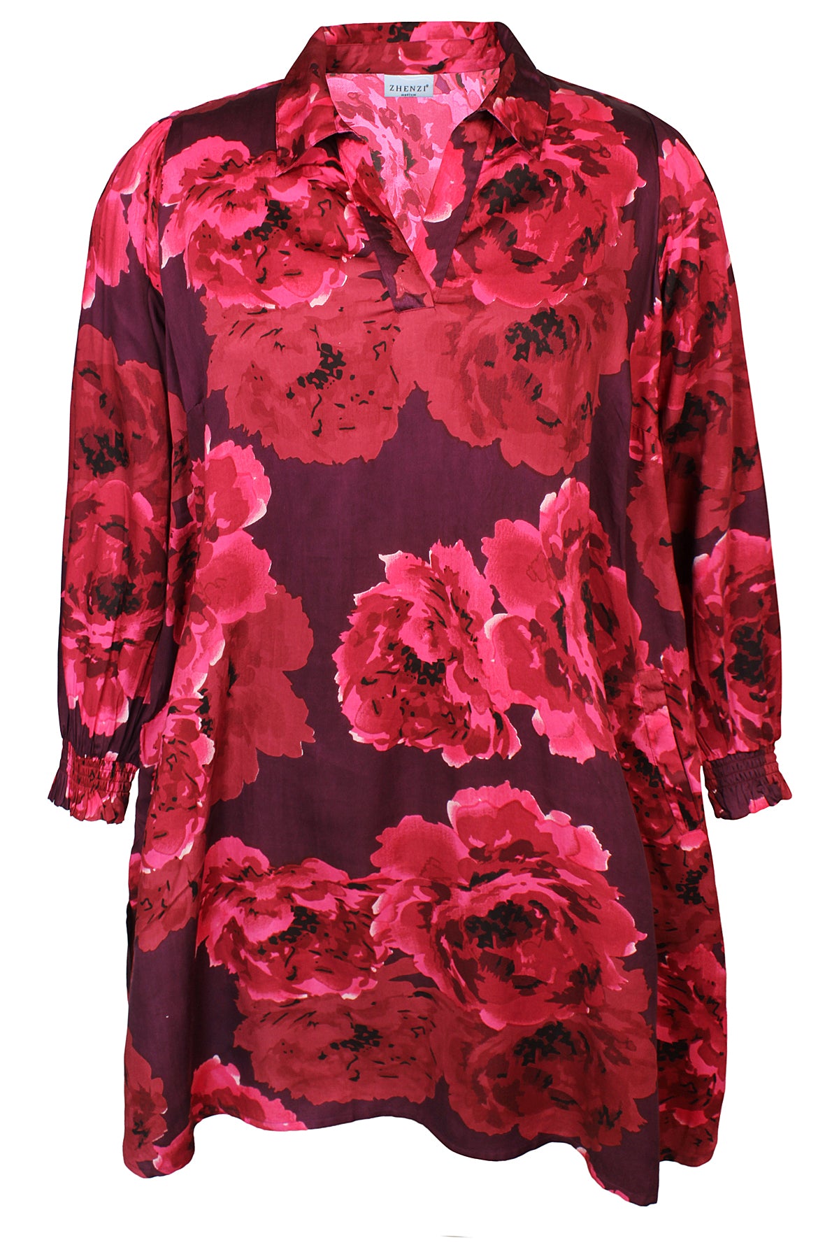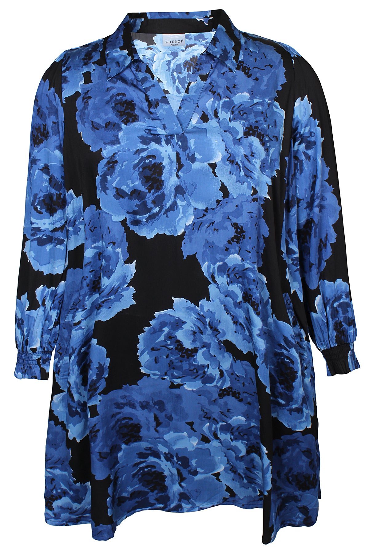 Zhenzi - Skye fallegur og sparilegur kjóll með mynstri. Kvartermar með teygju neðst, skyrtukragi og V-hálsmál, góðir vasar að framan, rúnaður að neðan. Passar vel hversdags og spari.