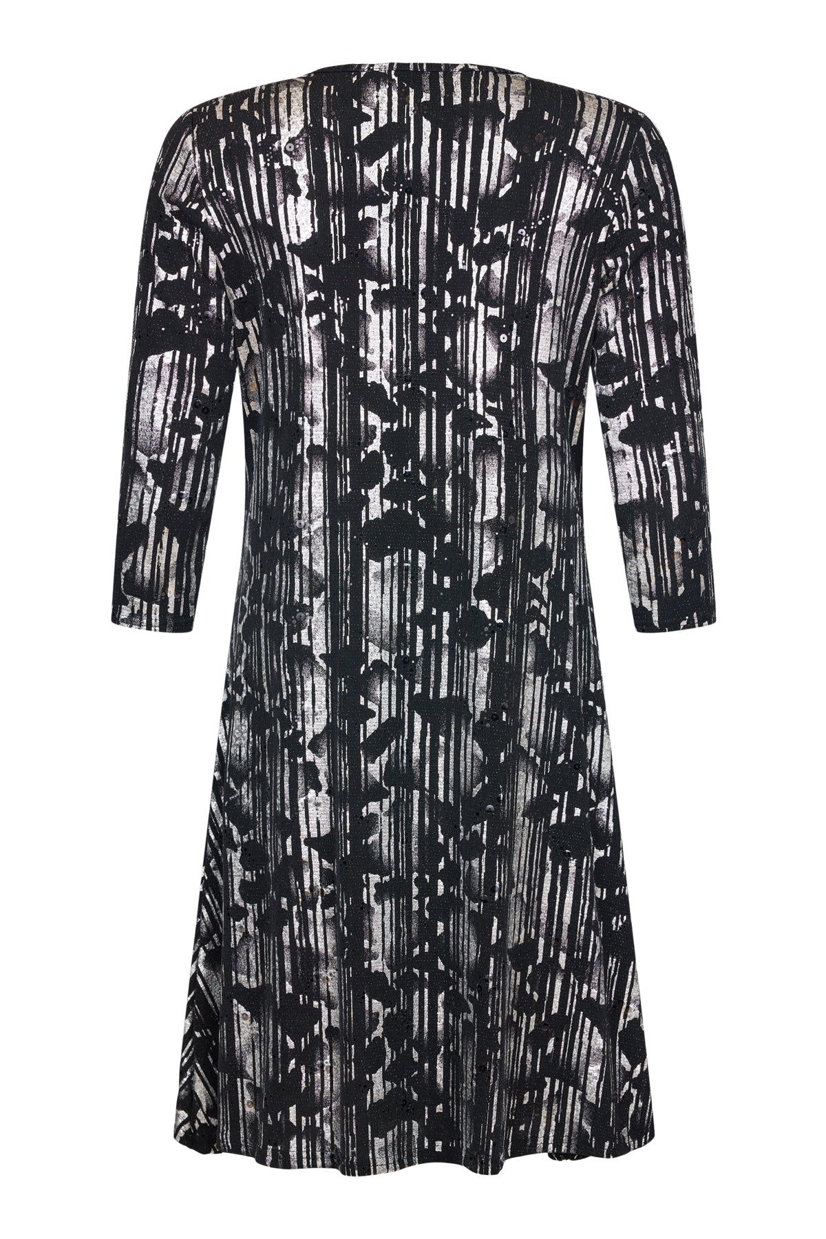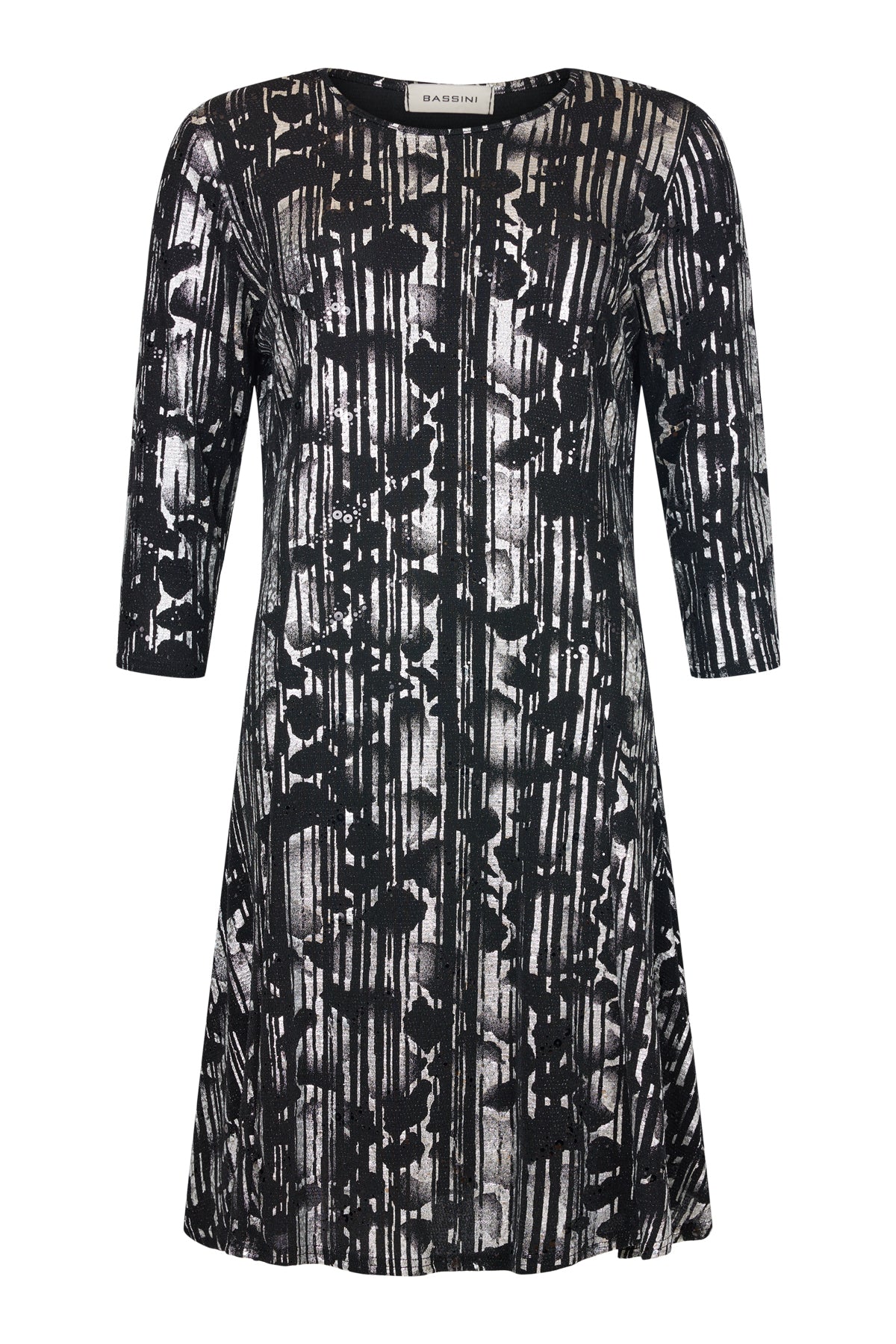 Bassini - Raven fallegur og sparilegur kjóll með flottu mynstri. Rúnað hálsmál, kvartermar og A-snið. Flottur einn og sér og undir fínan jakka eða opna peysu.