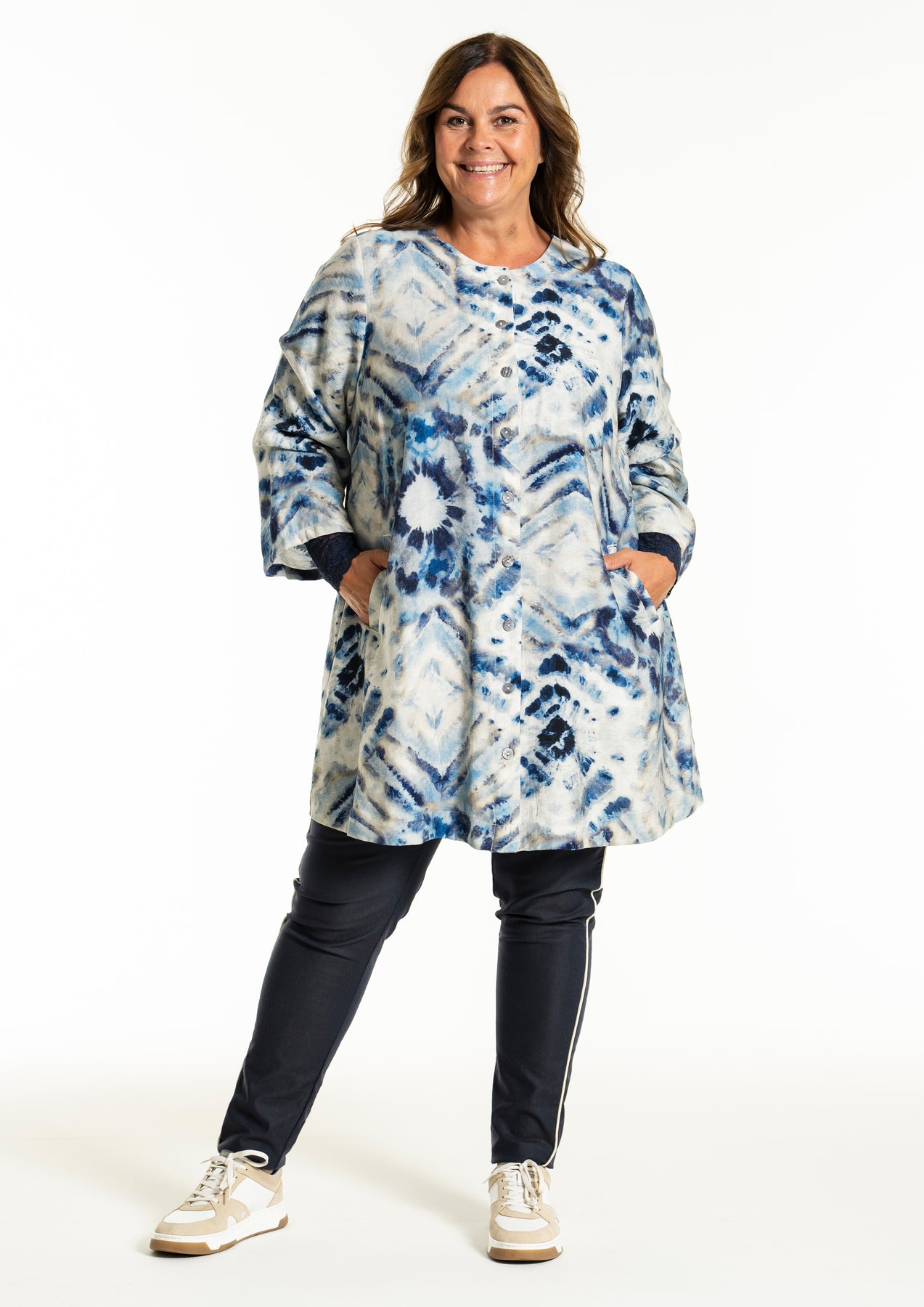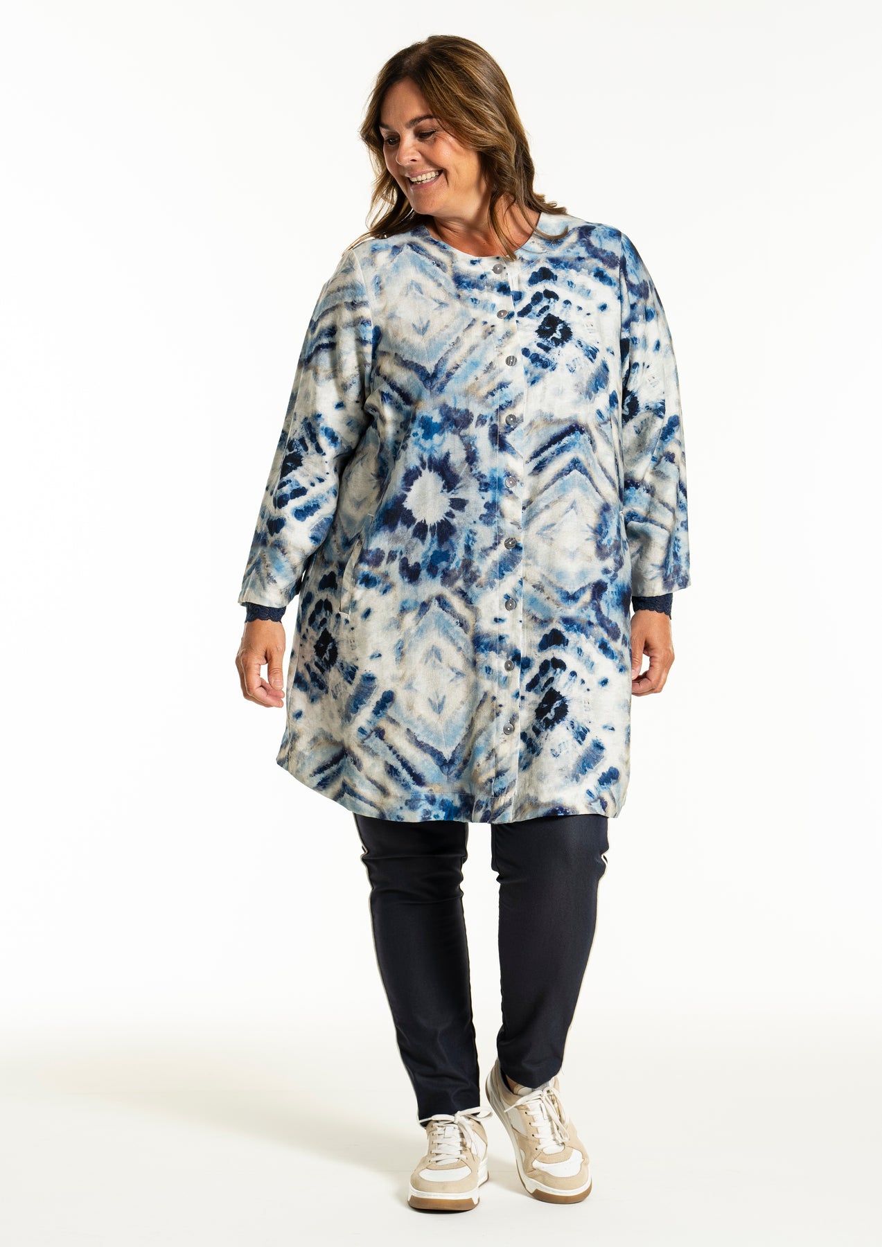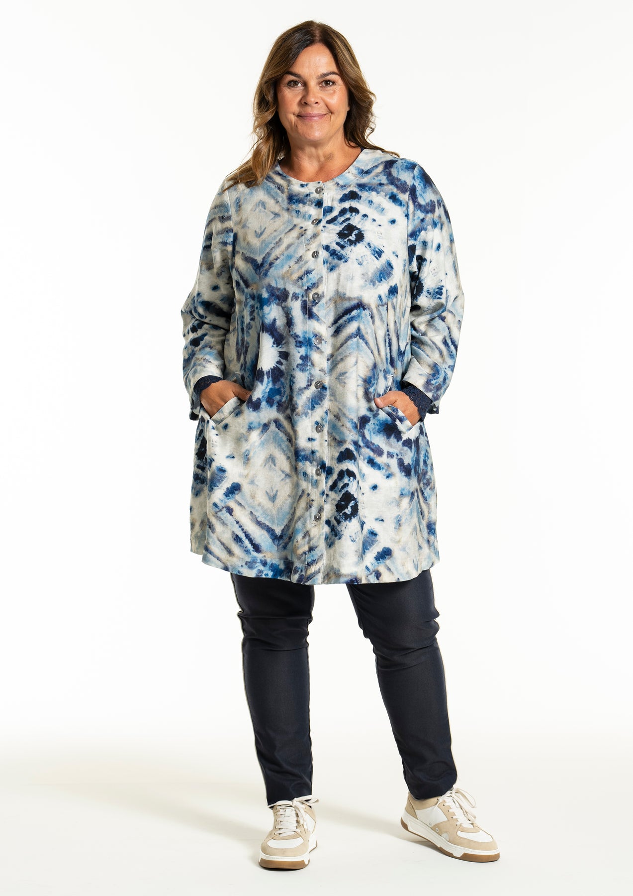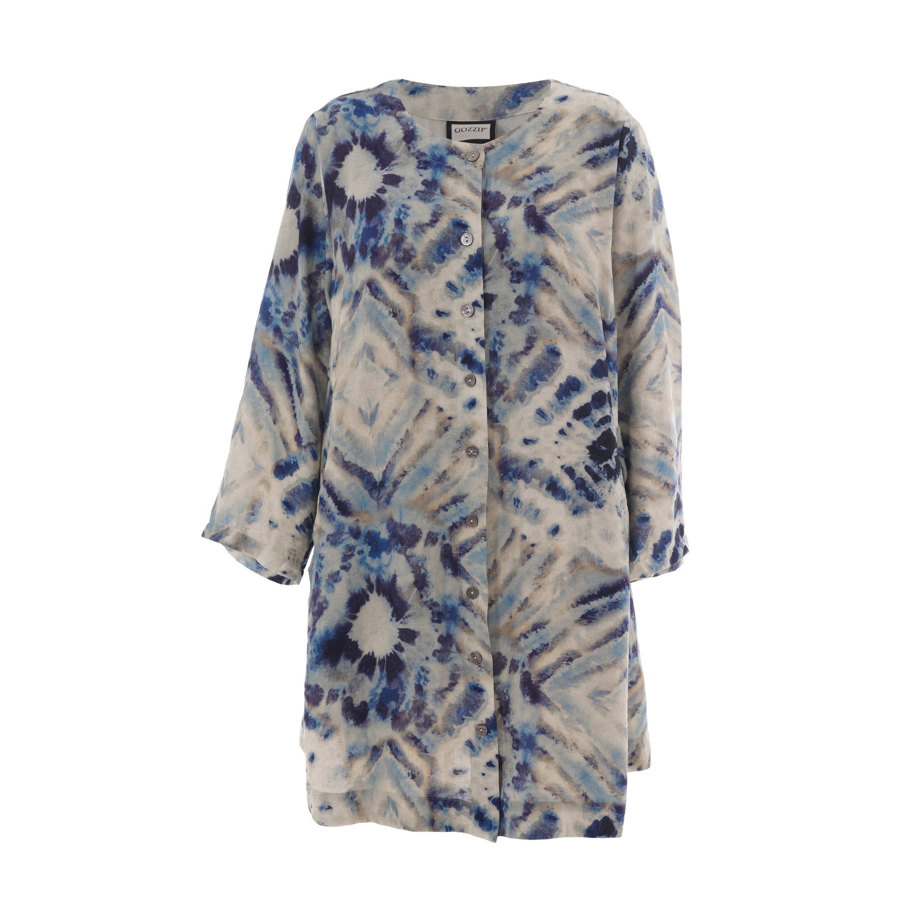 Gozzip - Jana flott og þægileg tunika með blátóna mynstri. Hneppt að framan, góðir vasar að framan, rúnað hálsmál, langar og víðar ermar. Passar vel hvar sem er, bæði hversdags og spari.