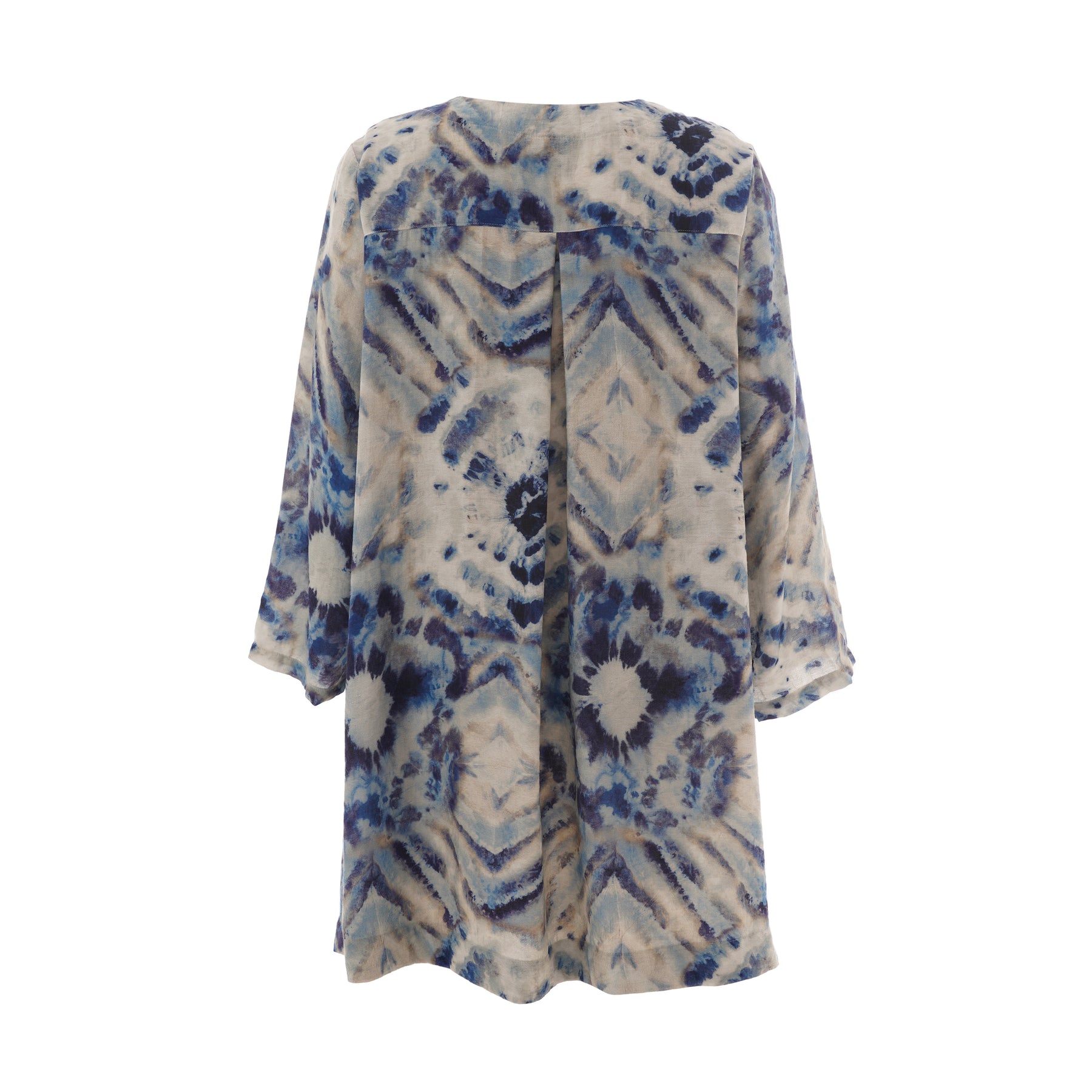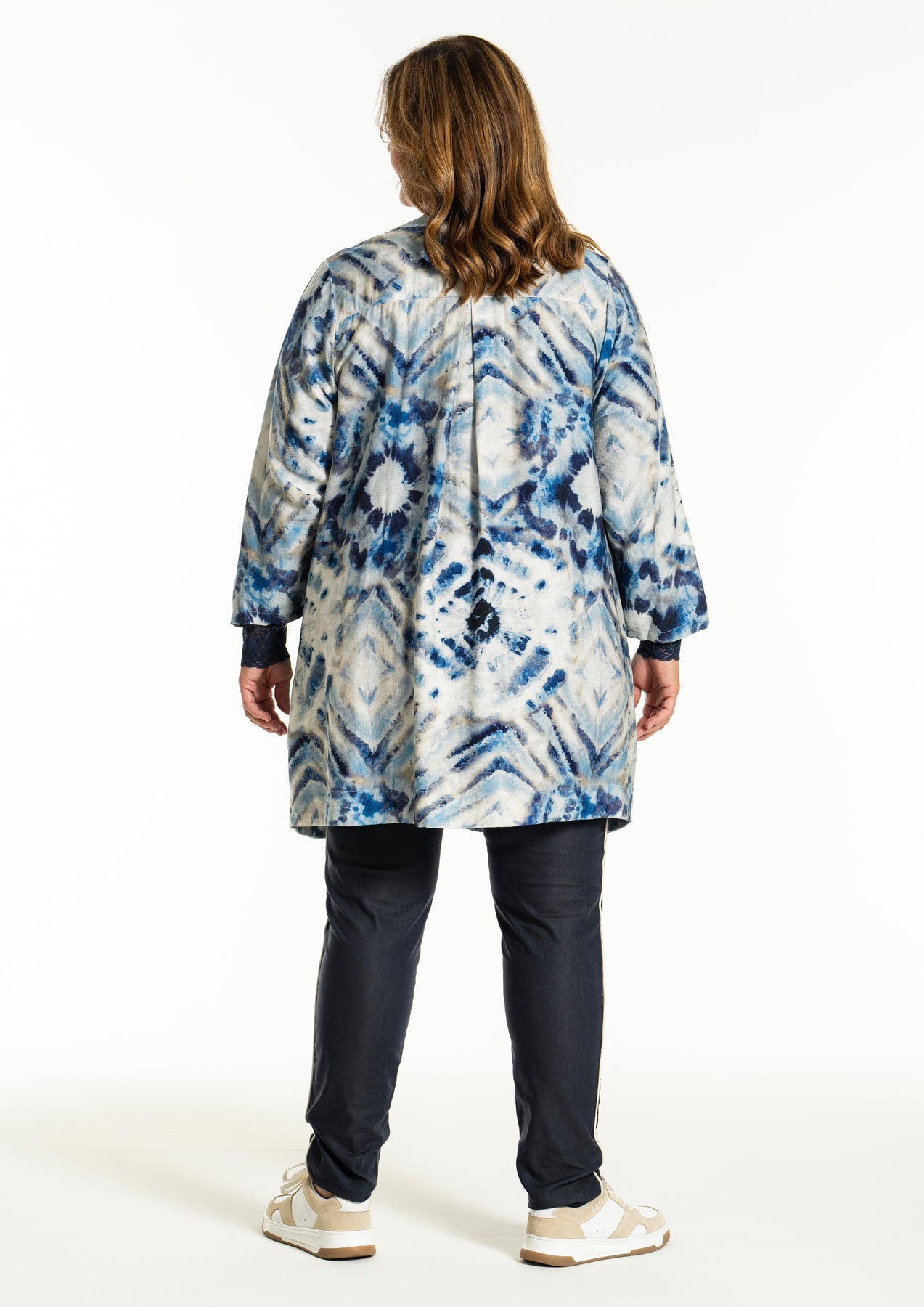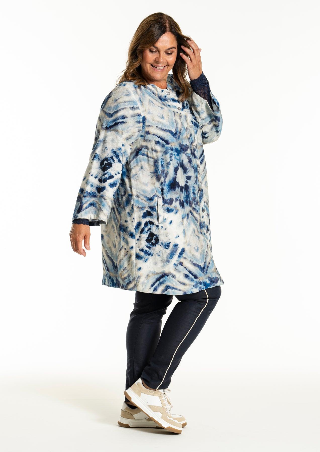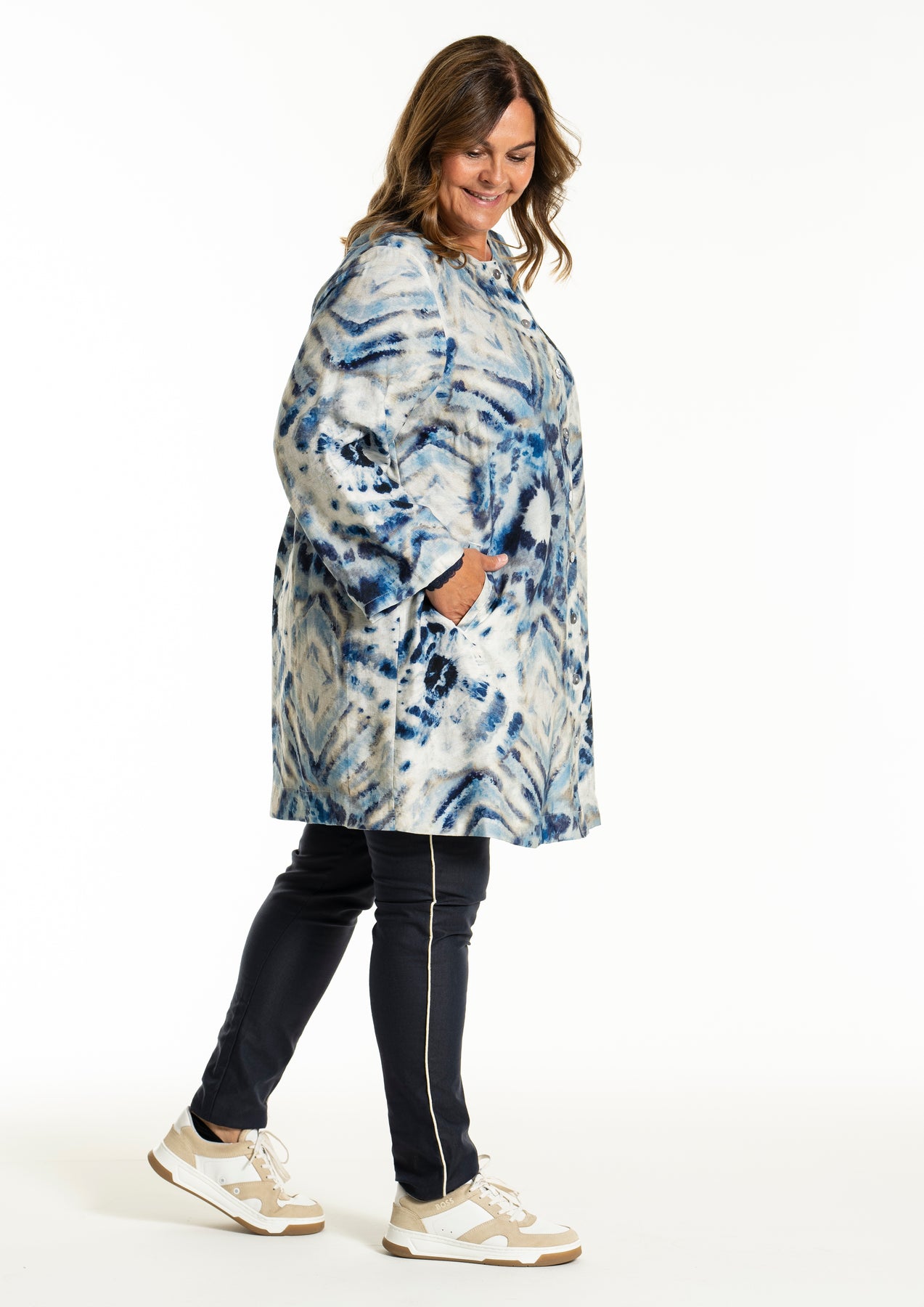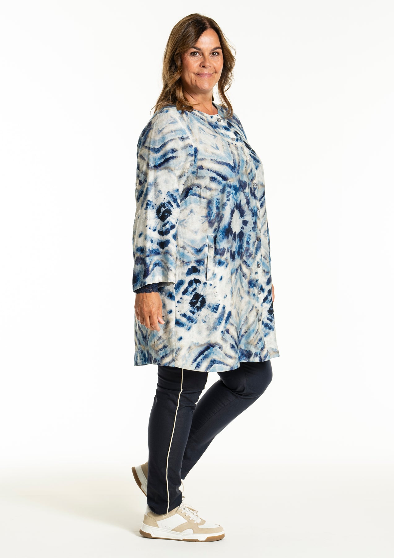 Gozzip - Jana flott og þægileg tunika með blátóna mynstri. Hneppt að framan, góðir vasar að framan, rúnað hálsmál, langar og víðar ermar. Passar vel hvar sem er, bæði hversdags og spari.