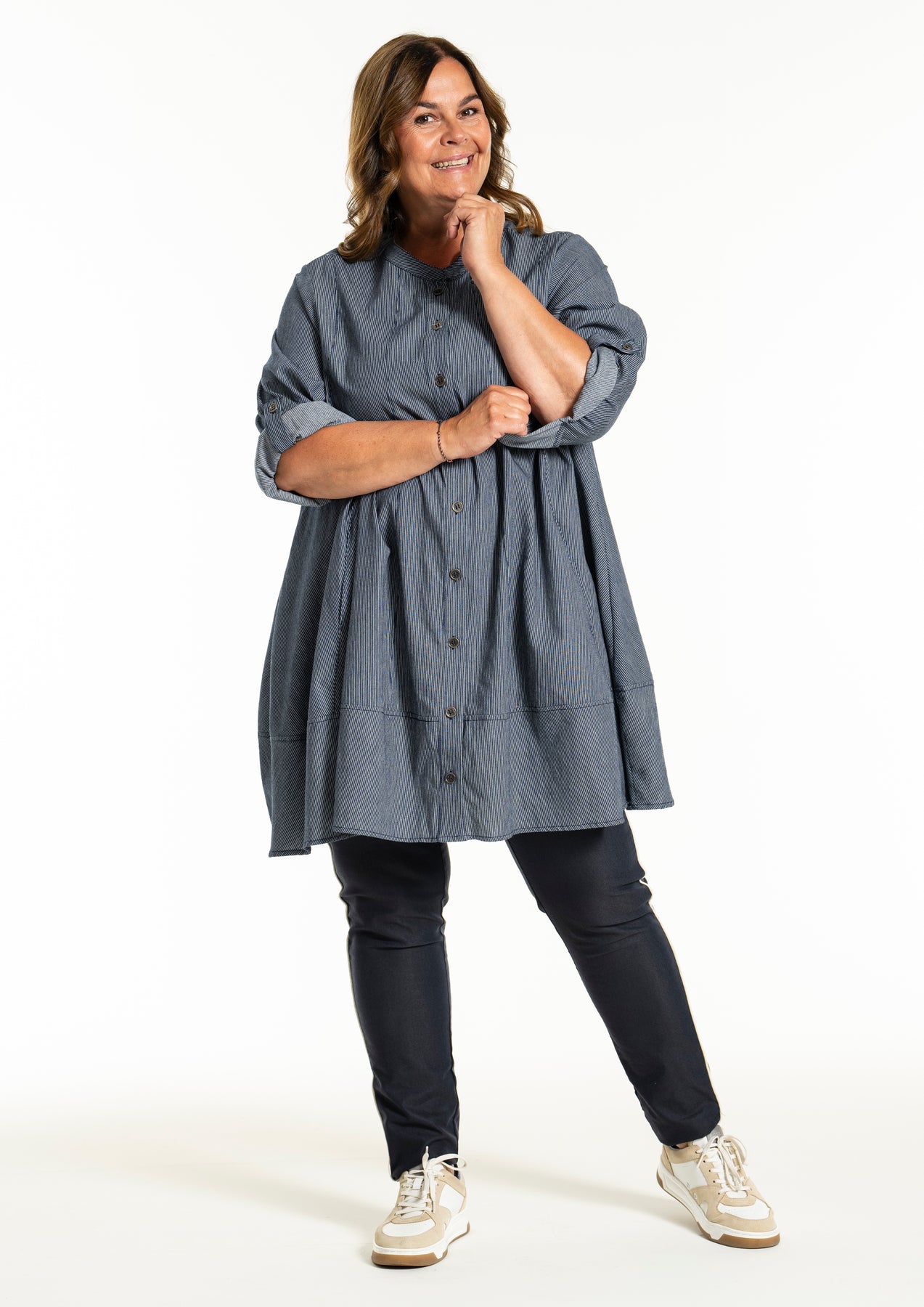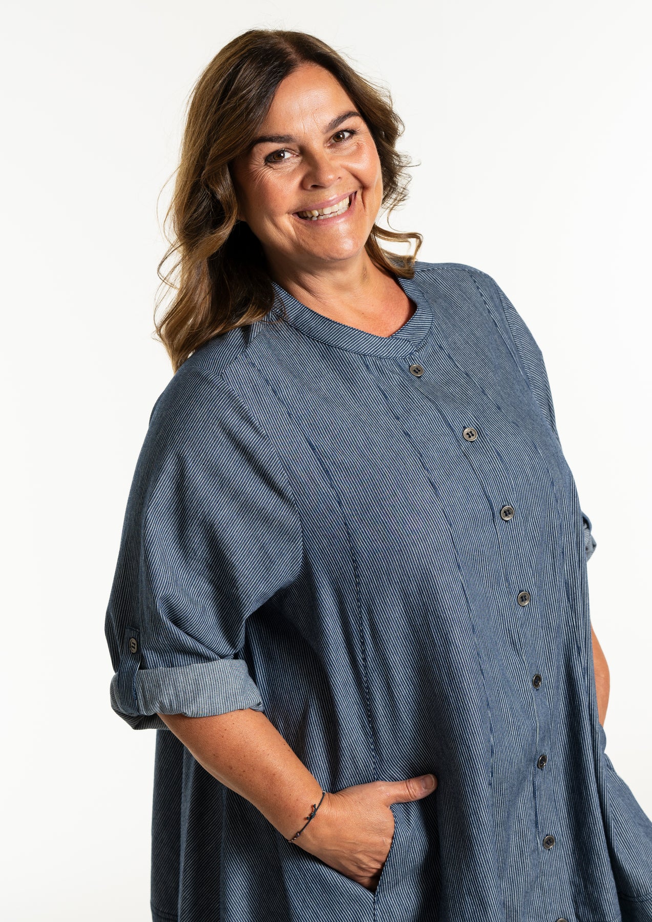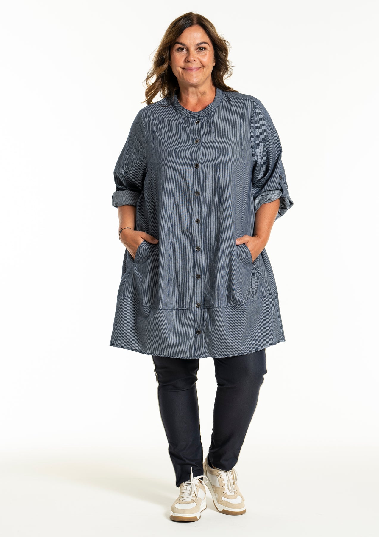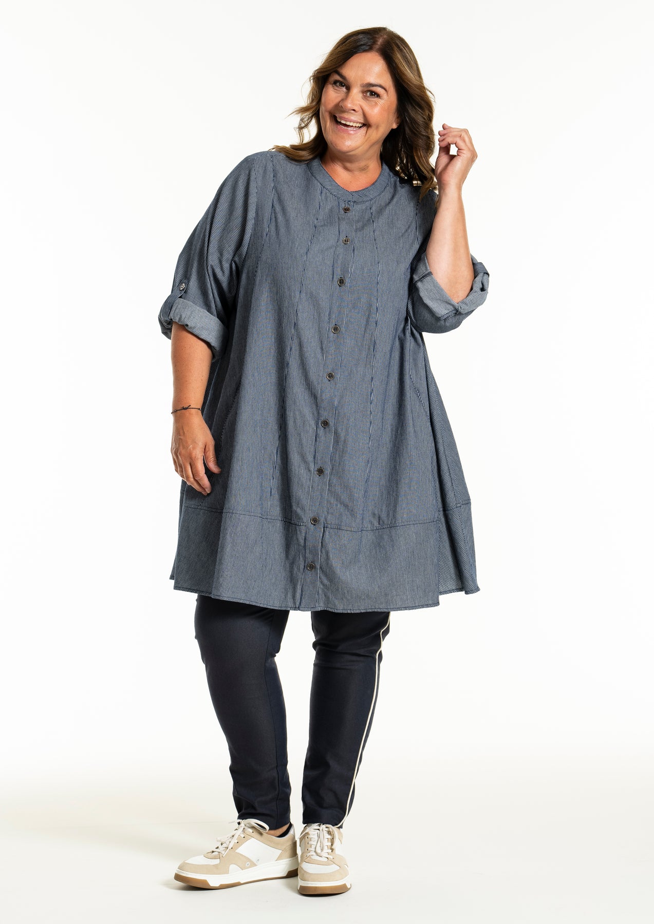 Gozzip - Jytta flott og þægileg teinótt tunika með vösum. Hneppt að framan, kínakragi, langar ermar með tölu á ermum sem er hægt að festa upp. Passar vel hvar sem er, bæði hversdags og spari.