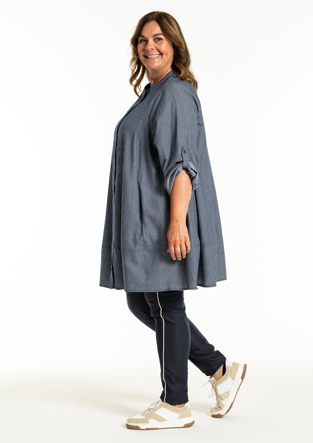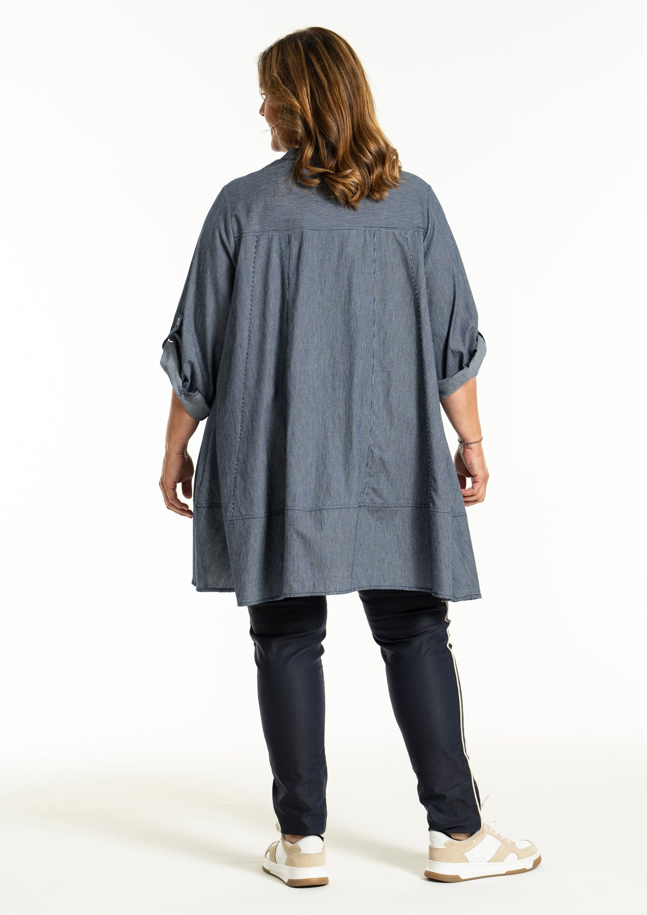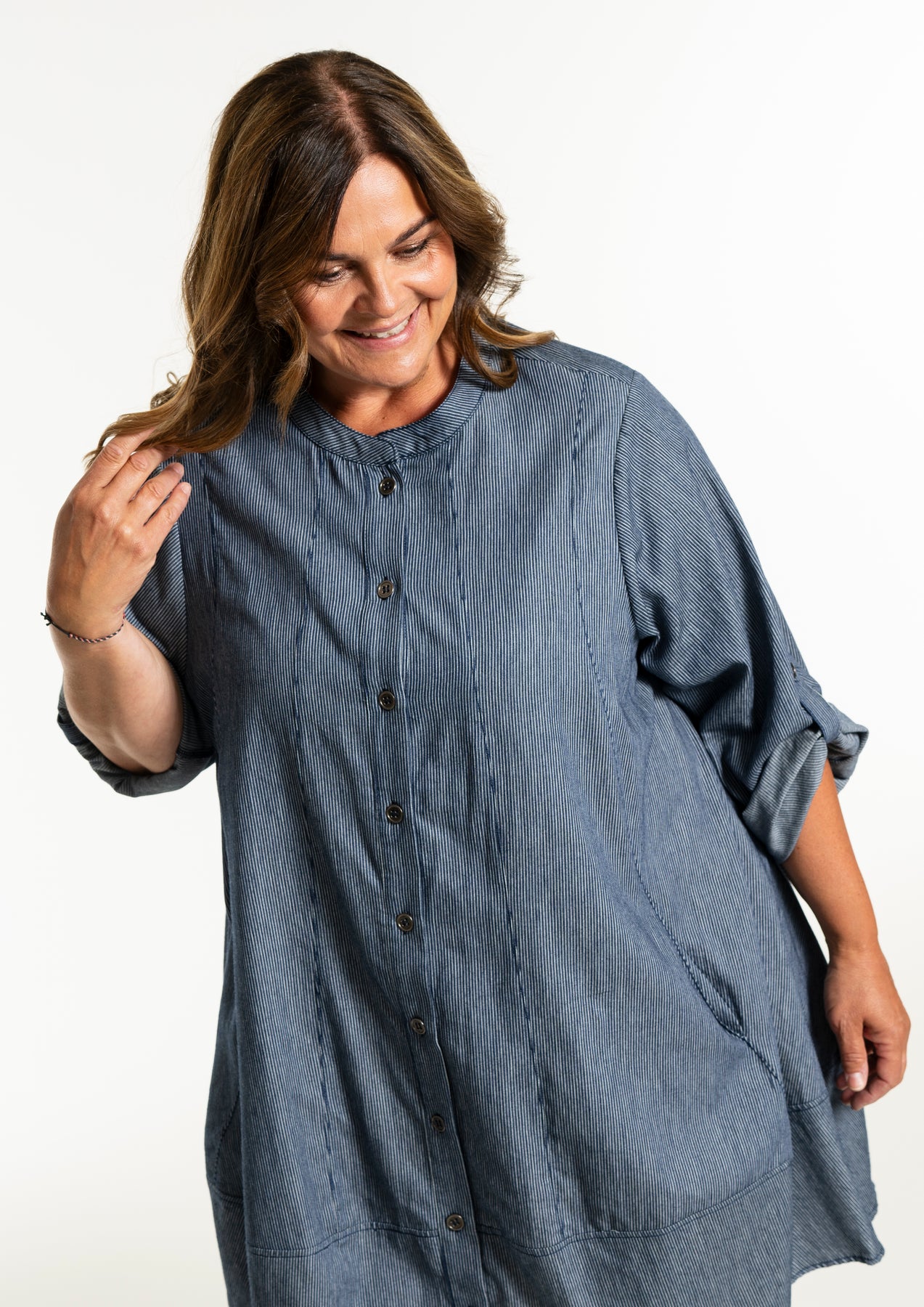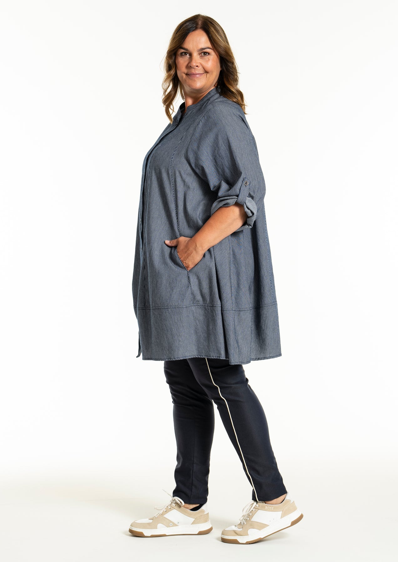 Gozzip - Jytta flott og þægileg teinótt tunika með vösum. Hneppt að framan, kínakragi, langar ermar með tölu á ermum sem er hægt að festa upp. Passar vel hvar sem er, bæði hversdags og spari.