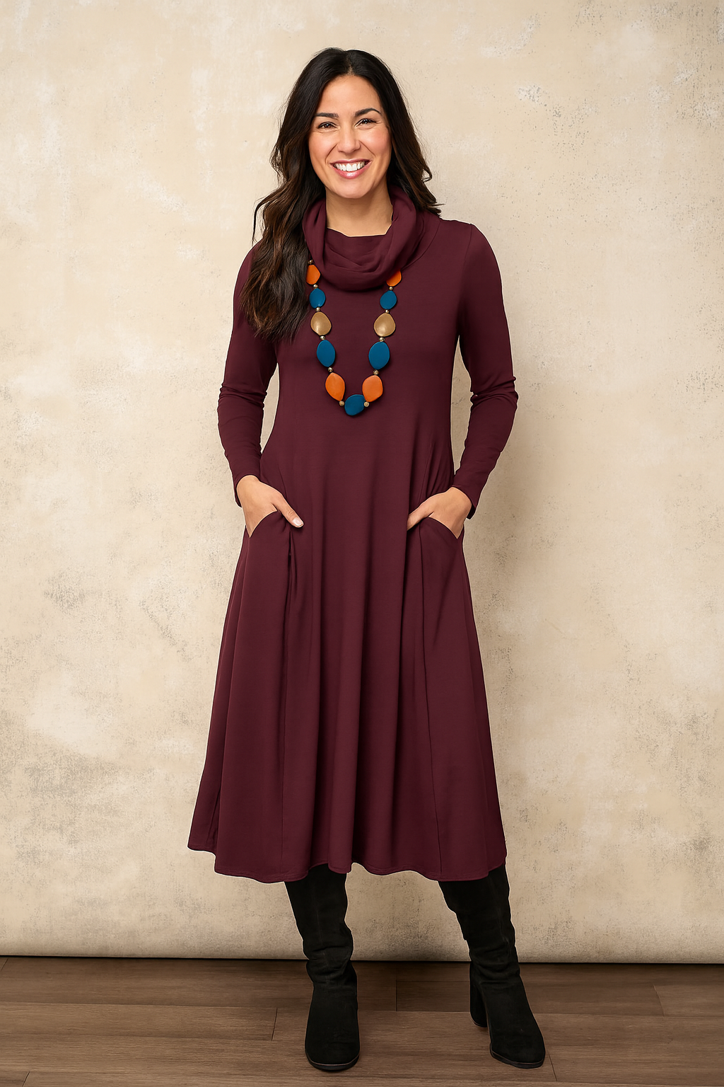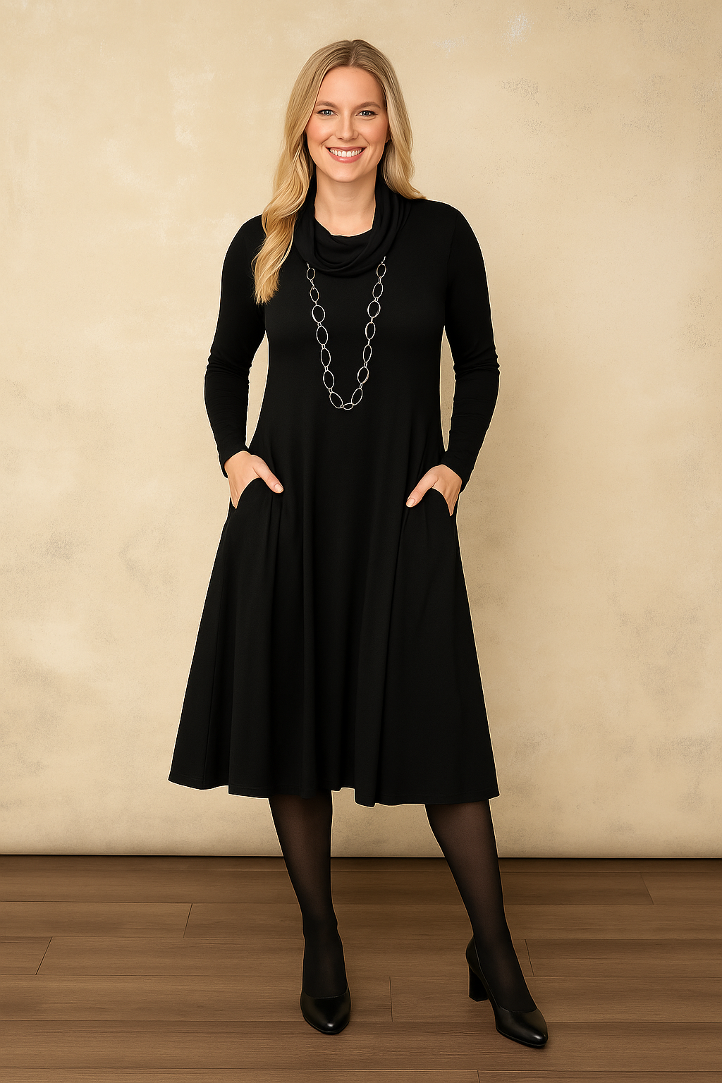 Noen - Brittany langermakjóll með rúllukraga og góðum vösum. Flottur og vandaður kjóll úr þéttu og endingargóðu viskose efni sem fellur vel. Kjóll sem passar vel hvort sem er hversdags eða spari.