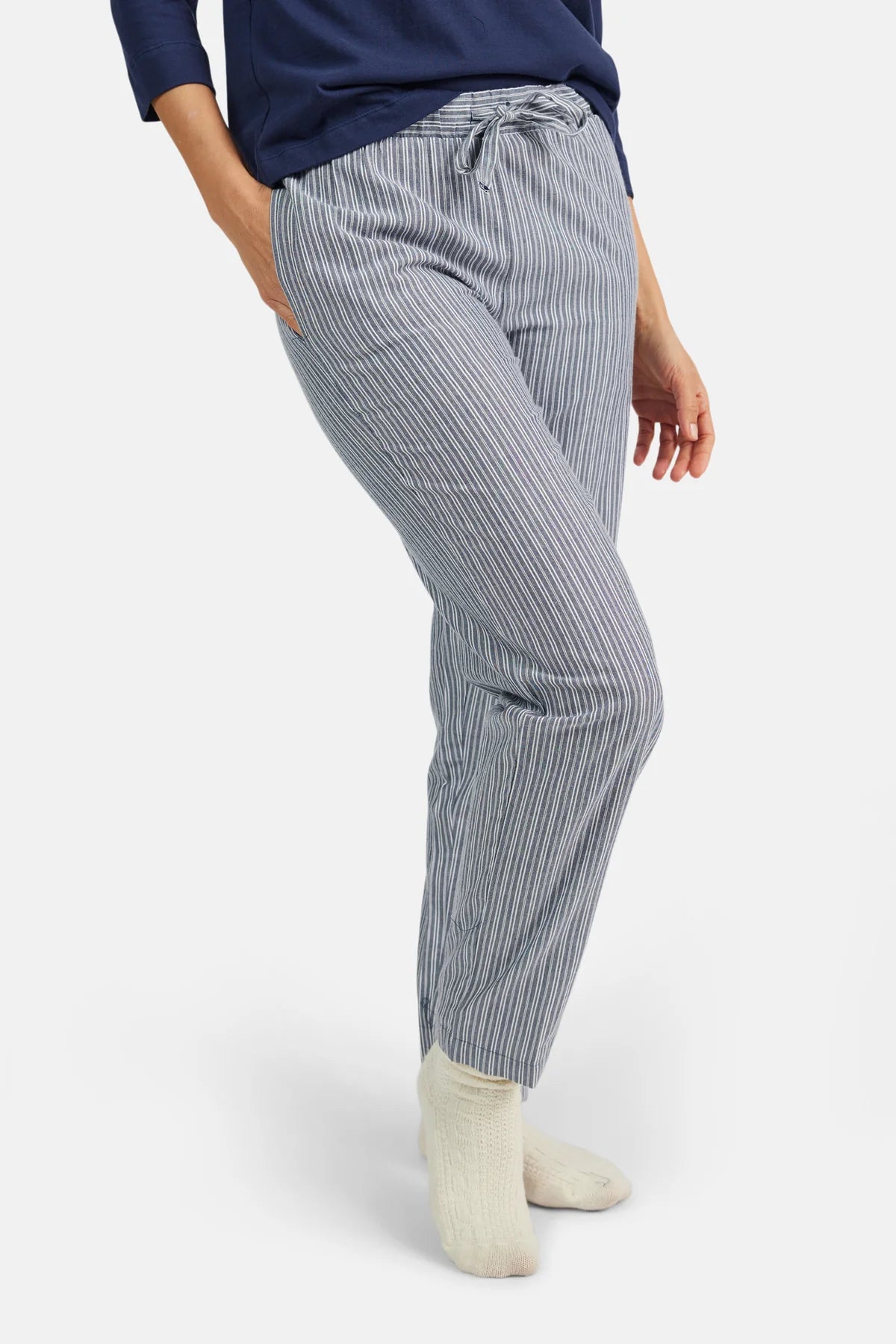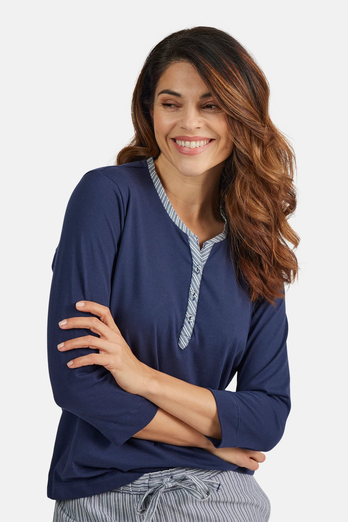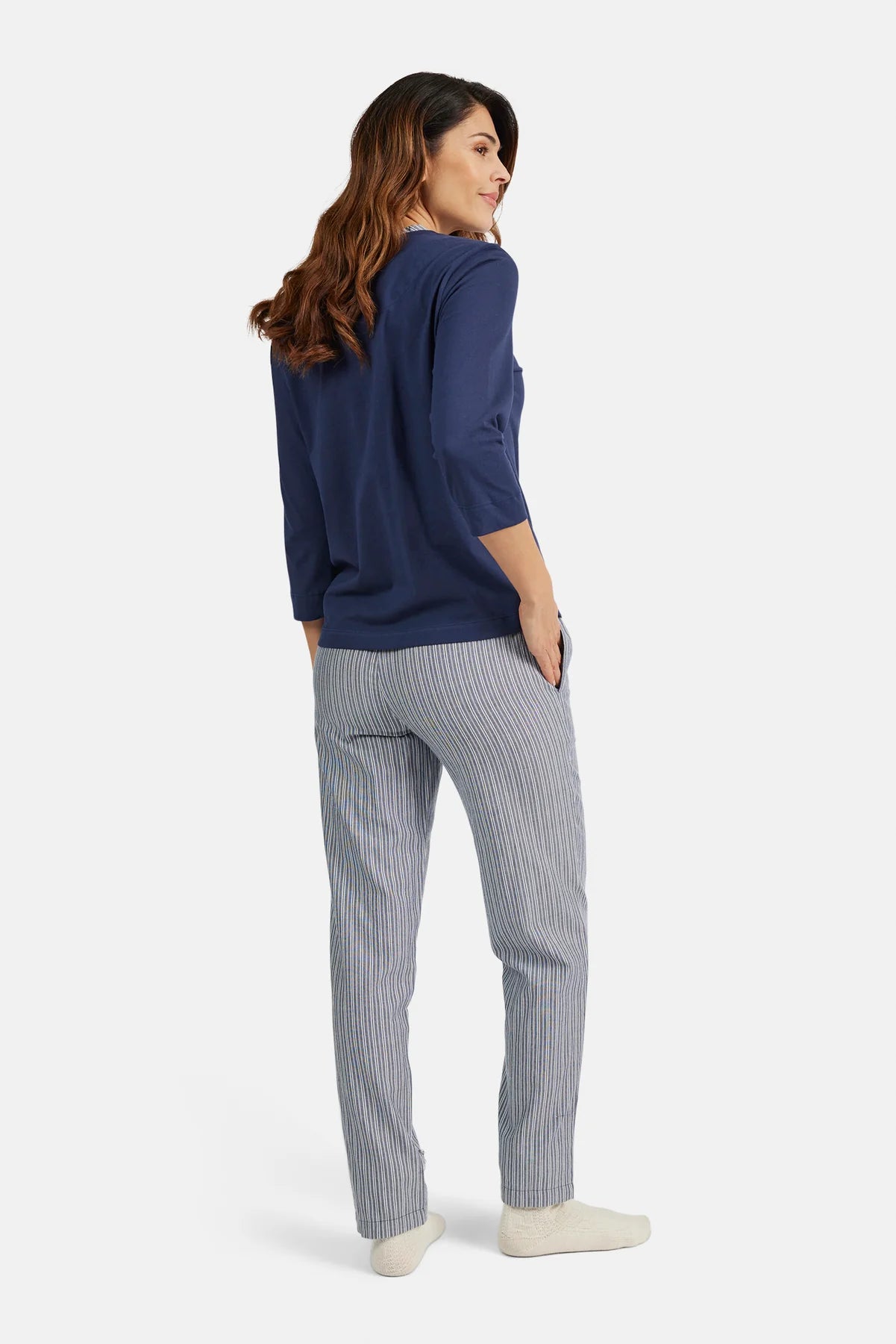 Brandtex - Nora mjúkt og notalegt náttfata sett. Röndóttar buxur með vösum og teygju í mitti með böndum. Einlitur kvartermabolur með rúnuðu hálsmáli og tölum.