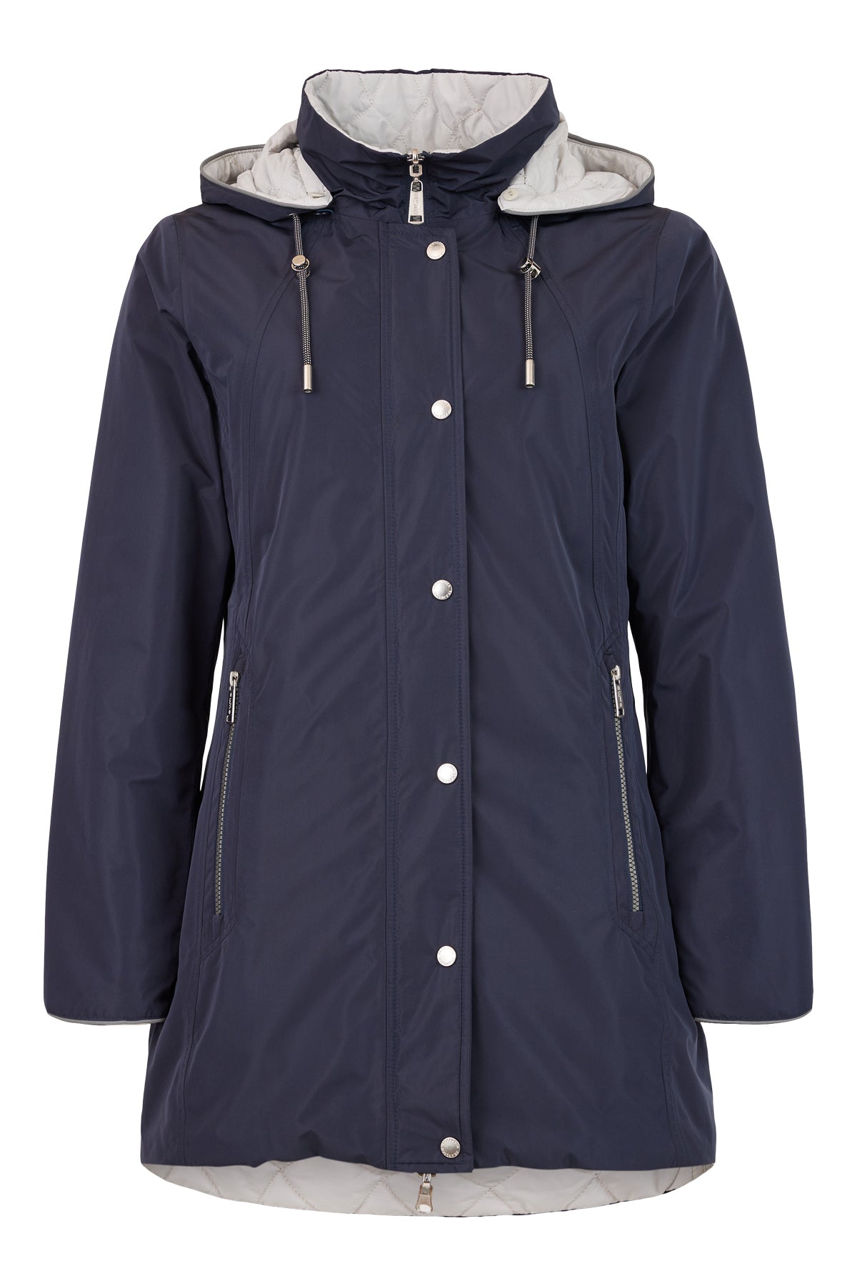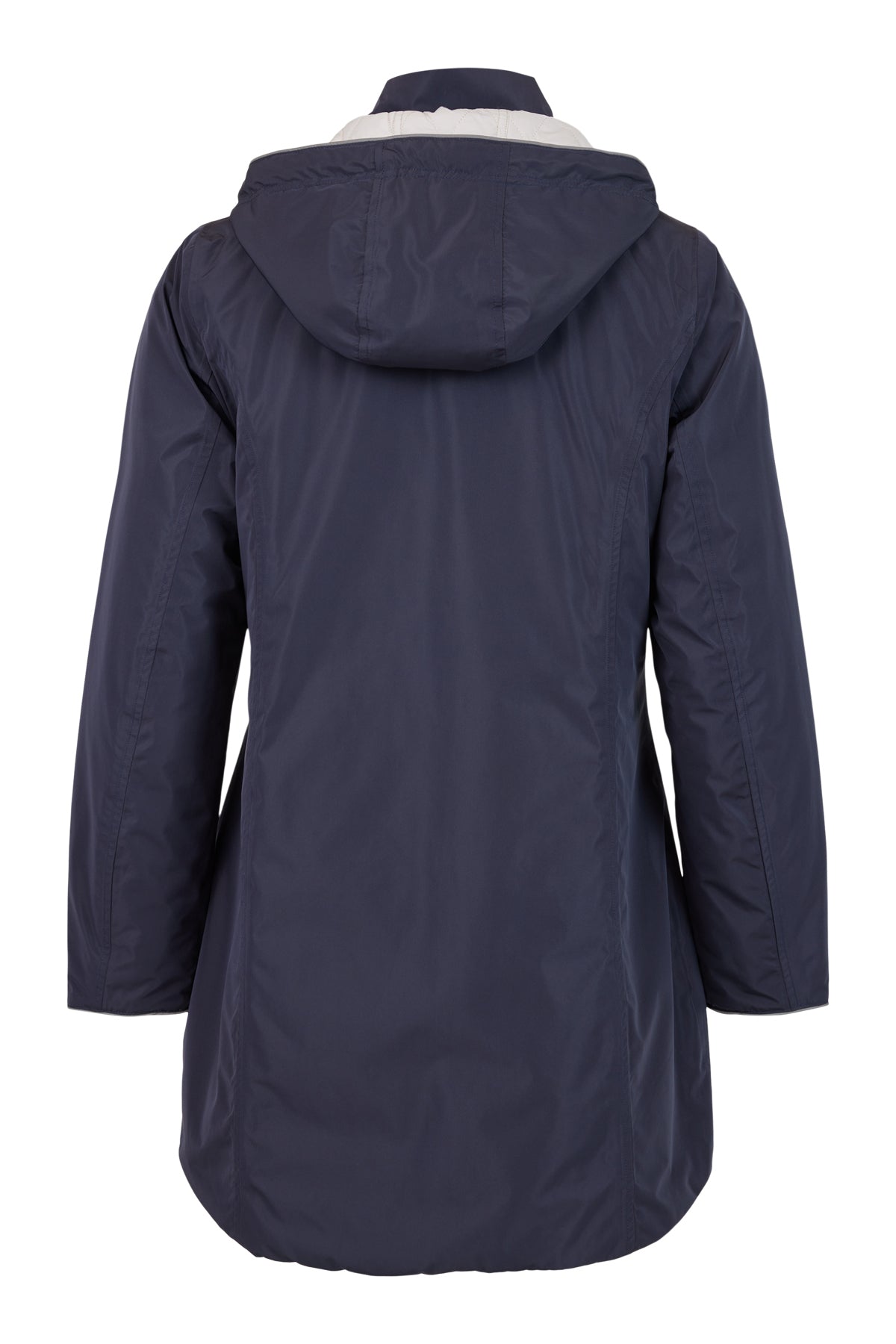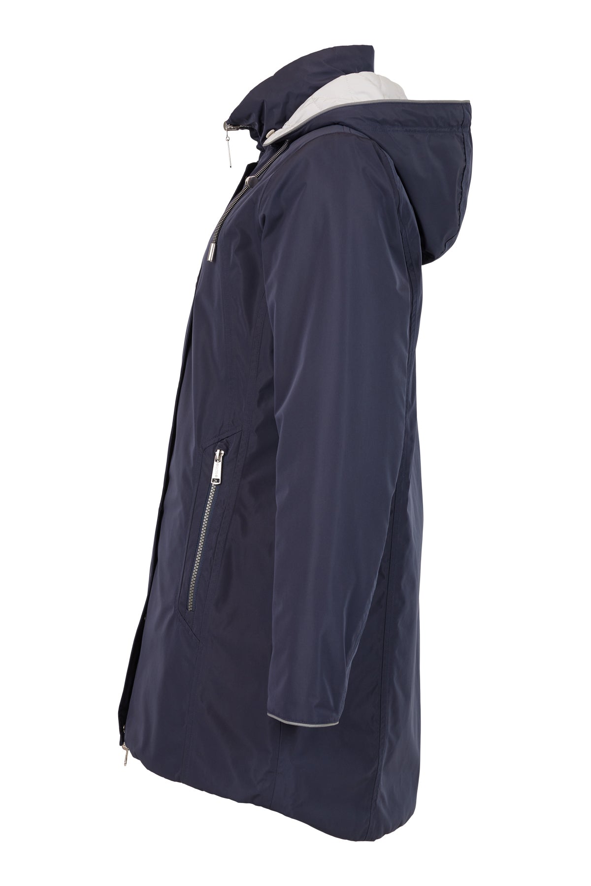Frandsen - Samantha jakki vendingur. Jakkinn er renndur og hnepptur, hetta með böndum, hægt er að taka hana af, loftgöt í handarkrikum, renndir vasar að framan. Efni sem andar, vatnshelt upp að 3000 mm, endurskin fremst á ermum og á hettu. Dökkblár og sléttur á einni hlið, tíglastunginn og ljósgrár á hinni hliðinni.
