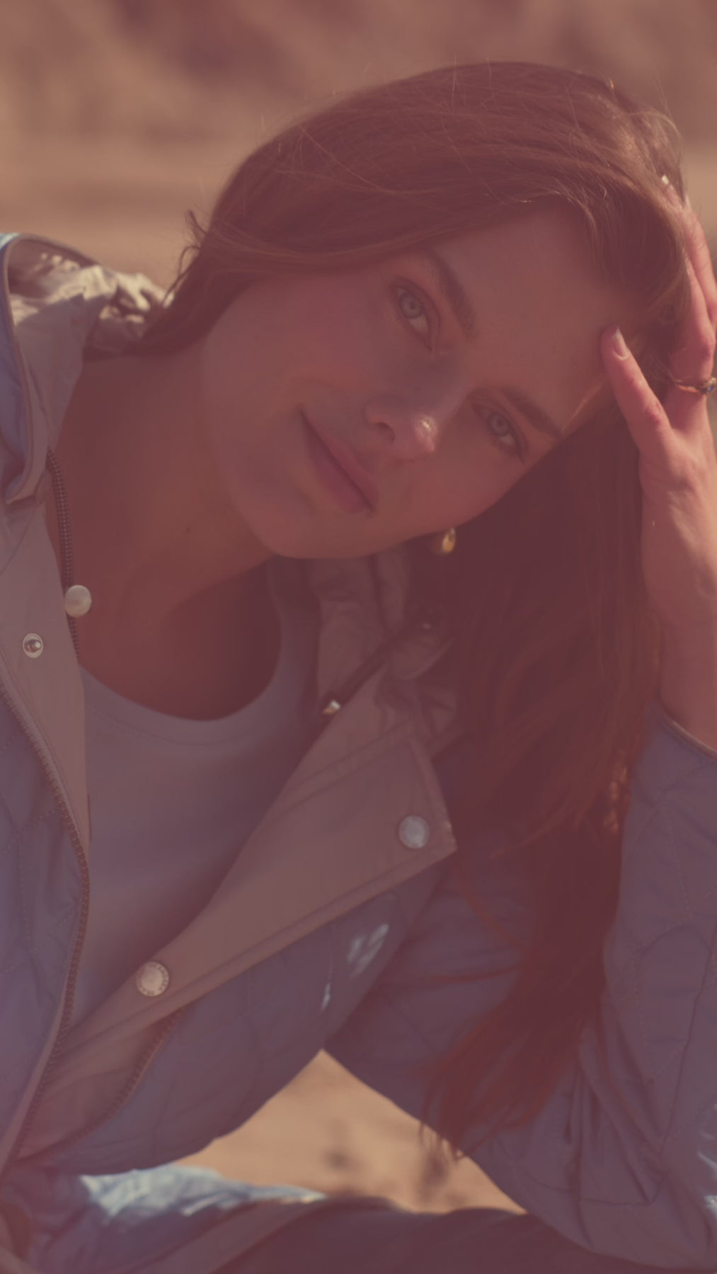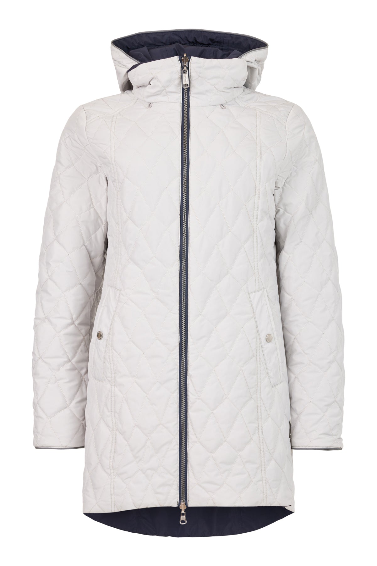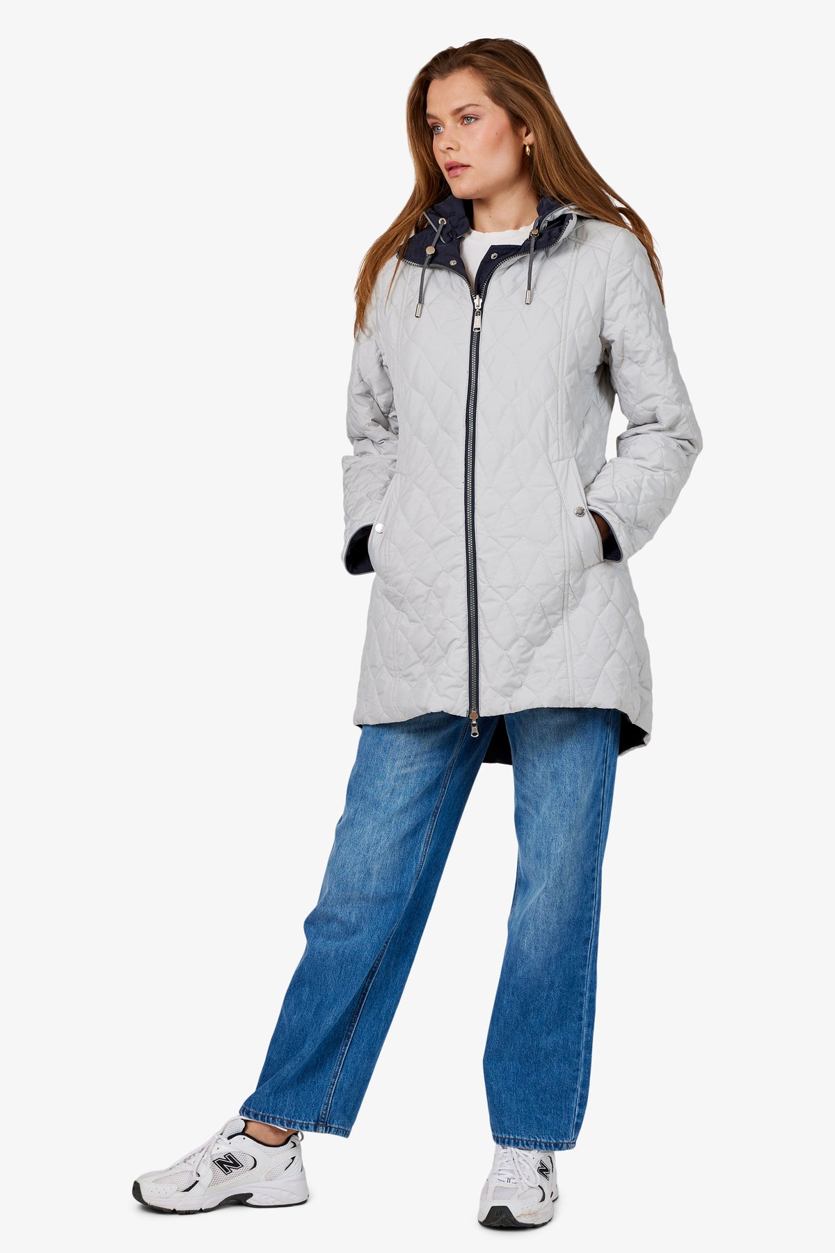 Frandsen - Samantha jakki vendingur. Jakkinn er renndur og hnepptur, hetta með böndum, hægt er að taka hana af, loftgöt í handarkrikum, renndir vasar að framan. Efni sem andar, vatnshelt upp að 3000 mm, endurskin fremst á ermum og á hettu. Dökkblár og sléttur á einni hlið, tíglastunginn og ljósgrár á hinni hliðinni.