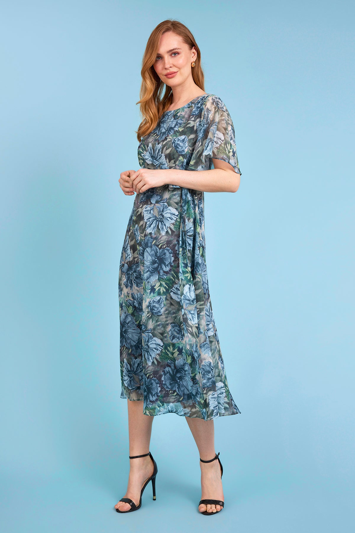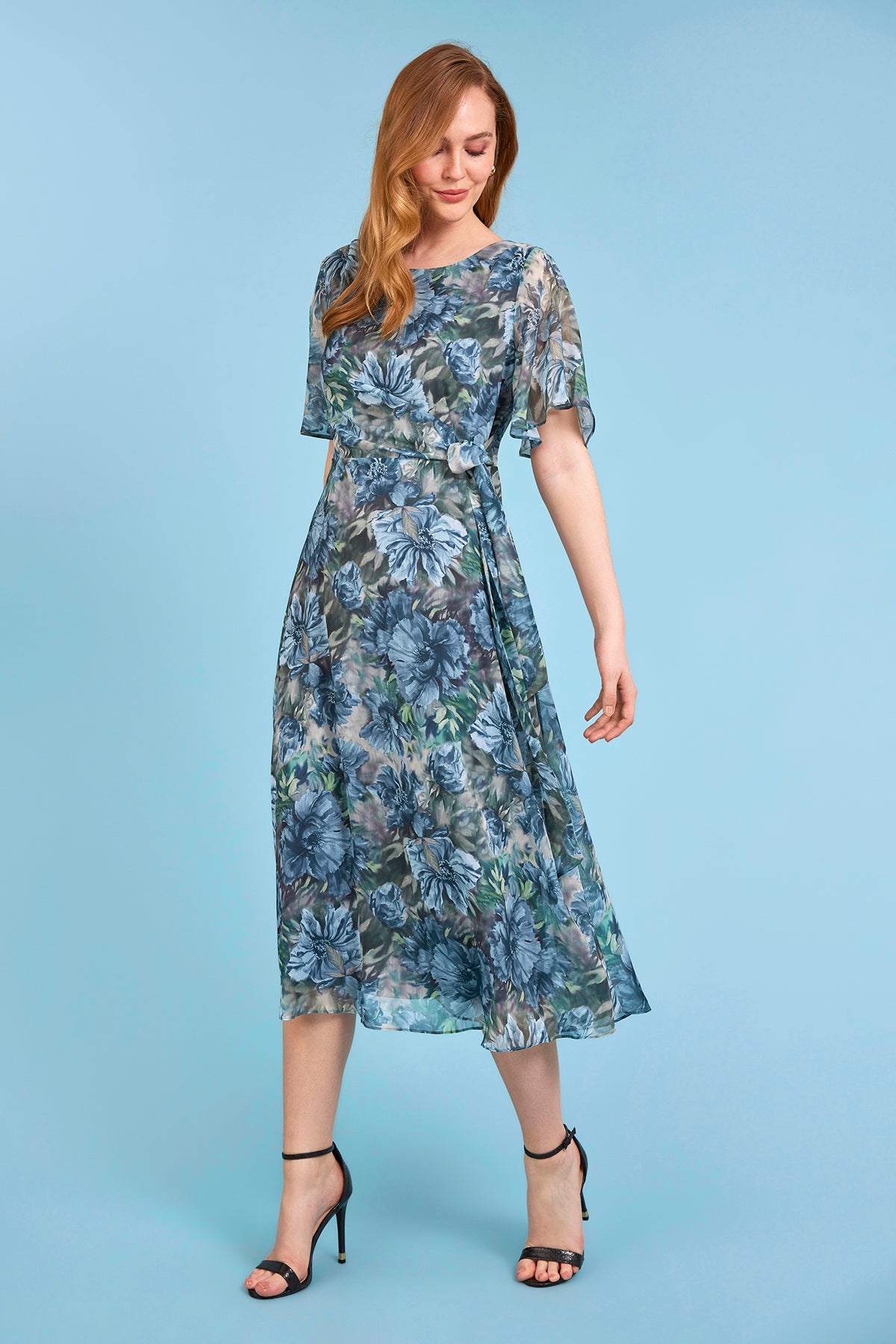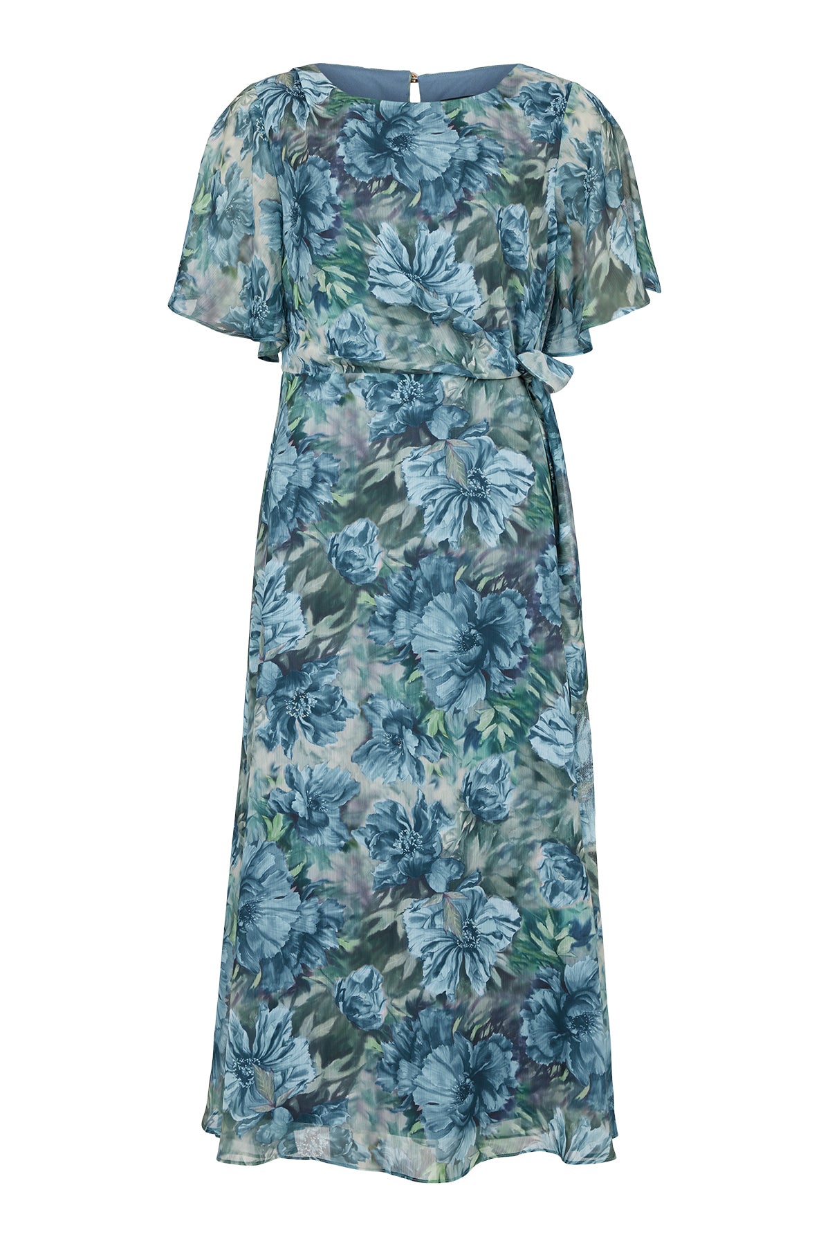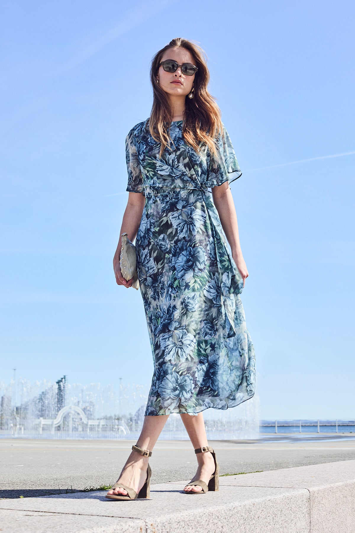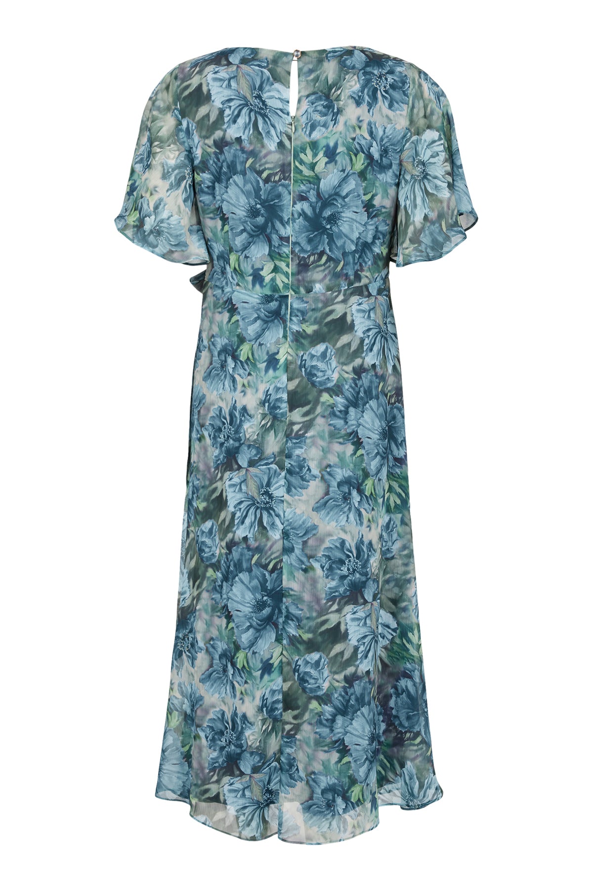 Molly Jo - Cade flottur og vandaður wrap sparikjóll með fallegu blómamynstri. Rúnað hálsmál, stuttar ermar, rennilás að aftan, keyhole op að aftan með tölu.