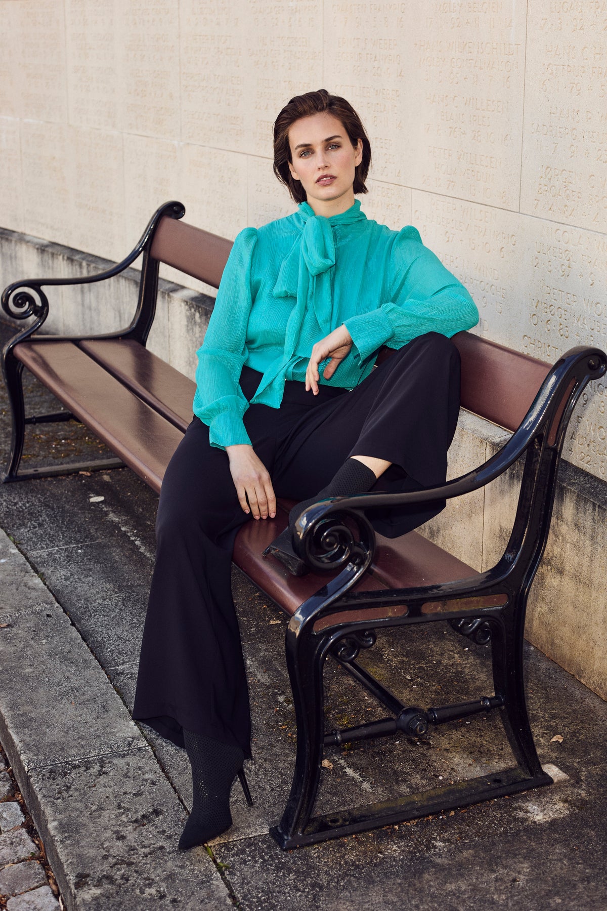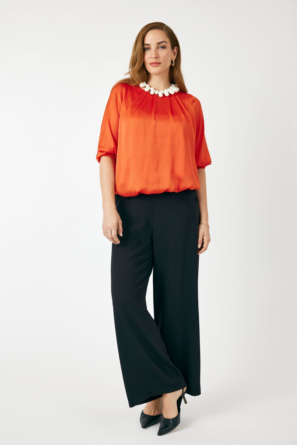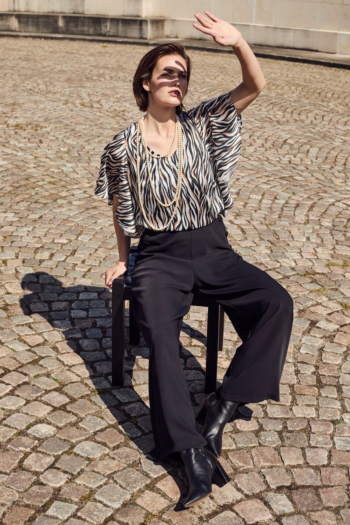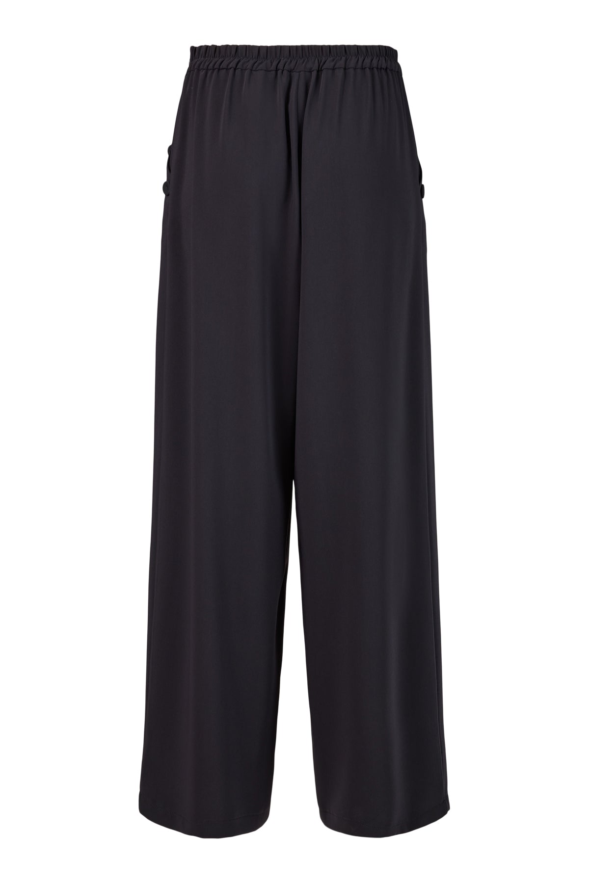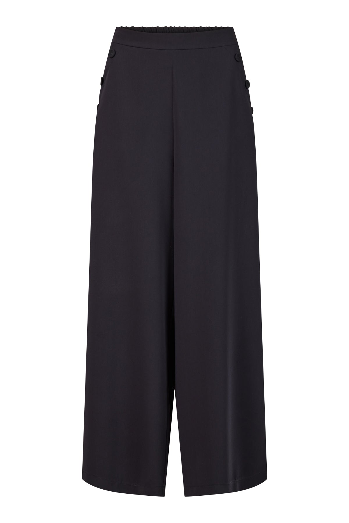 Molly Jo - Alexis sparilegar og þægilegar, víðar buxur með streng í mitti með teygju að aftan og vösum með 3 skrauttölum á hliðinni.