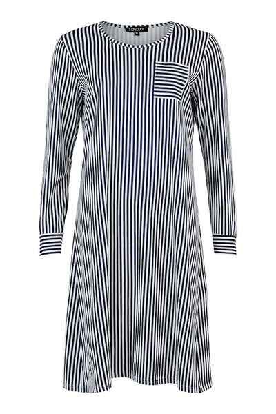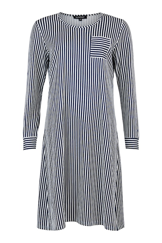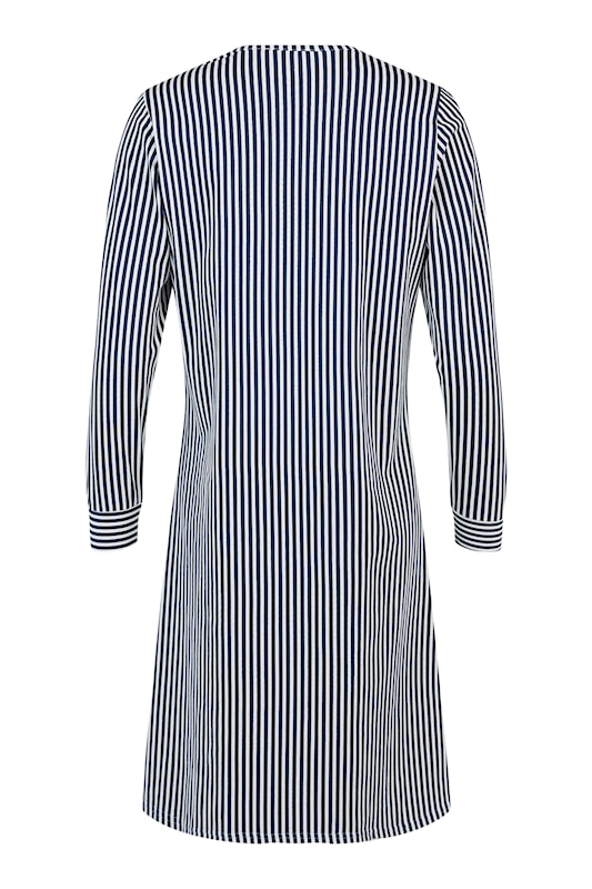 Sunday kvarterma, hálfsíður náttkjóll. Blár og hvítur röndóttur með einum brjóstvasa.