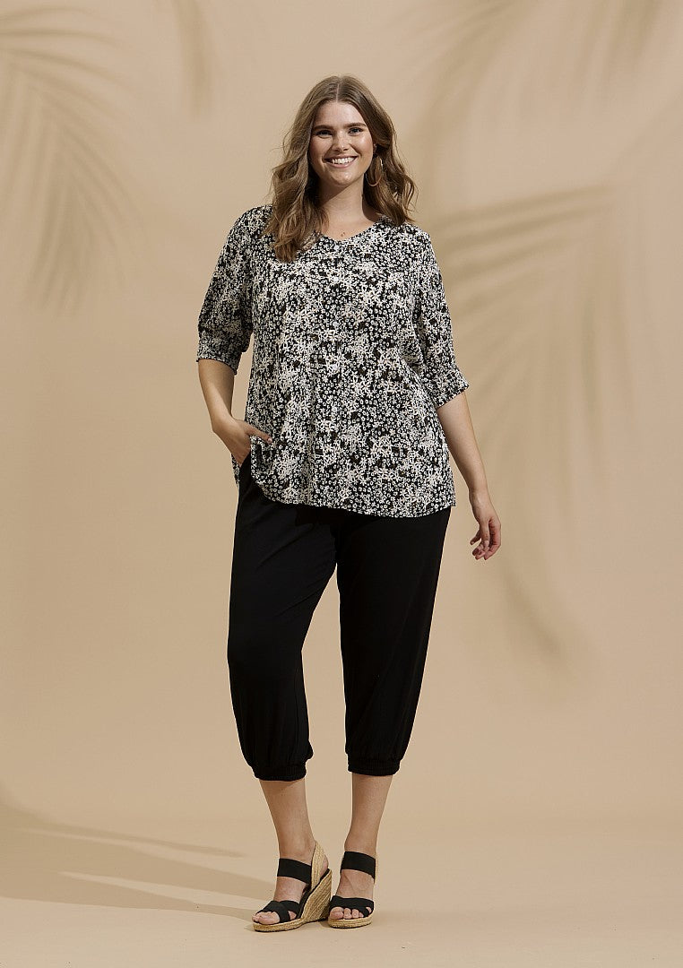 ZHENZI, kósýlegar hálfsíðar buxur með tveim vösum, teygja í mittið.