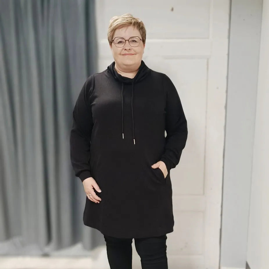 Zhenzi - Mya síð peysa með kraga og böndum. Góðir vasar að framan, langar ermar, stroff framan á ermum. Sportleg og þægileg með leggings eða treggings og virkar vel, bæði í vinnu og leik.