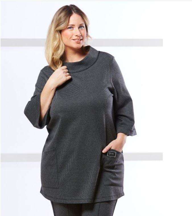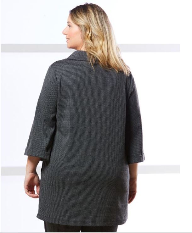 Dökkgrár með houndstooth mynstri. Vasar að framan og rennnilás aftan á hálsmáli