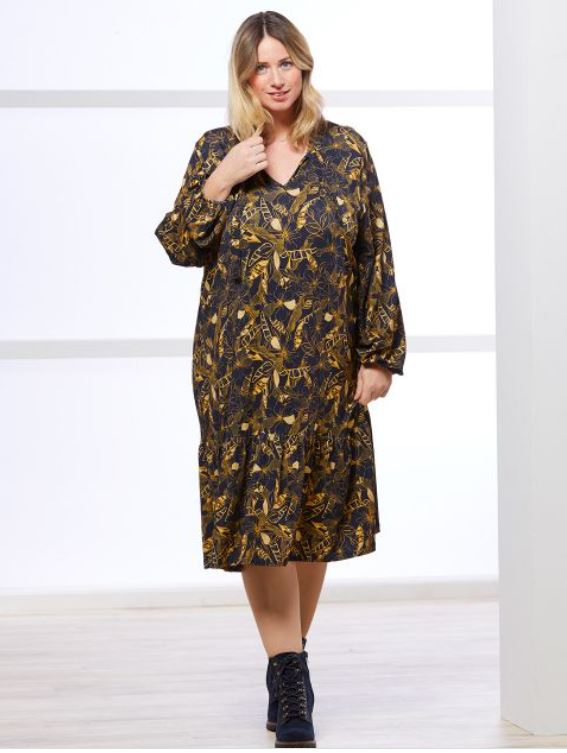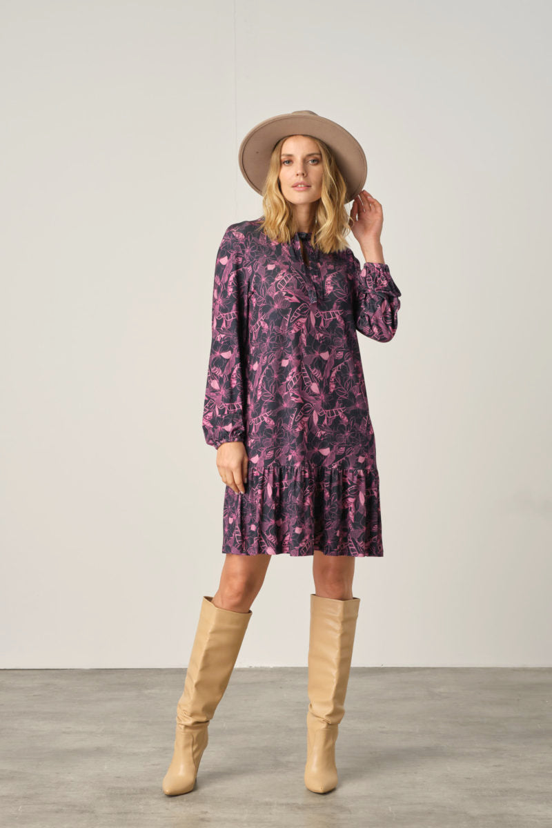 No Secret síðermakjóll með pífu, V-hálsmál með bandi, síðar ermar með teygju á endanum.