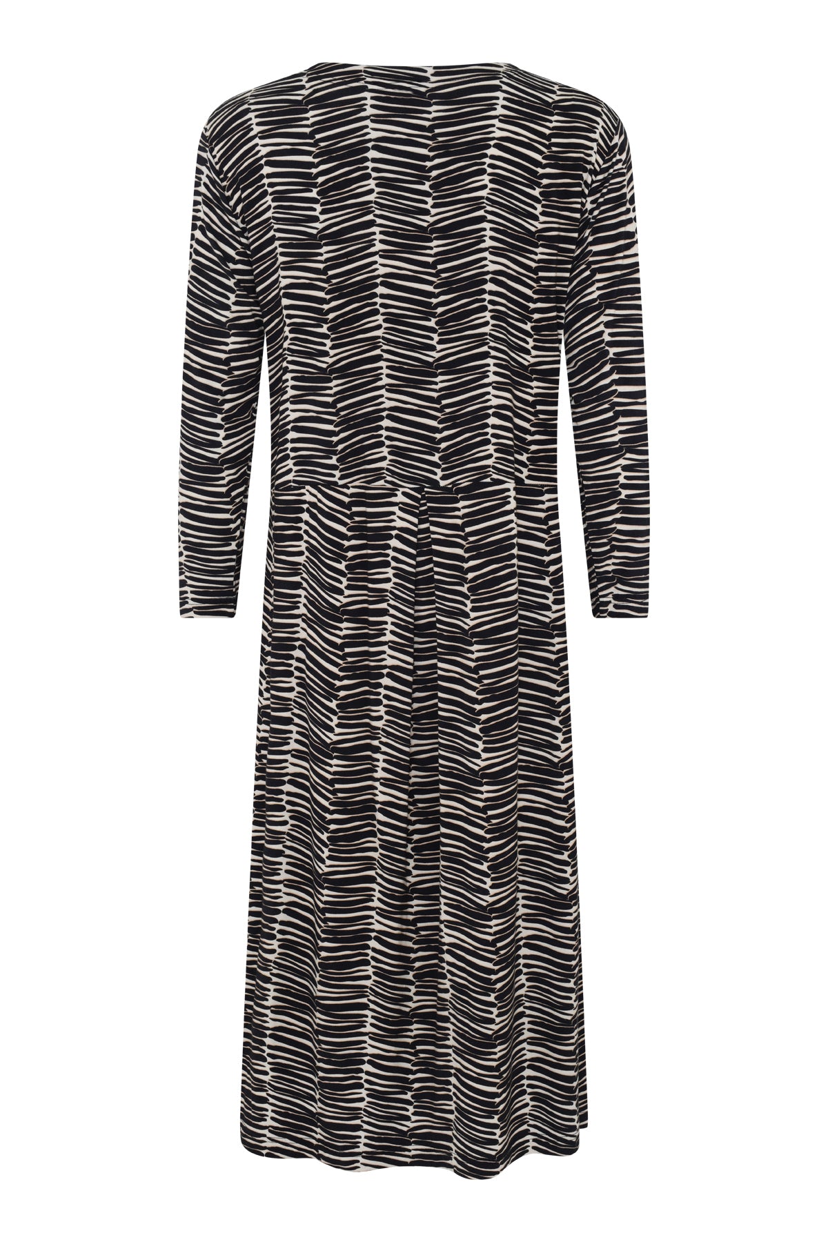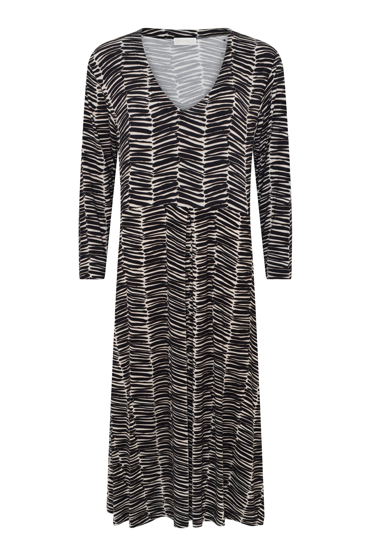 Noen - Demeter mynstraður kjóll með V-hálsmáli og kvartermum. Flottur og vandaður kjóll úr þéttu og endingargóðu viskose efni, gott snið sem víkkar örlítið niður. Passar vel hversdags og spari.