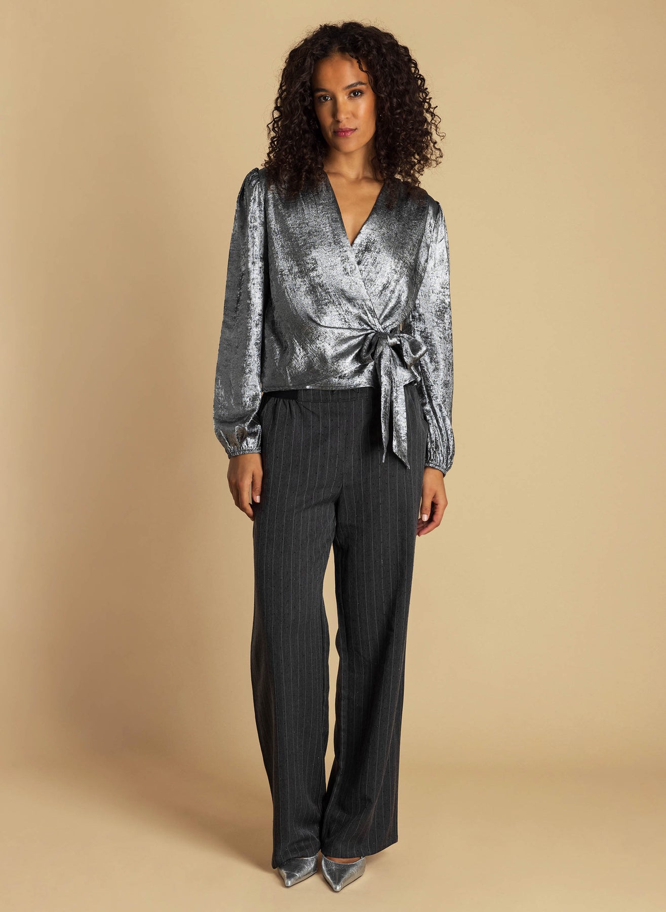 Ivy Beau - Alaia falleg og sparileg blússa. Langar ermar með teygju neðst, V-hálsmál, bundin að framan með slaufu. Passar vel við gallabuxur og treggings, einnig hægt að nota aðeins meira fínt líka, með bara hverju sem er.