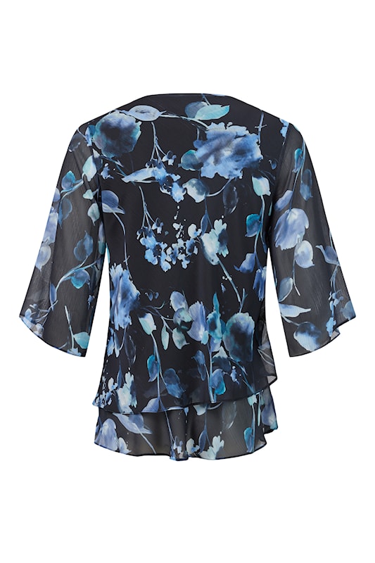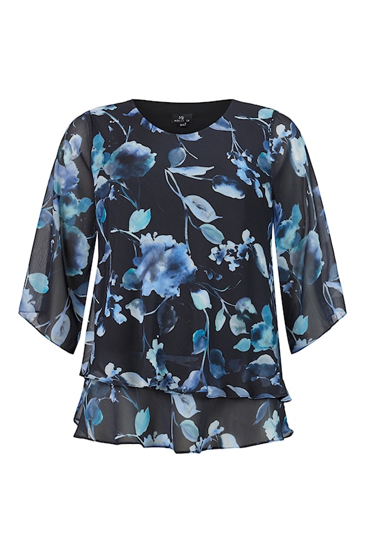 Molly Jo - Jazzlyn, flottur og vandaður kvarterma sparitoppur, svartur í grunninn með fallegu bláu blómamynstri og rúnuðu hálsmáli. Toppurinn er tvö lög sem gefur skemmtilegt flæði.