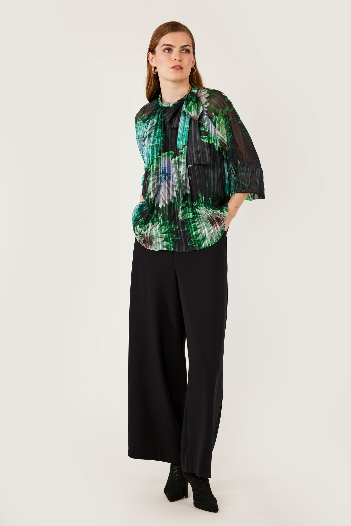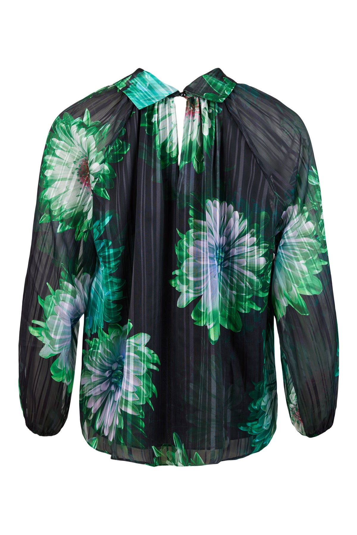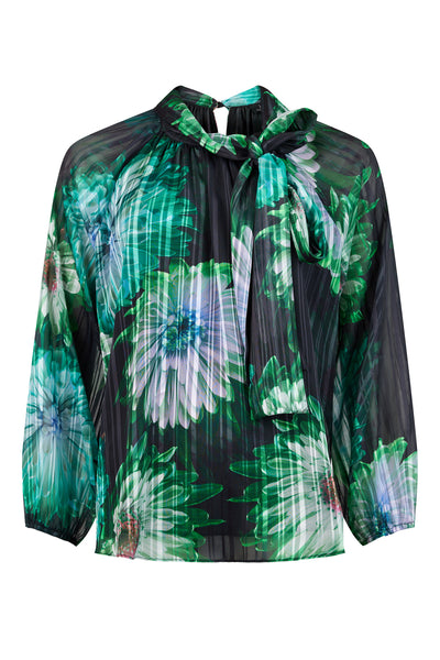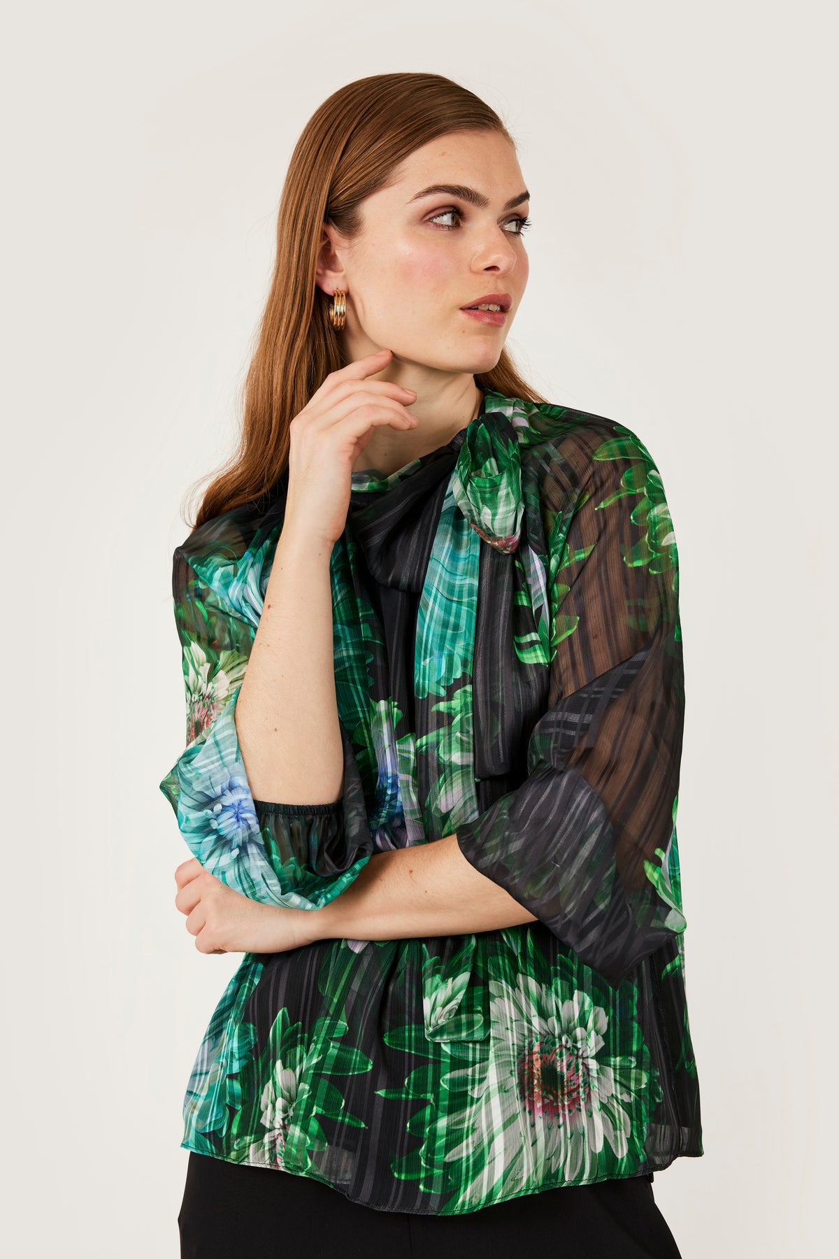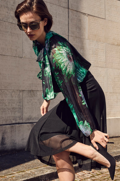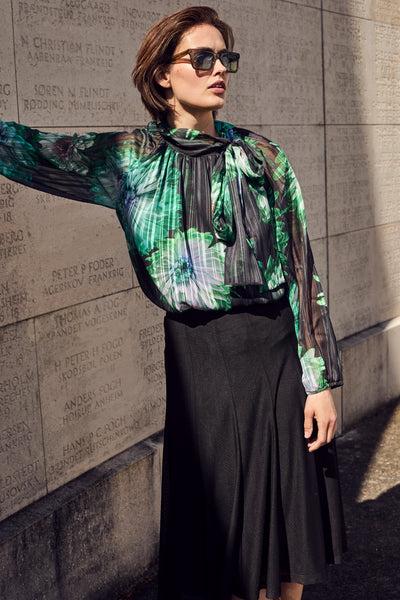 Molly Jo - Malena, flott sparileg shiffon skyrta með langar ermar með teygju og rúnuðu hálsmáli með áföstum slaufuborða.