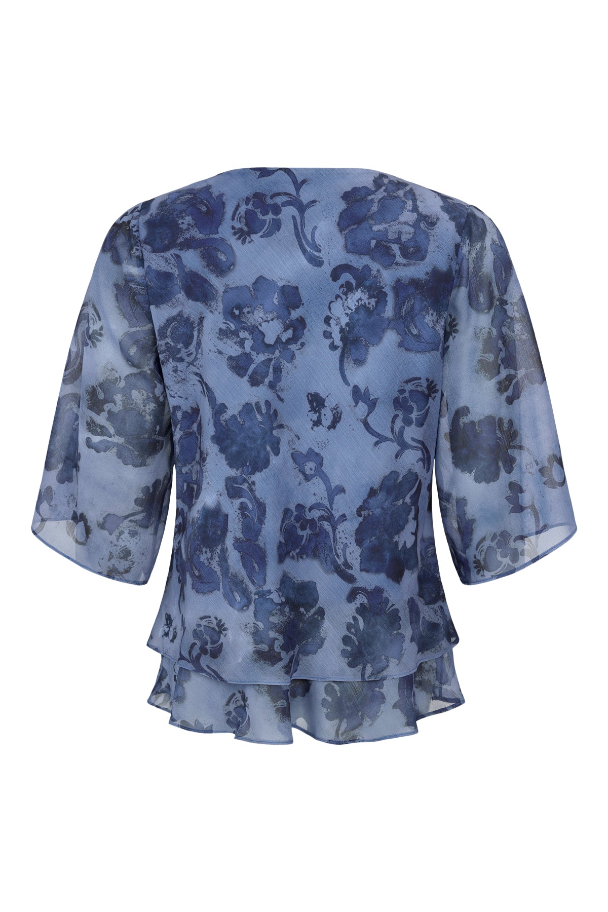 Molly Jo - Paula flottur og vandaður sparitoppur með fallegu blómamynstri. Rúnað hálsmál, hálfgegnsæjar víðar shiffon ermar. Toppurinn hefur tvö lög sem gefur skemmtilegt flæði.