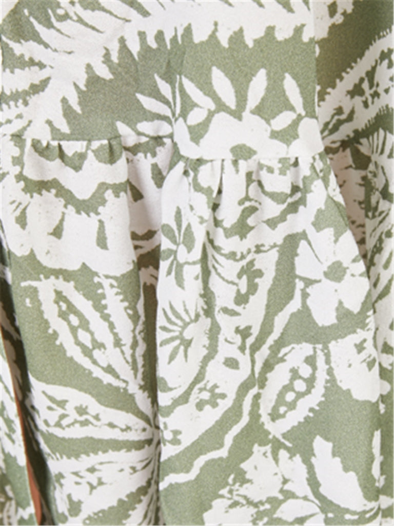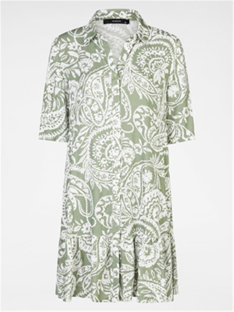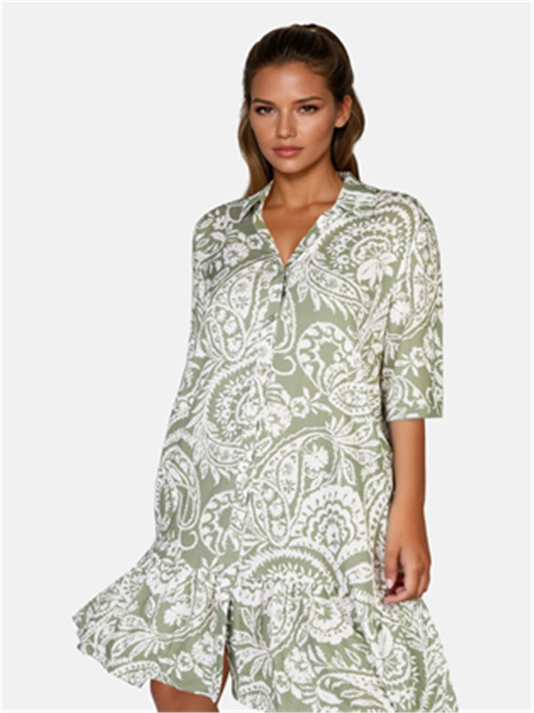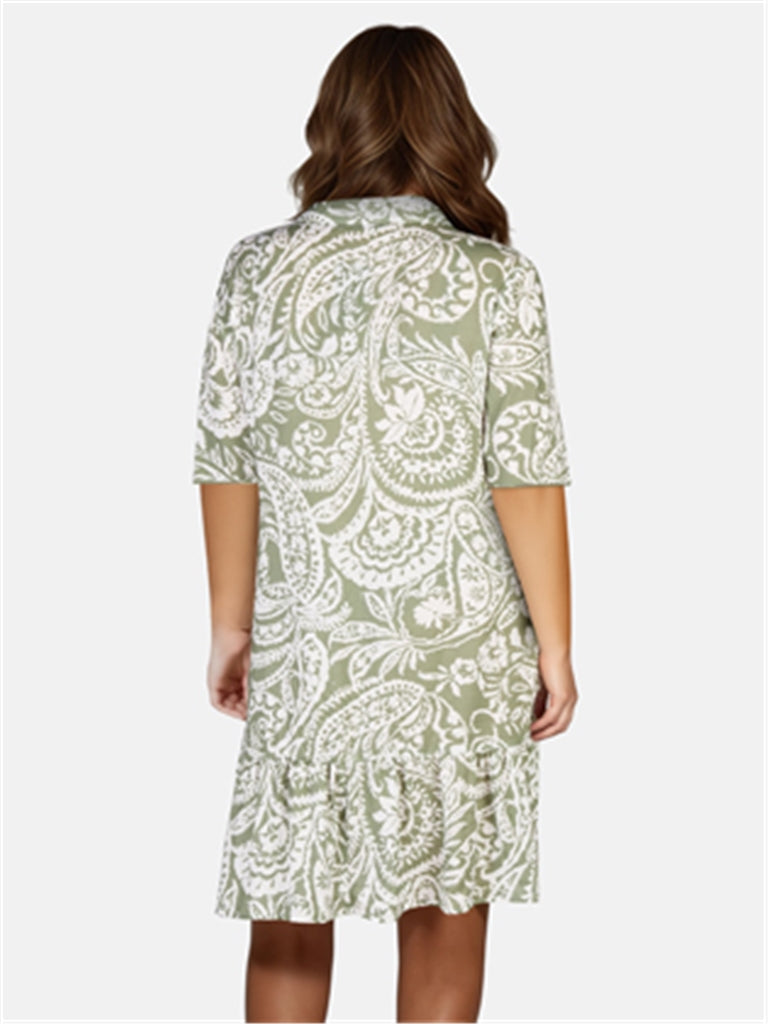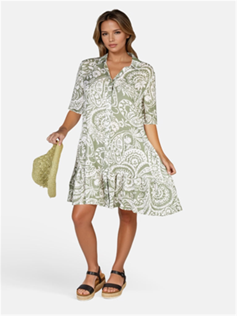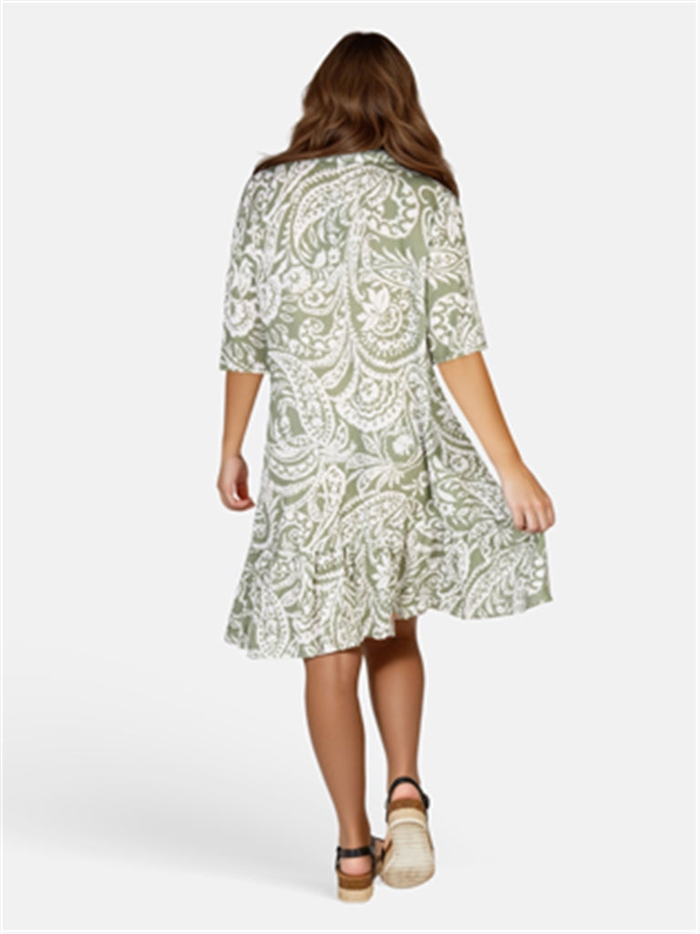 Navigazione - Cecelia fallegur og þægilegur kjóll með flottu mynstri. Skyrtukragi, V-hálsmál, hnepptur alla leið niður, stuttar ermar, pífa neðst á faldi. Hentar vel bæði spari og hversdags.