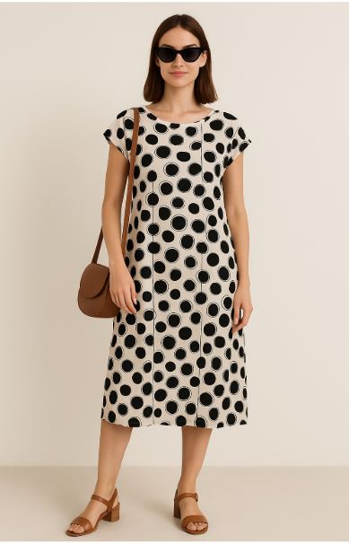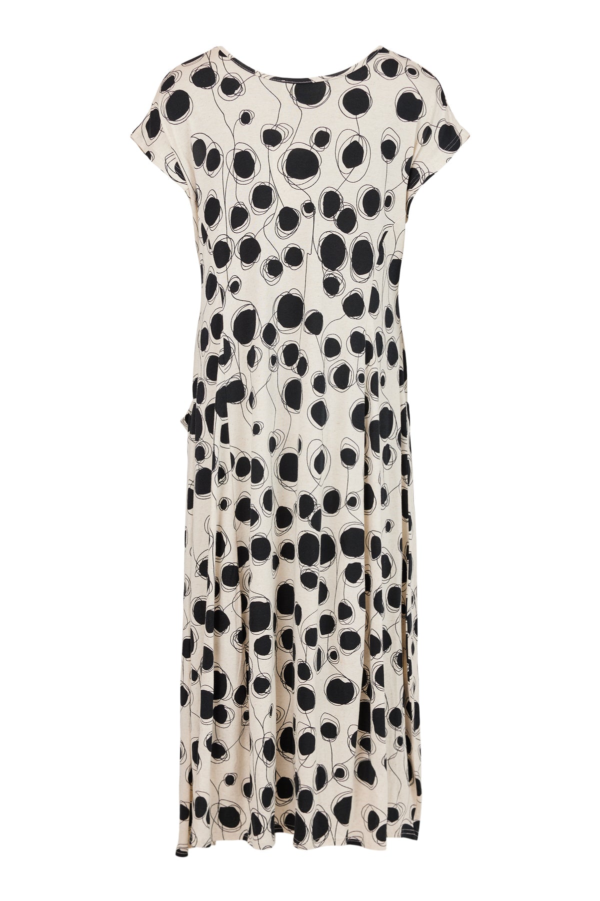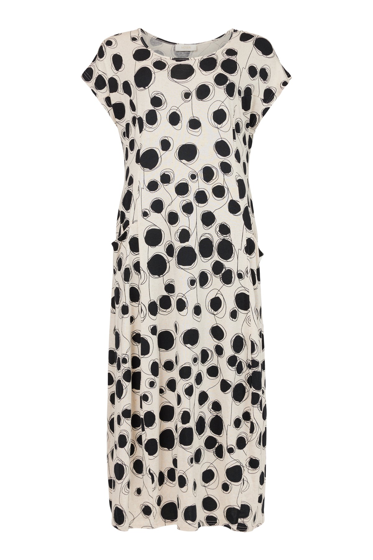 Noen - Danna, fallegur og sparilegur mynstraður kjóll. Stuttar ermar, vasar og rúnað hálsmál. Flottur og vandaður kjóll úr þéttu og endingargóðu viskose efni sem fellur vel, víkkar aðeins niður. Gott snið, passar vel hvort sem er hversdags eða spari.