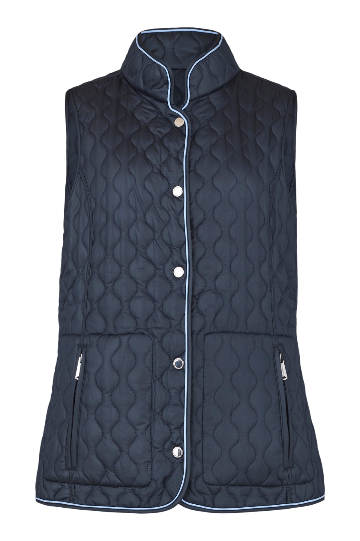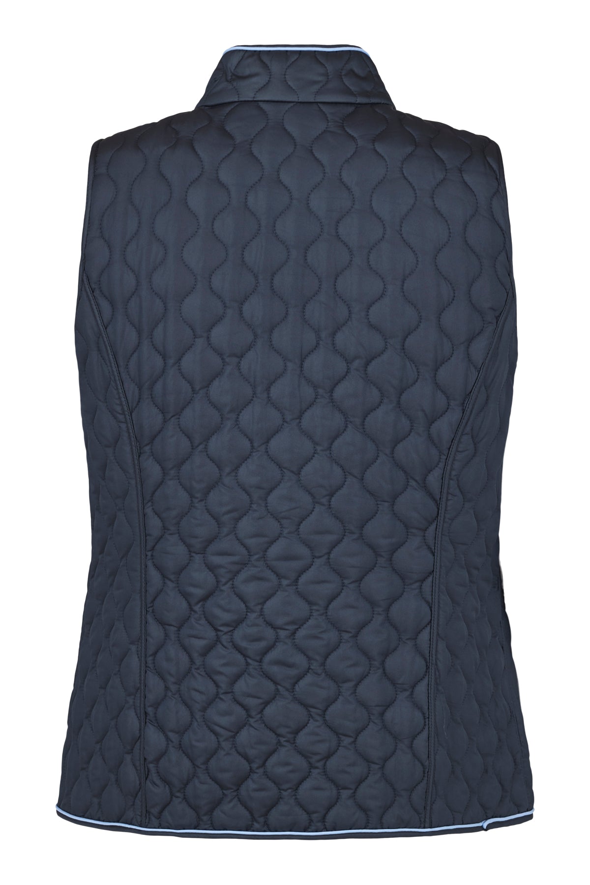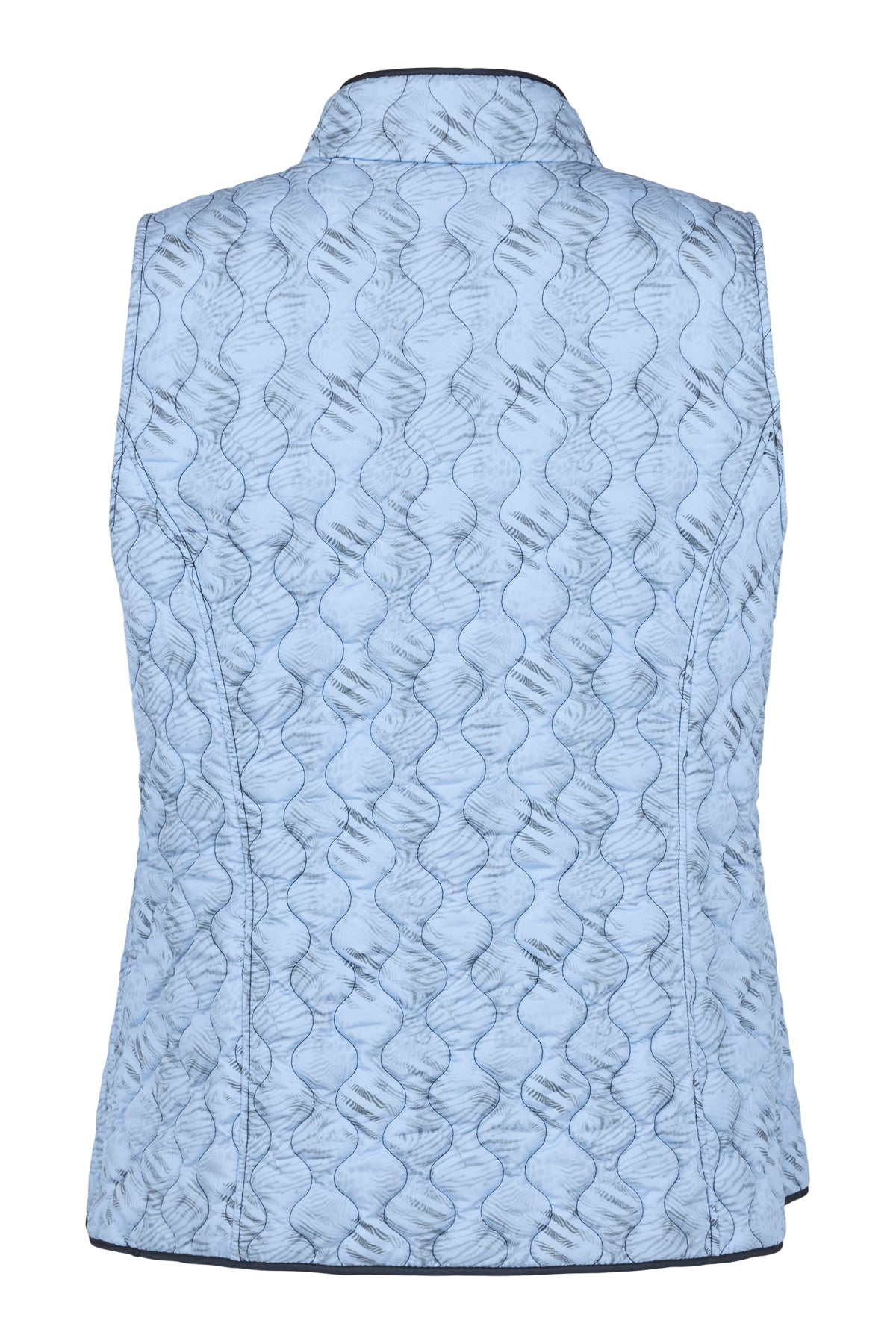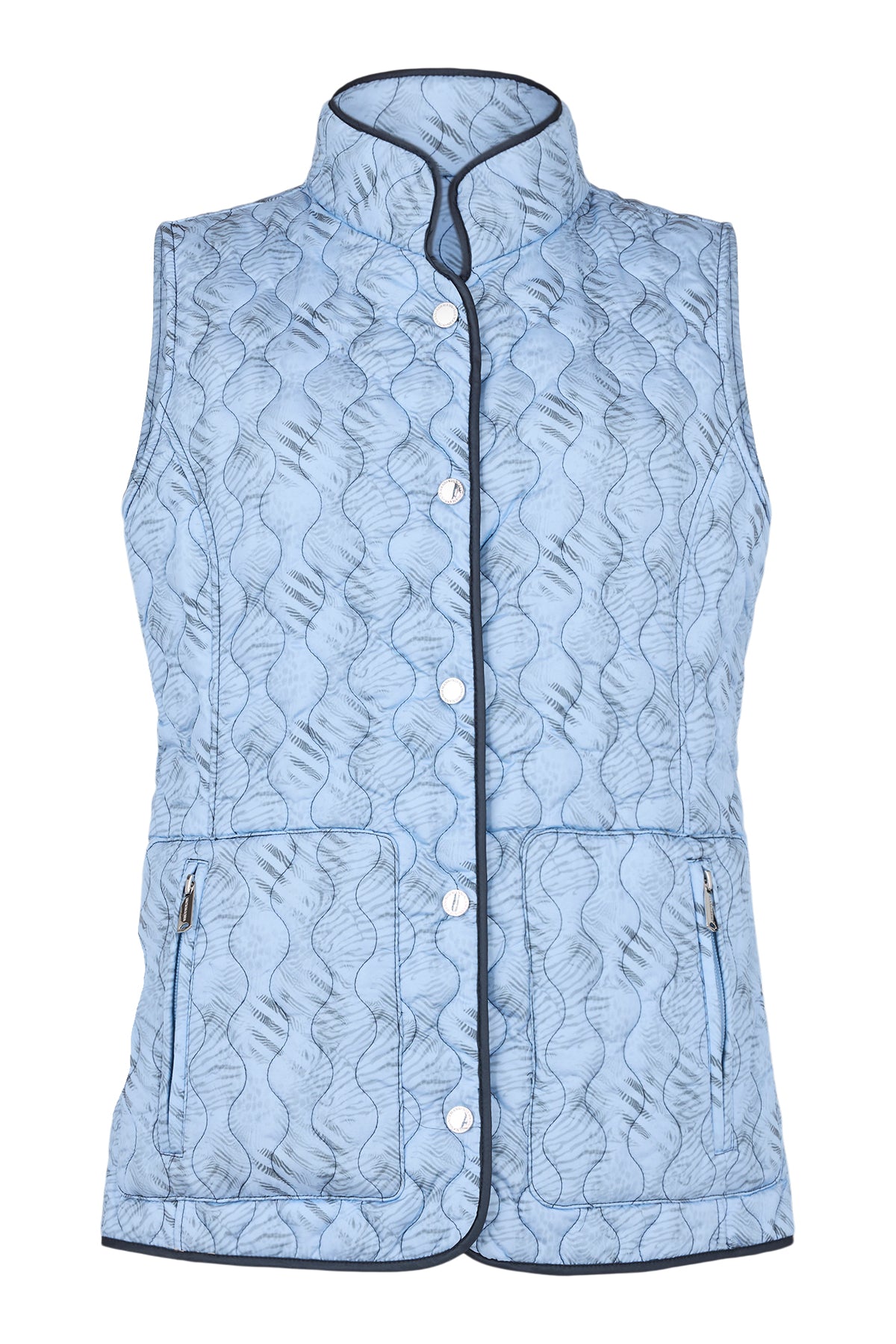 Normann - Cindy vattstungið vesti/vendingur með háum kraga. Hægt að snúa á tvo vegu, dökkblár öðru megin og ljósblátt mynstur á hinni hliðinni. Smellur niður að framan og tveir renndir vasar. Frábær í ferðalögin, golfið og gönguferðirnar en virkar jafnvel allsstaðar.