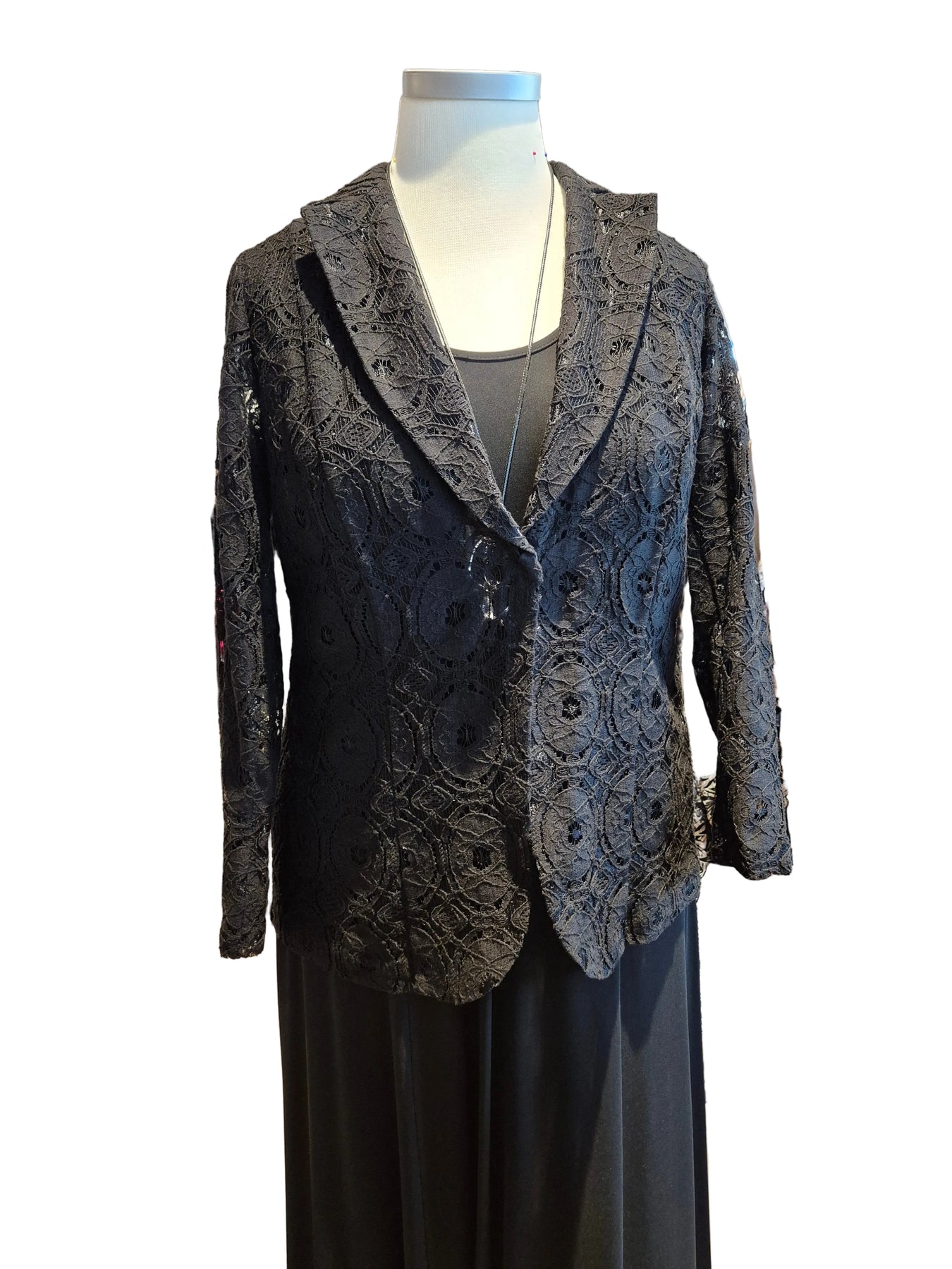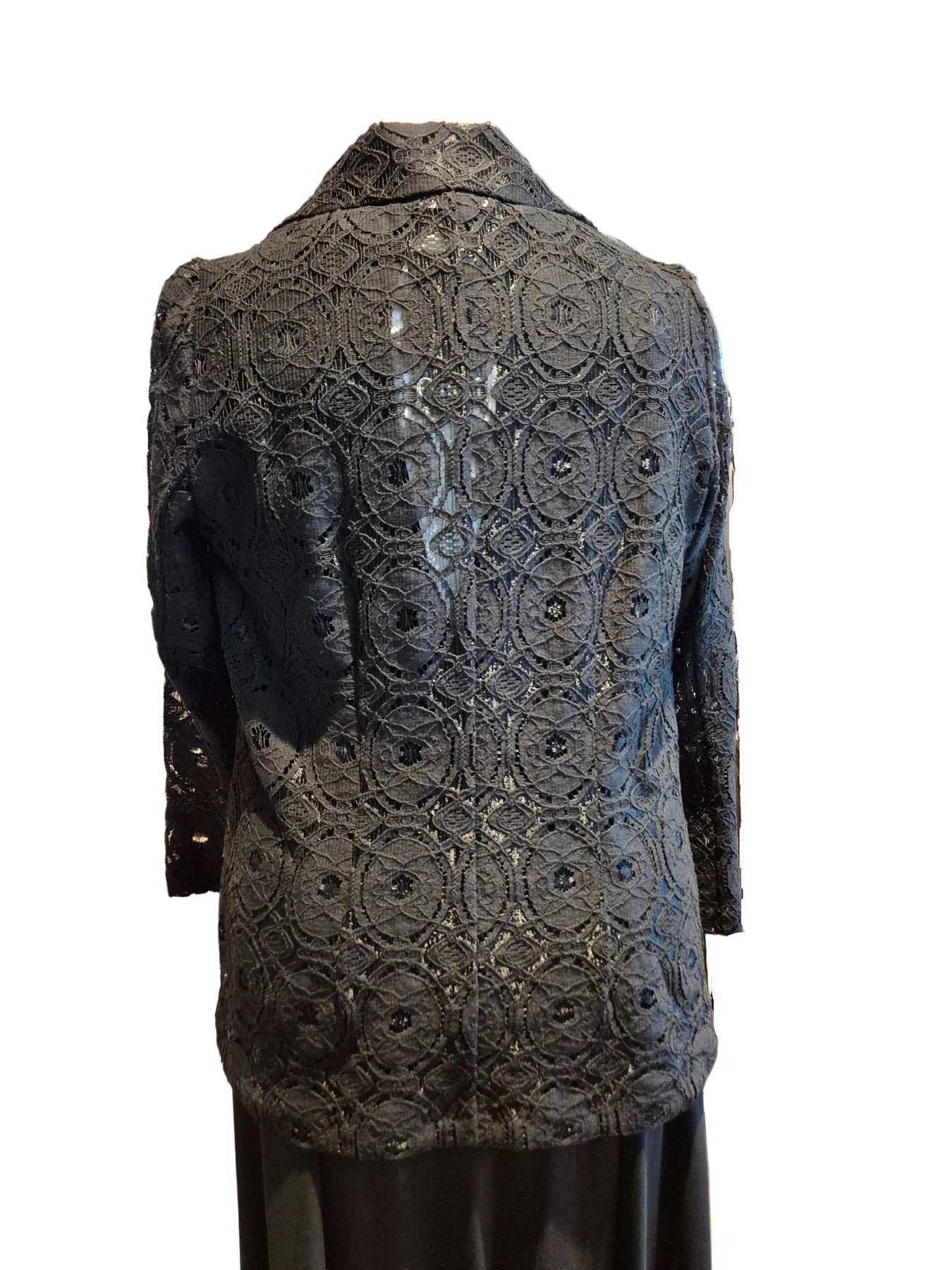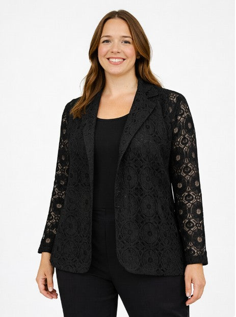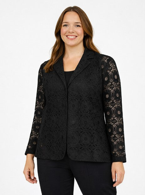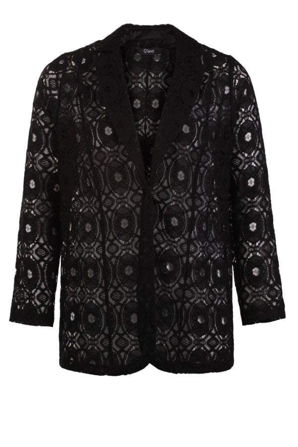 Q'neel - Hadley fallegur og sparilegur blúndujakki. Smelltur að framan með einni smellu, kragi, langar ermar, ófóðraður. Sparilegur og flottur blúndujakki sem virkar vel yfir kjóla, eða með pilsi og buxum.