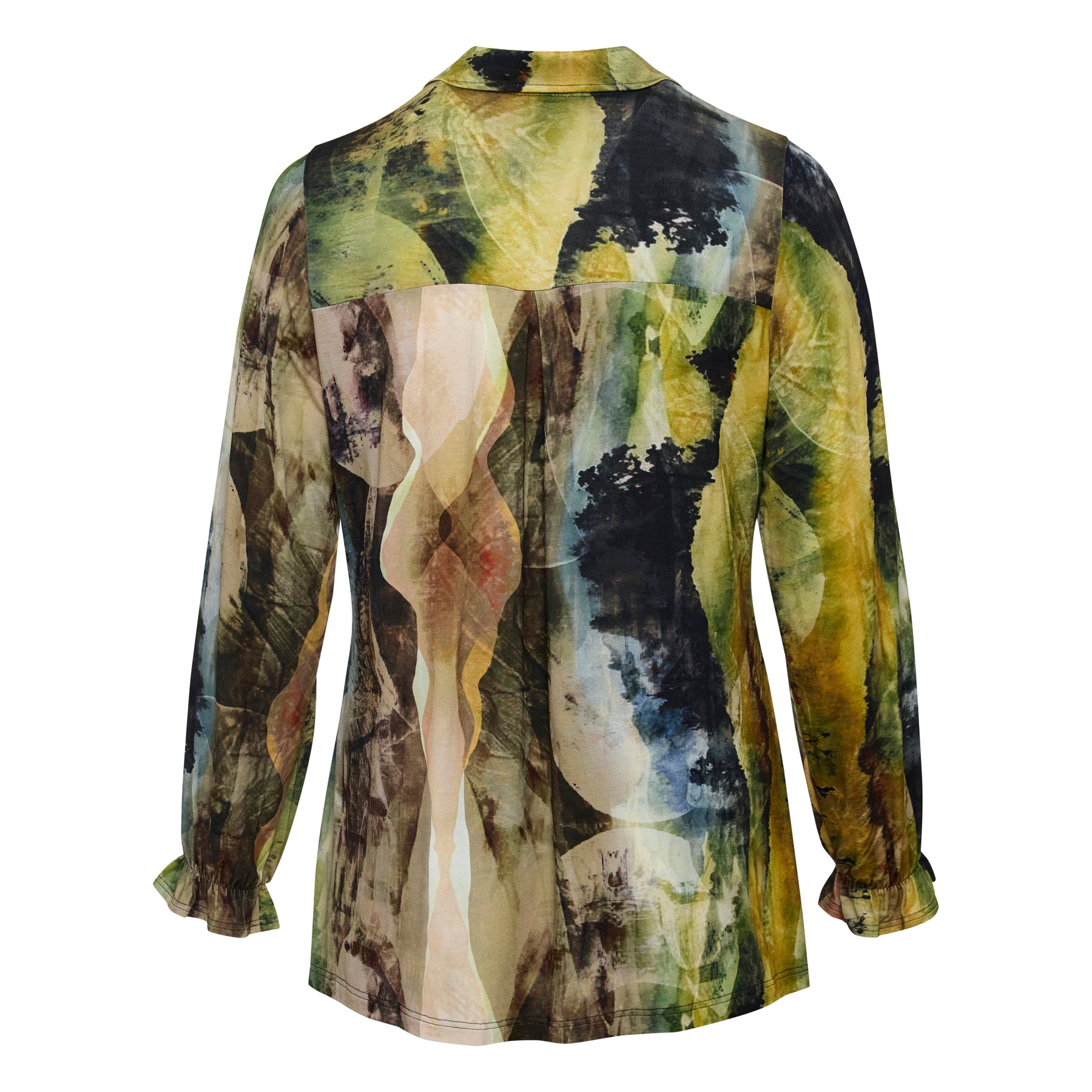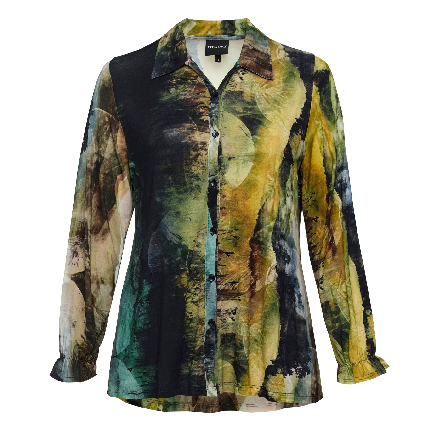 Studio - Mimi falleg og sparileg skyrta. Hneppt alla leið niður að framan, skyrtukragi, langar ermar með teygju og smá pífu neðst, aðeins síðari að aftan. Falleg skyrta sem passar vel með buxum eða pilsi hvort sem það er hversdags eða spari.
