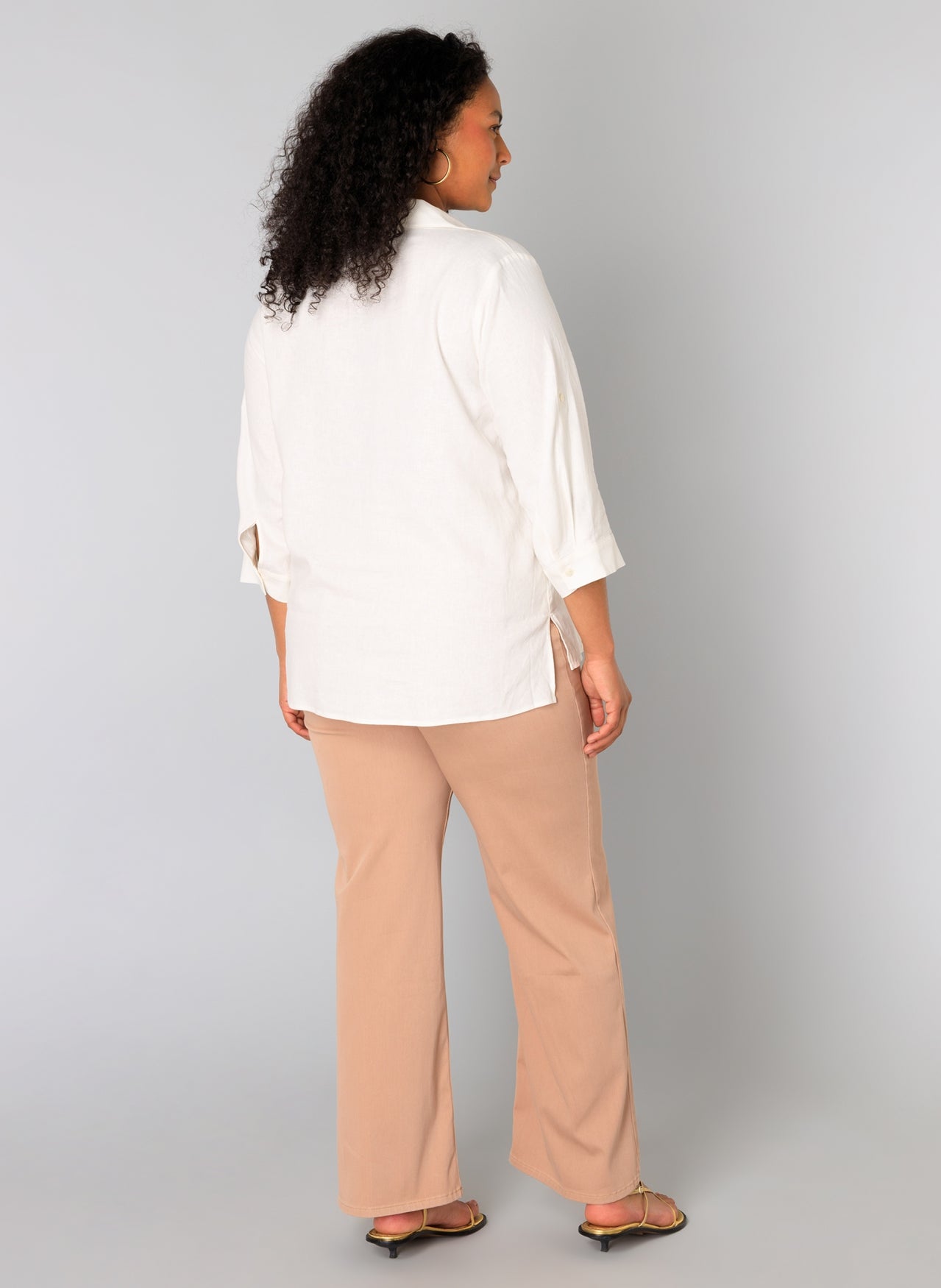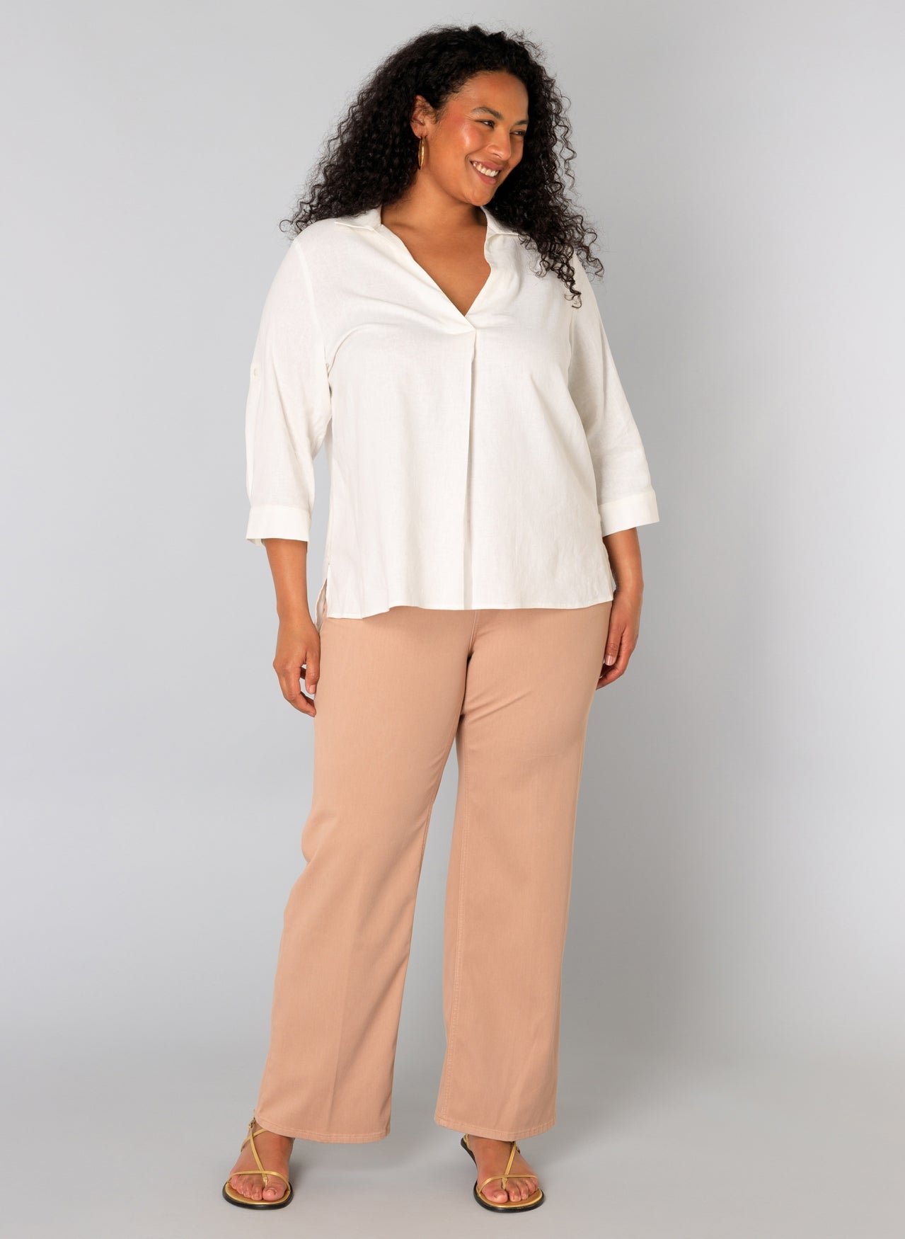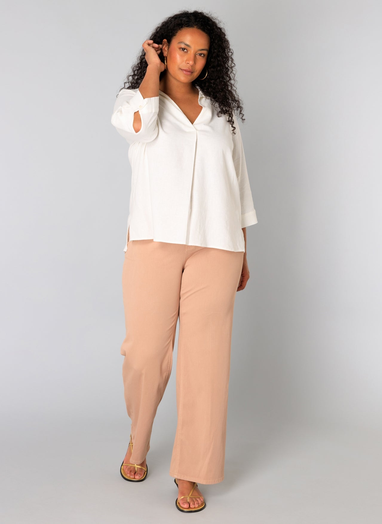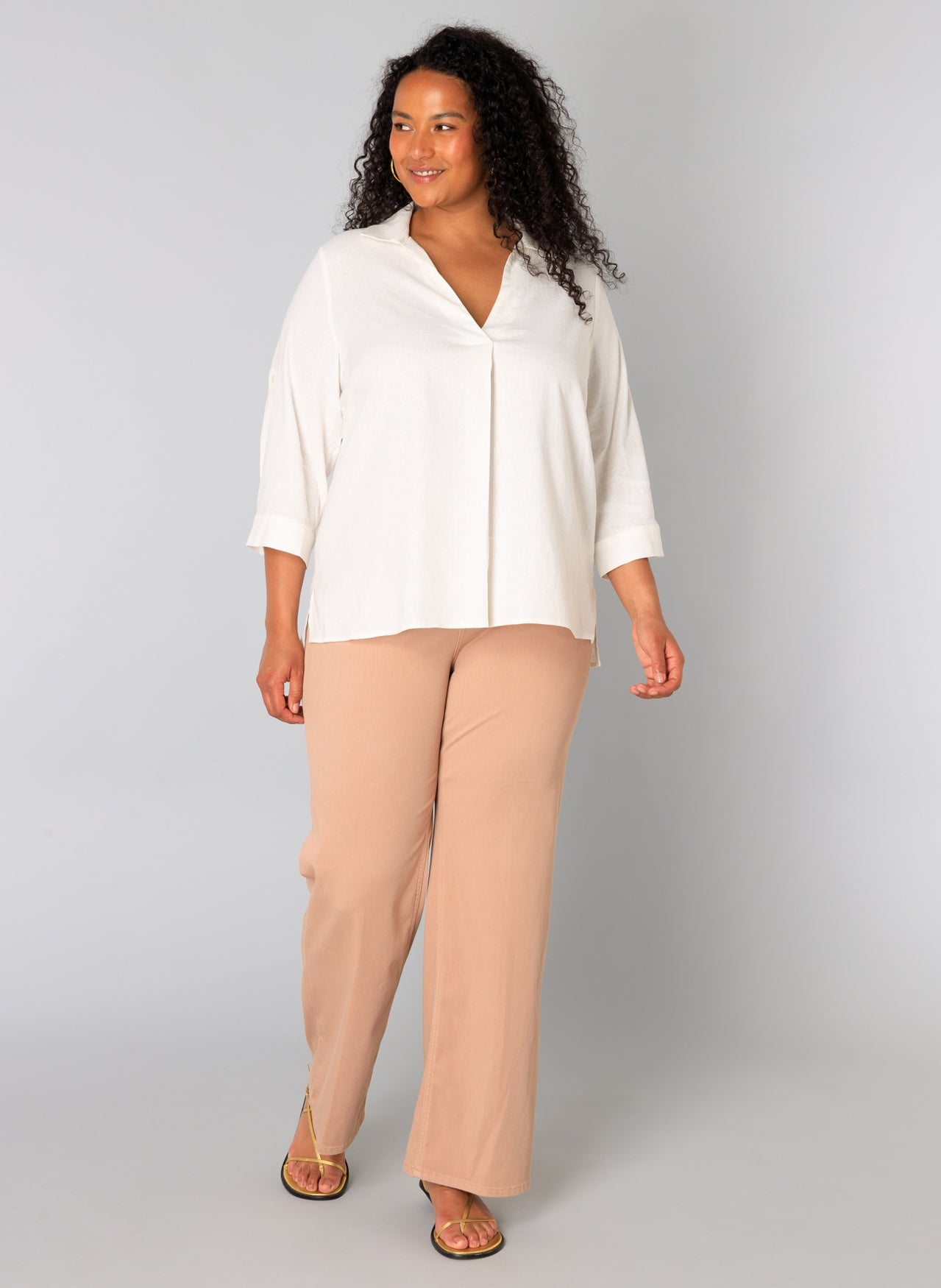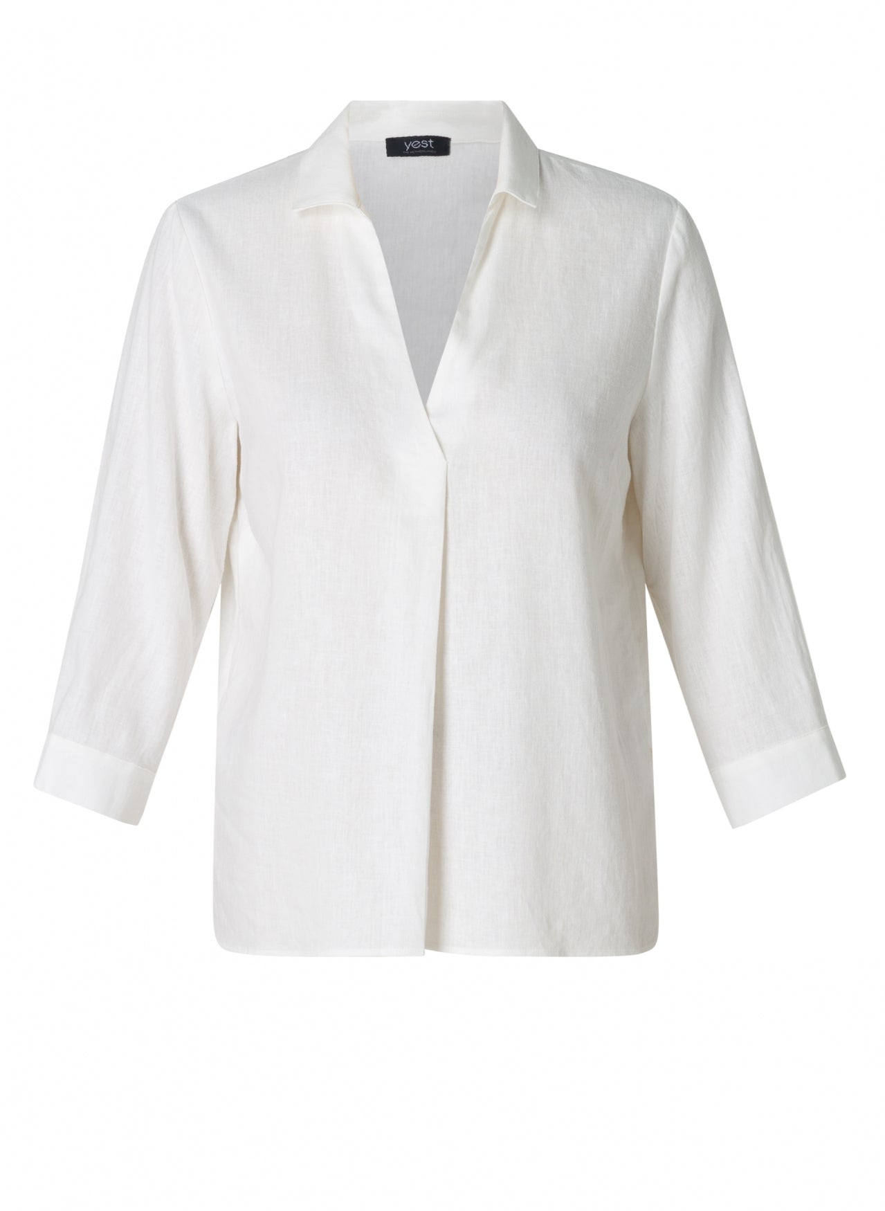 Yest Curve - Uda flott og þægileg hör blússa. V-hálsmál, skyrtukragi, kvartermar með tölu neðst, klauf á hlið. Passar vel hvar sem er, bæði hversdags og spari.