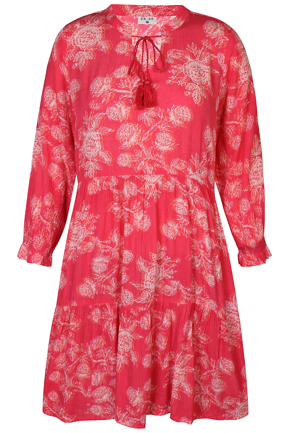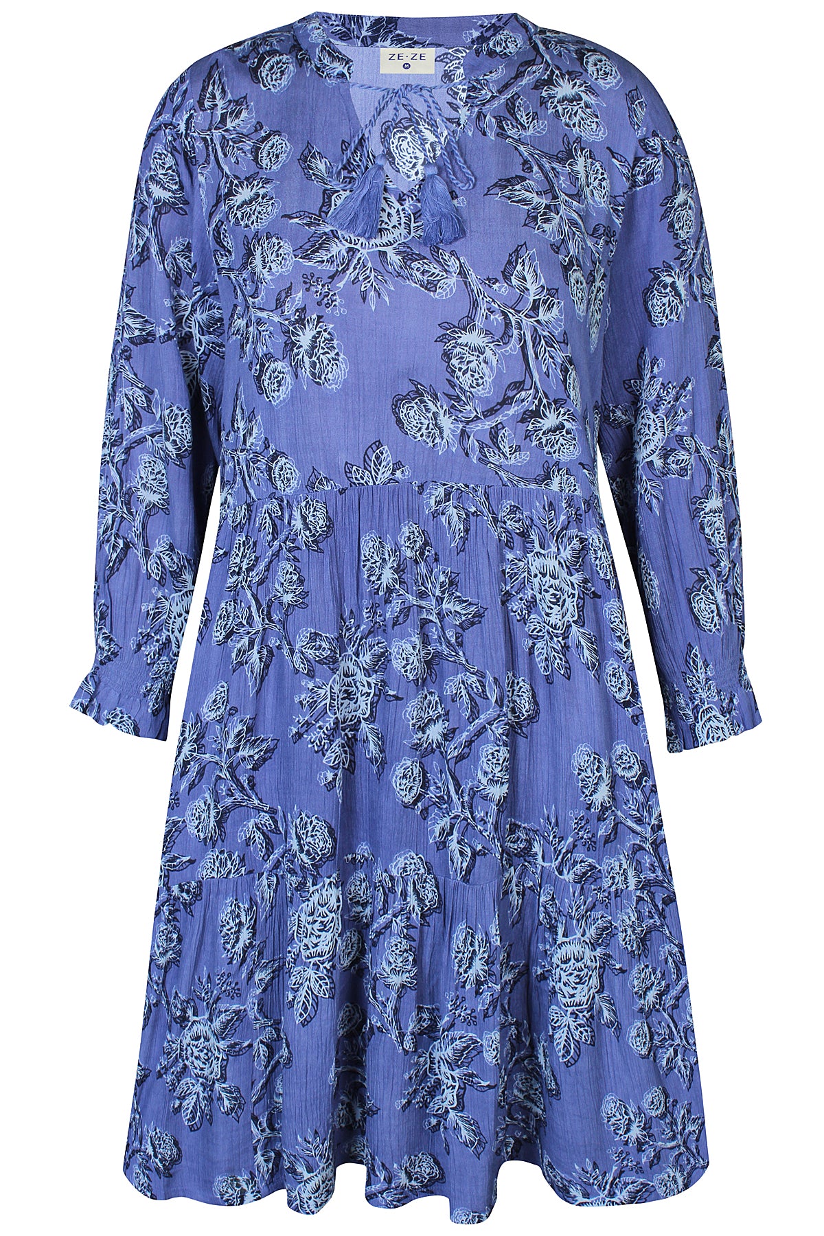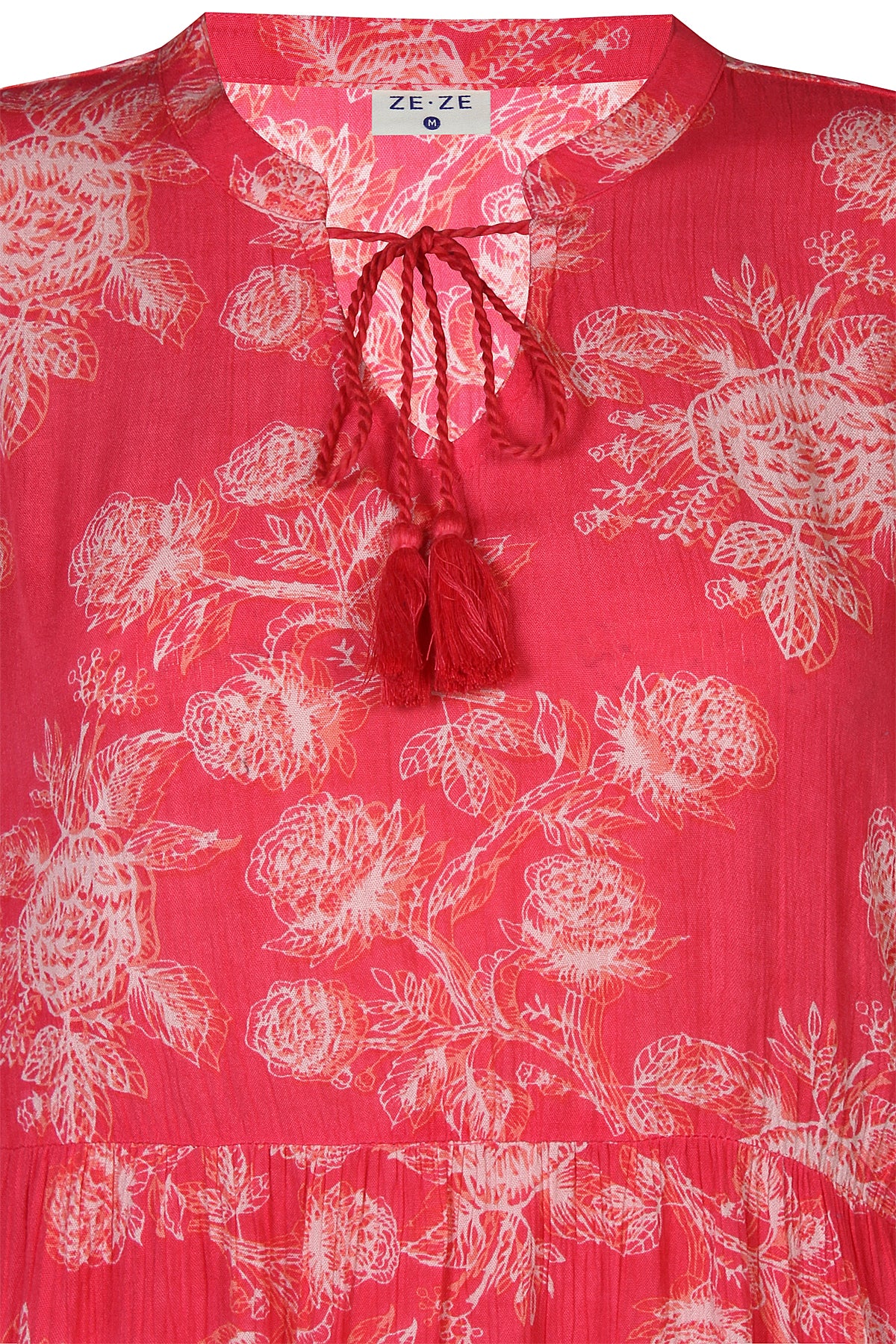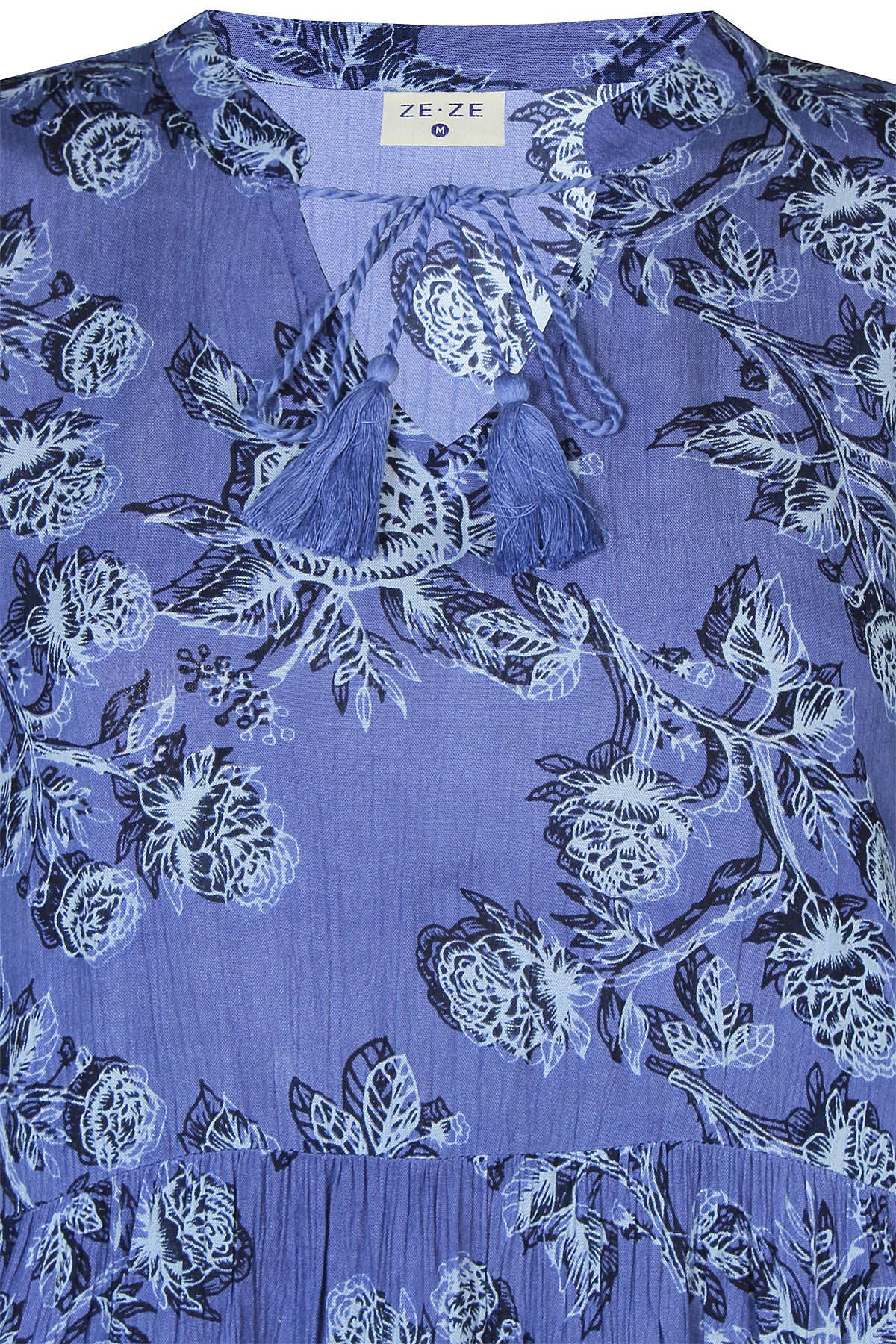 Ze-Ze - Joella, stuttur pífukjóll með blómamynstri. V-hálsmál með pífukraga og bandi, vasar, hálfsíðar ermar með smá teygju með pífu fremst, penar pífur sem gefa skemmtilega hreyfingu. Létt og þægilegt efni.