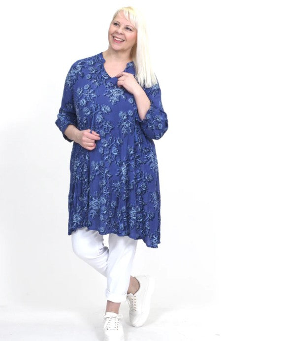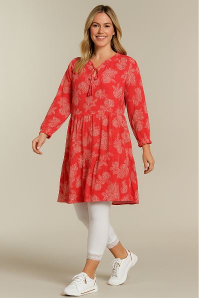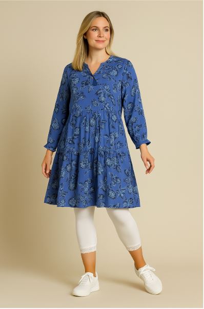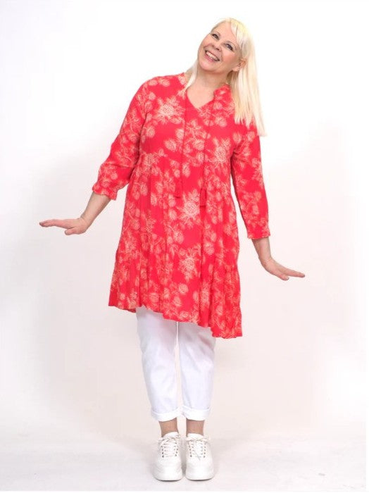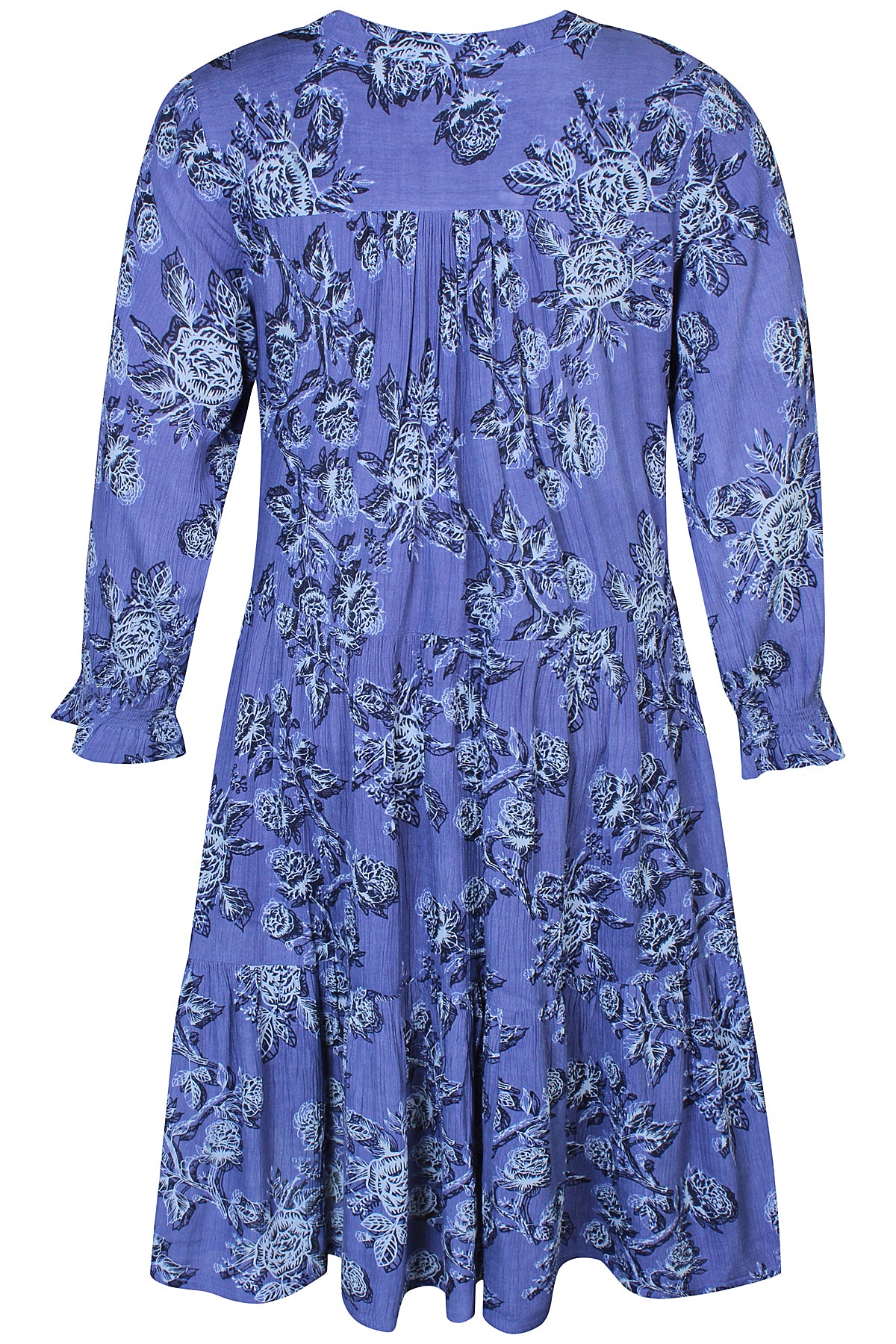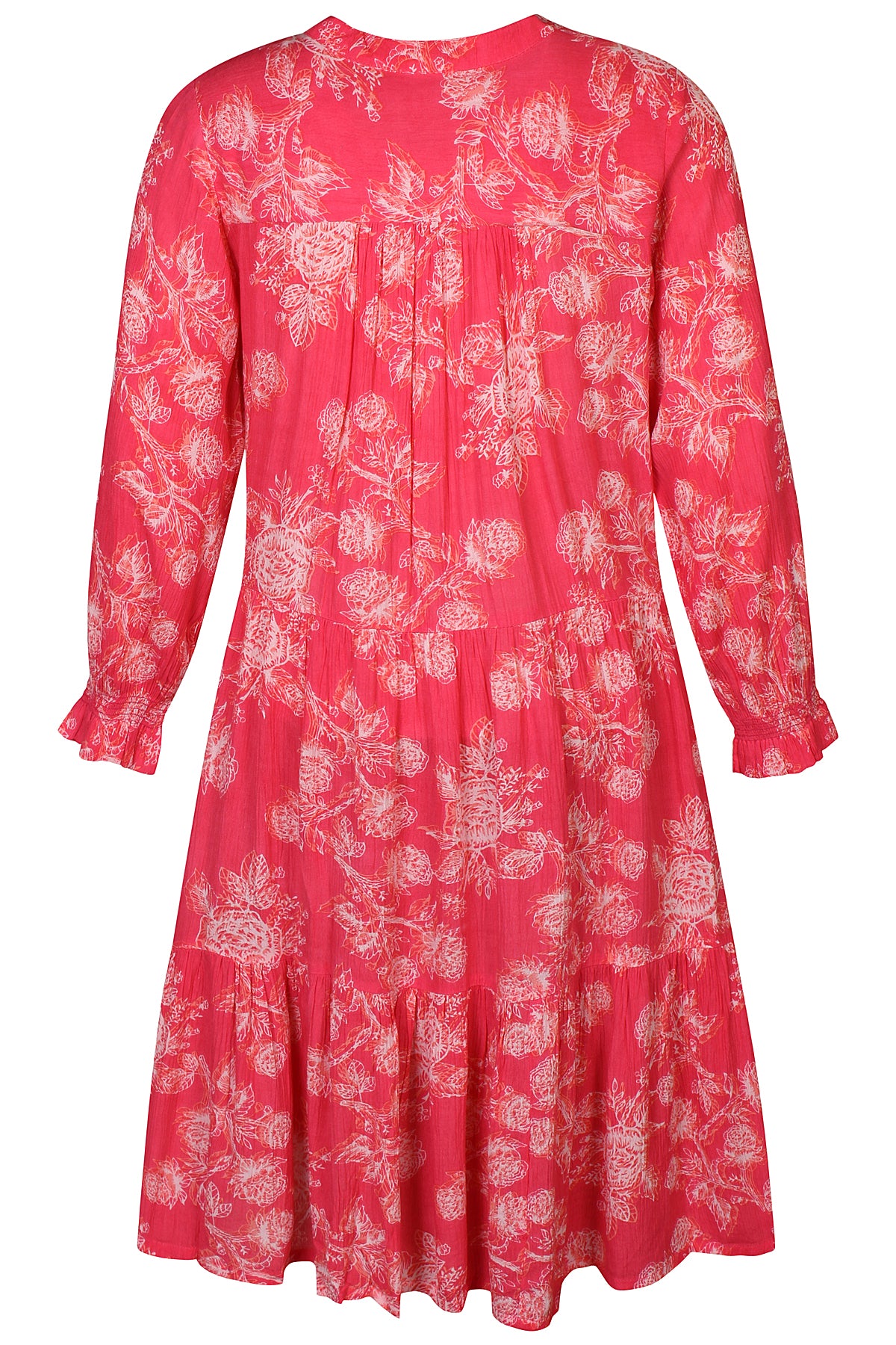 Ze-Ze - Joella, stuttur pífukjóll með blómamynstri. V-hálsmál með pífukraga og bandi, vasar, hálfsíðar ermar með smá teygju með pífu fremst, penar pífur sem gefa skemmtilega hreyfingu. Létt og þægilegt efni.