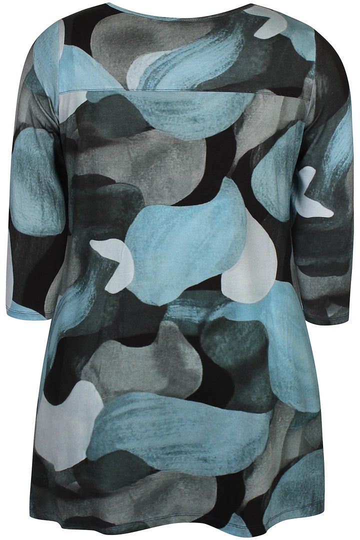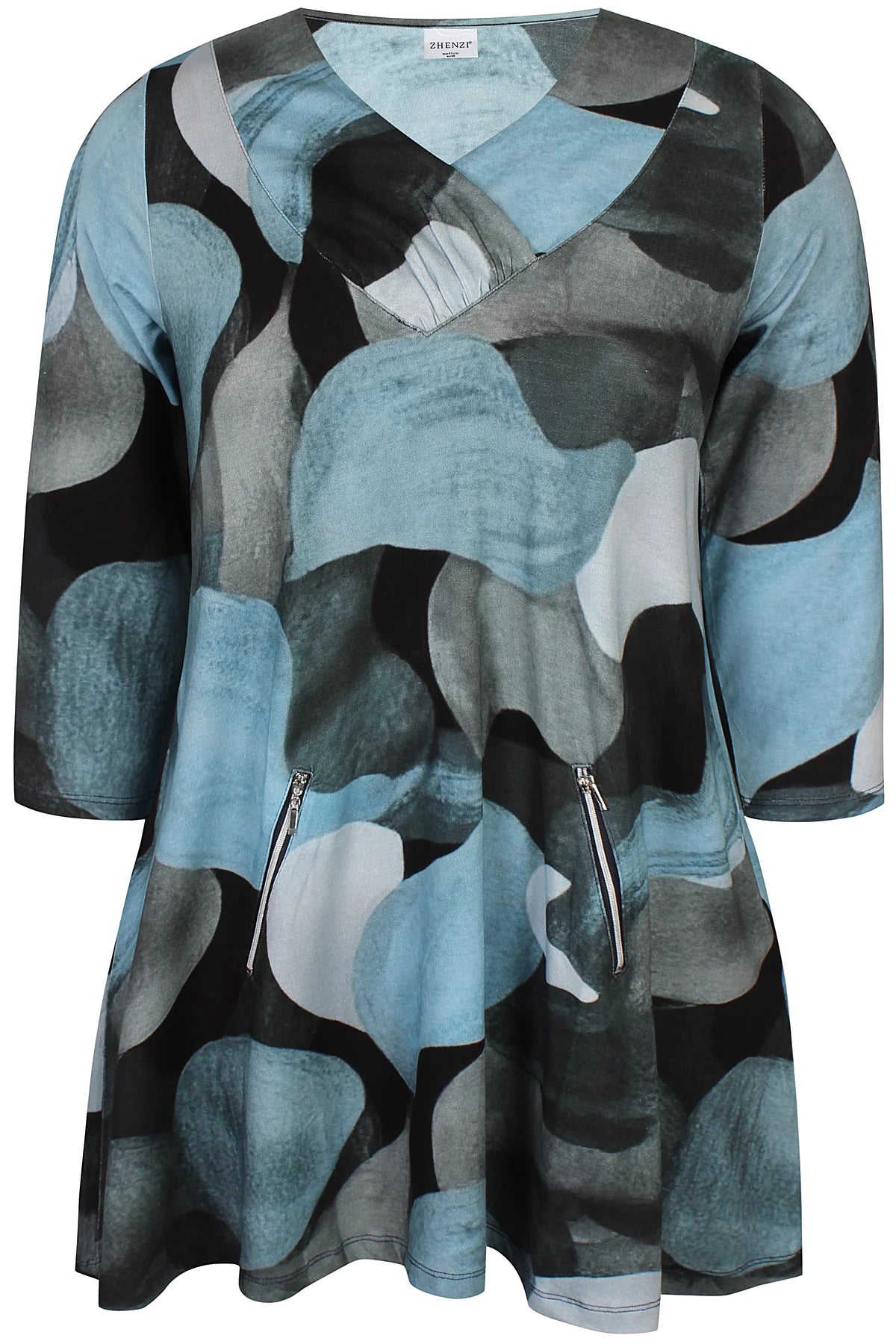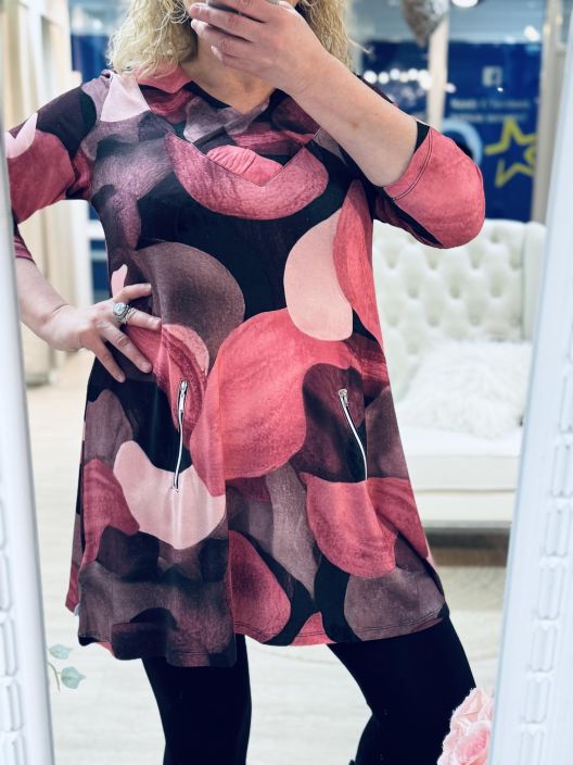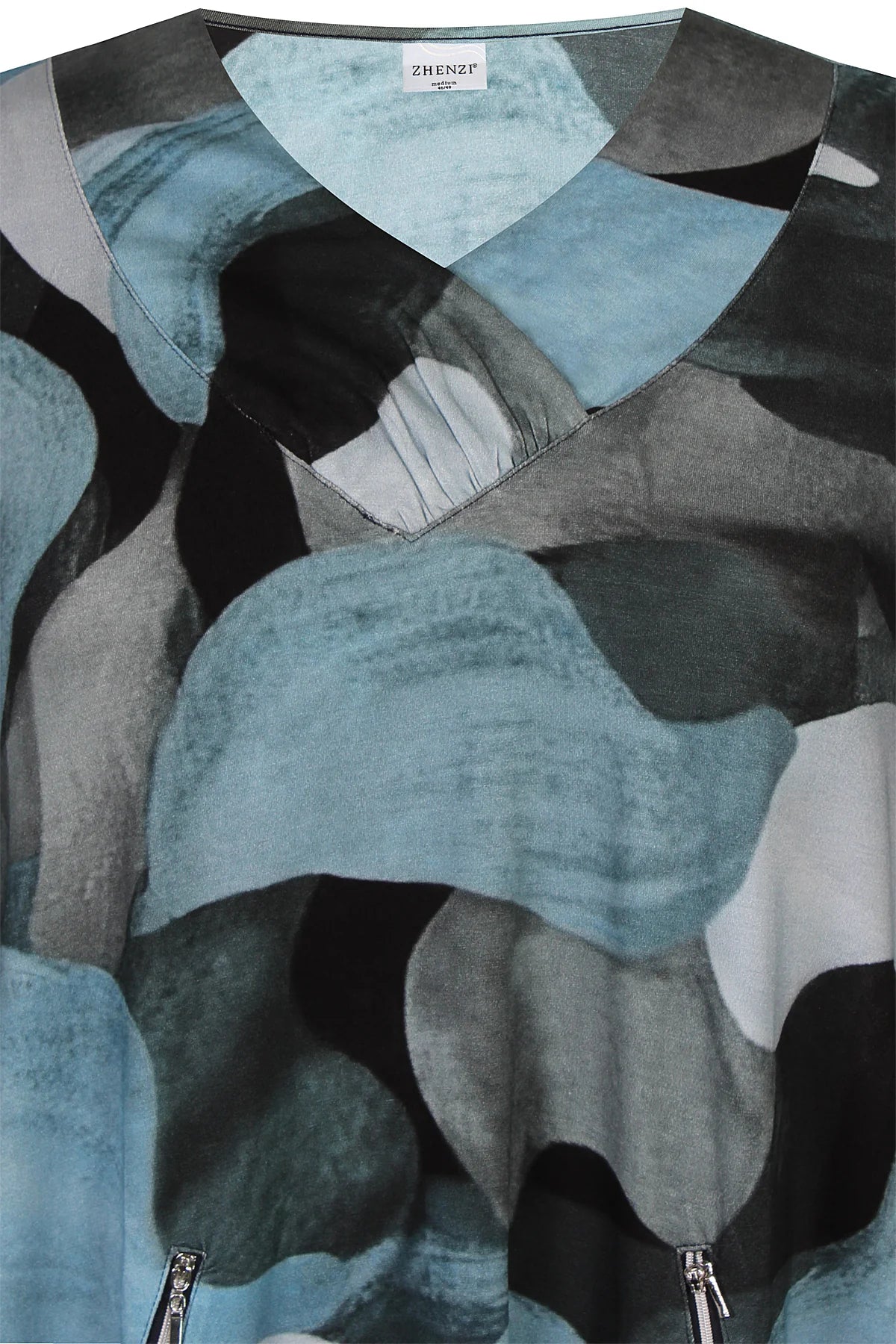 Zhenzi - Aisha flott og sparileg tunika með fallegu mynstri. V-hálsmál, kvartermar, skrautvasar með rennilás að framan, A-snið, mjúkt og þægilegt efni. Passar vel við t.d. treggings eða gallabuxur.