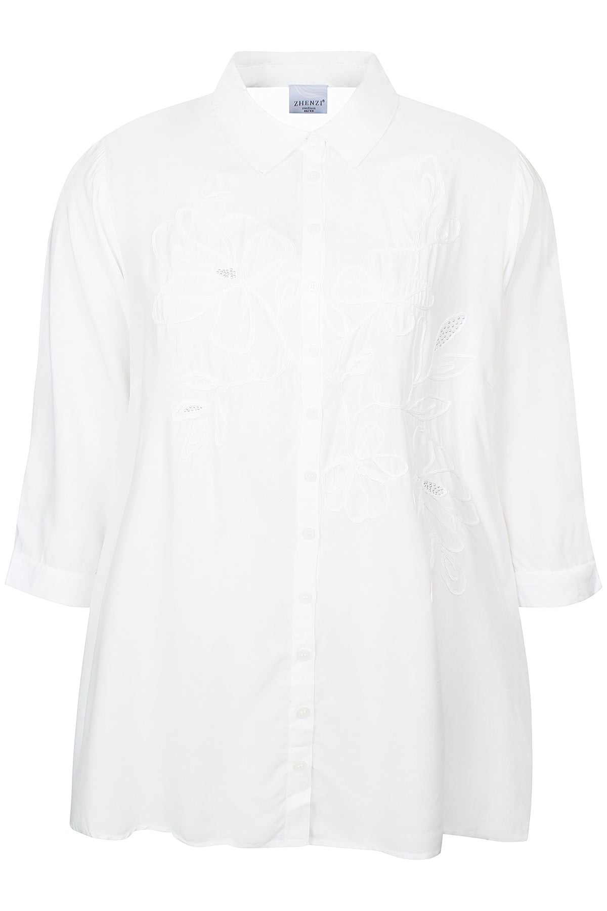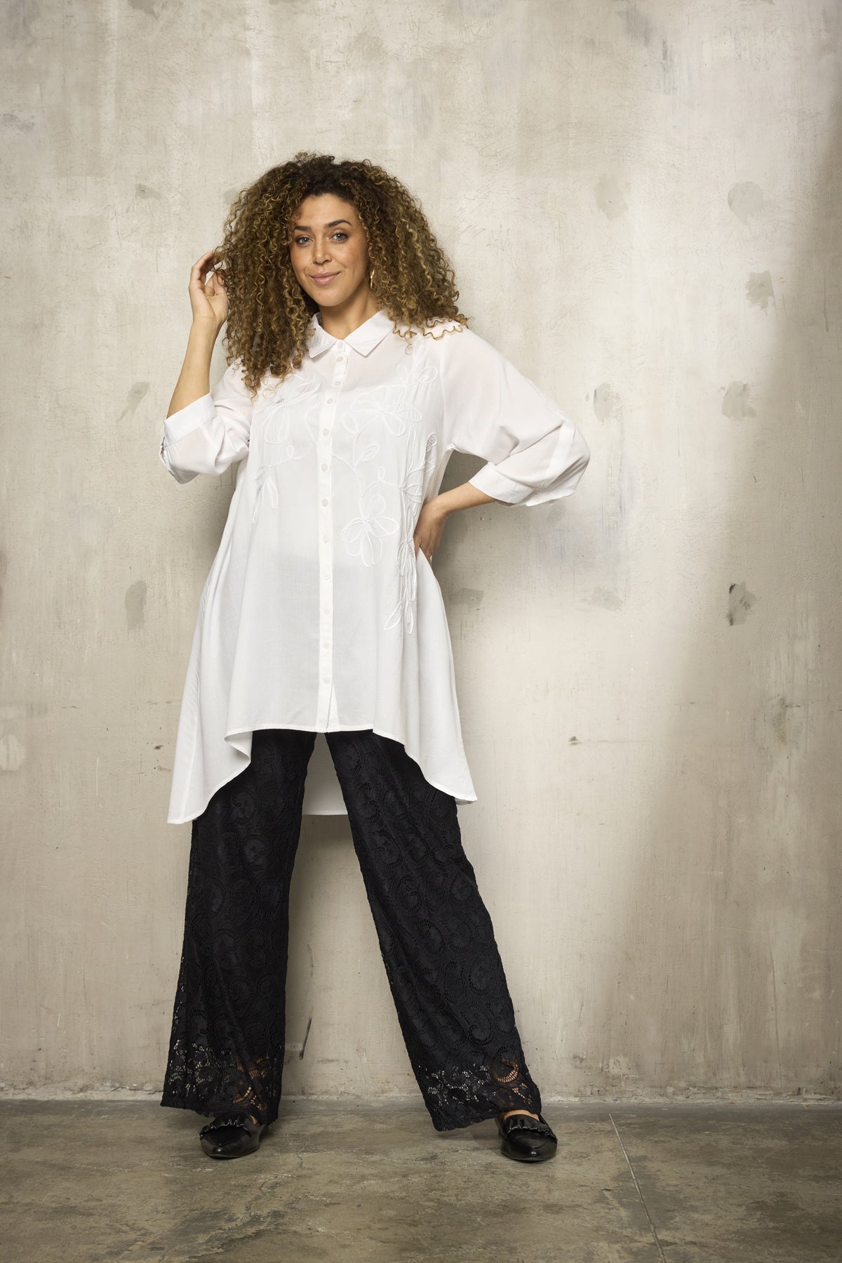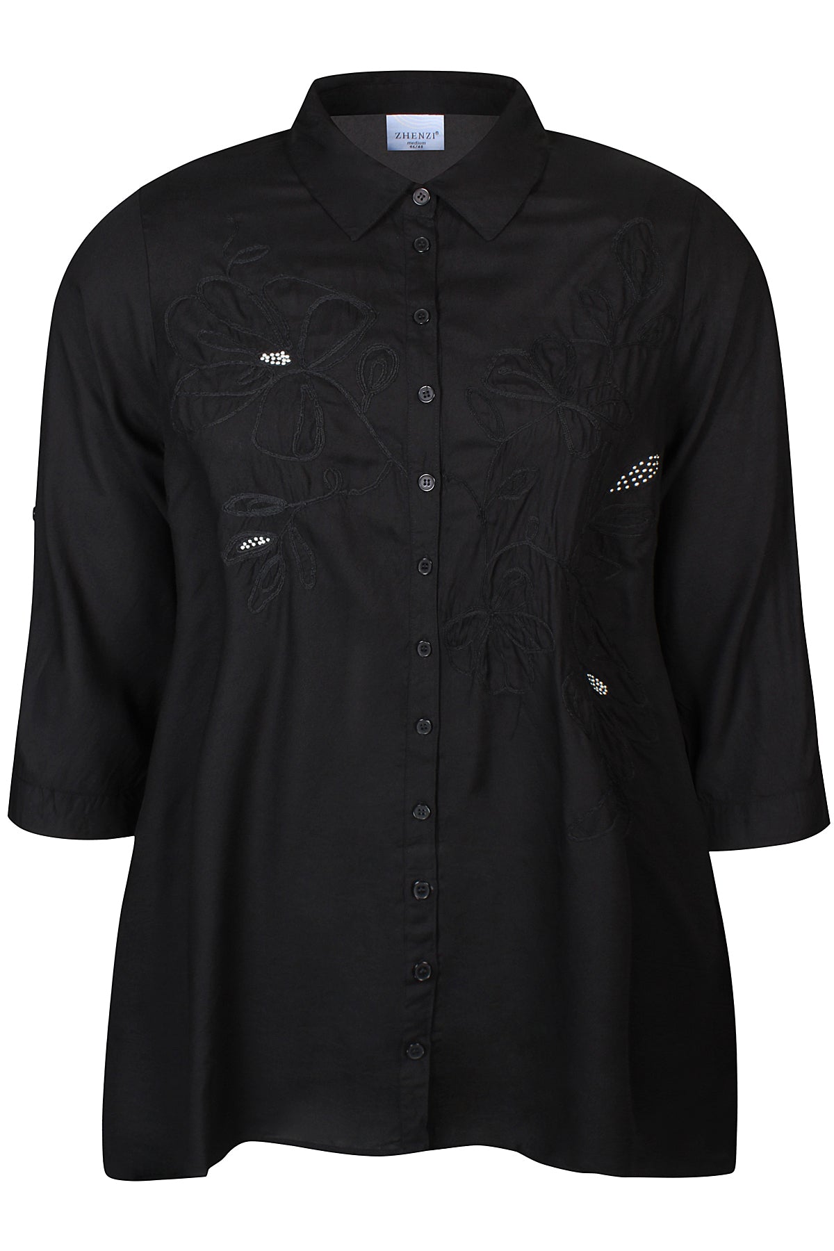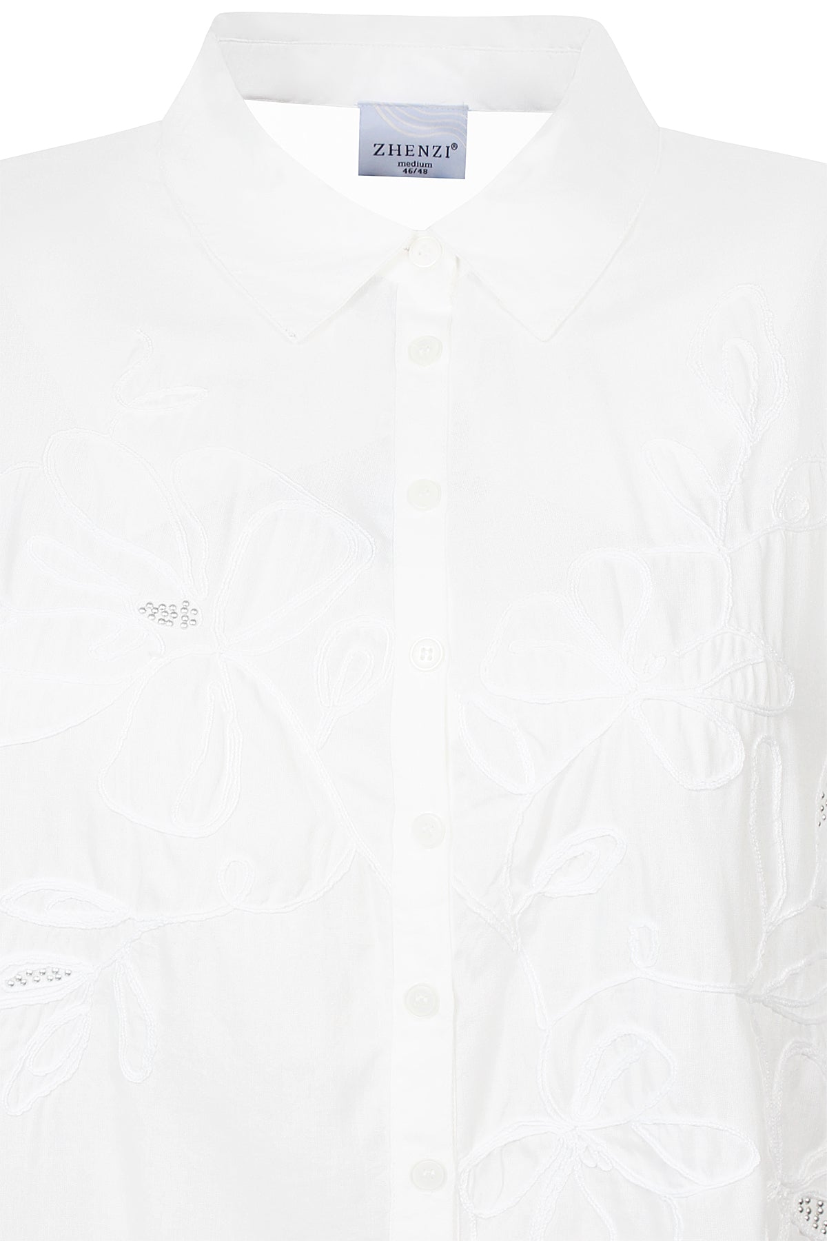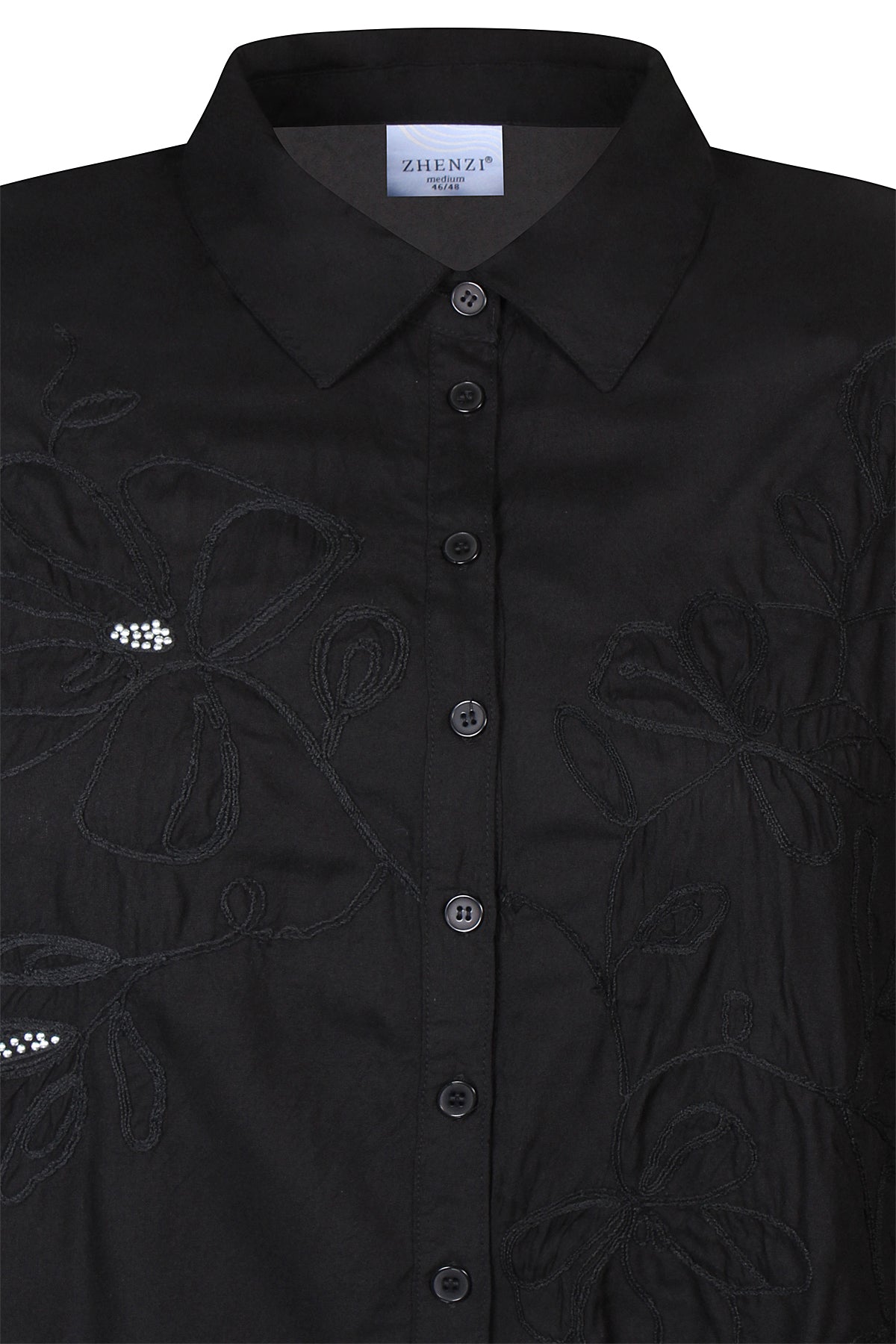 Zhenzi - Siba flott og sparileg skyrta með útsaumuðum blómum og skrautsteinum. Kvartermar með tölu, skyrtukragi, hneppt að framan, felling í baki fyrir betri hreyfivídd, aðeins síðari að aftan. Flott lokuð eða bara sem opin skyrta yfir kjóla og boli.