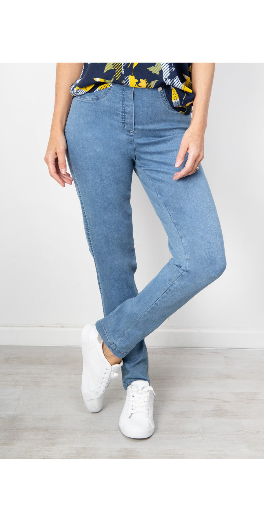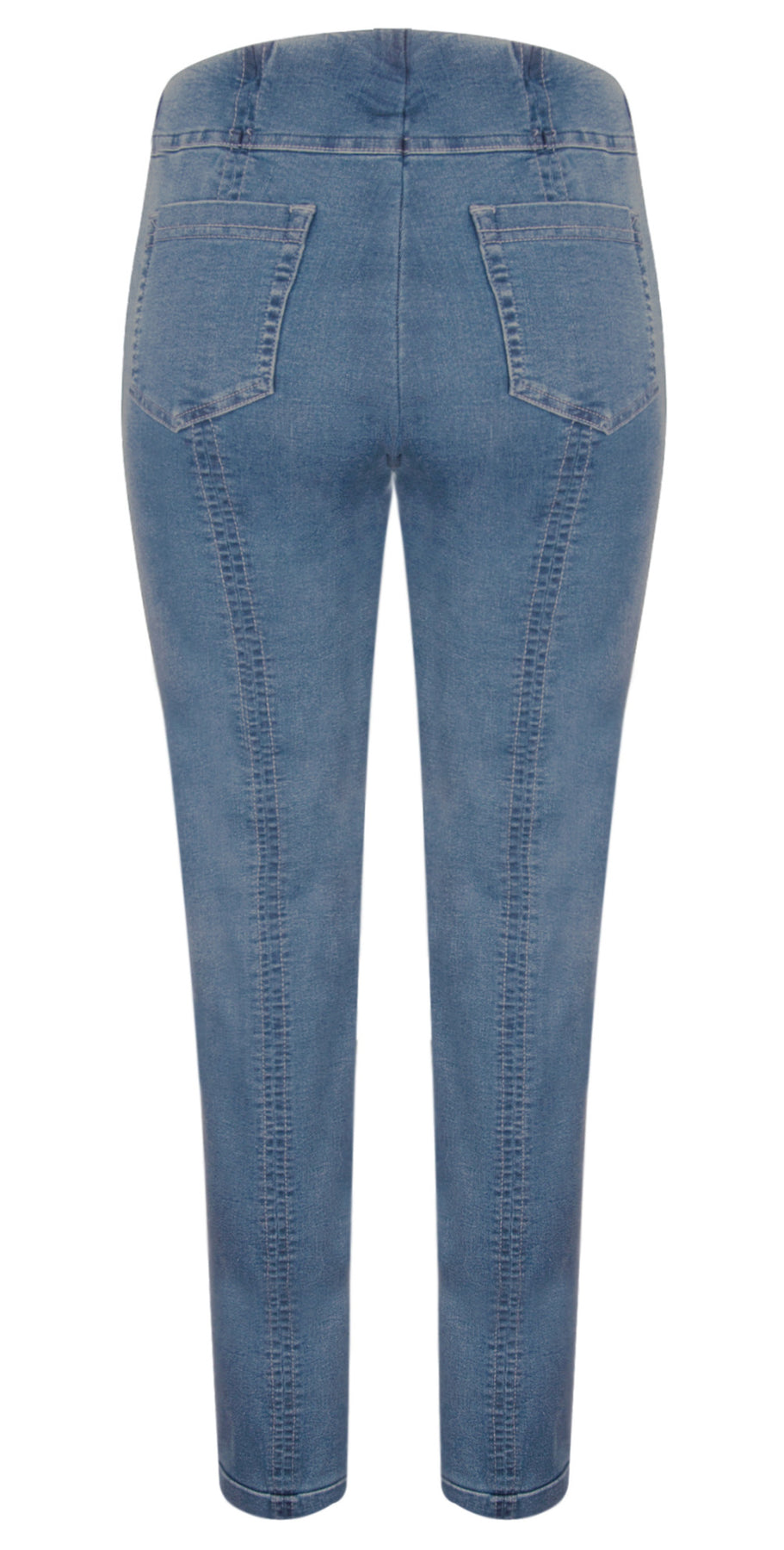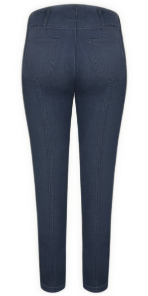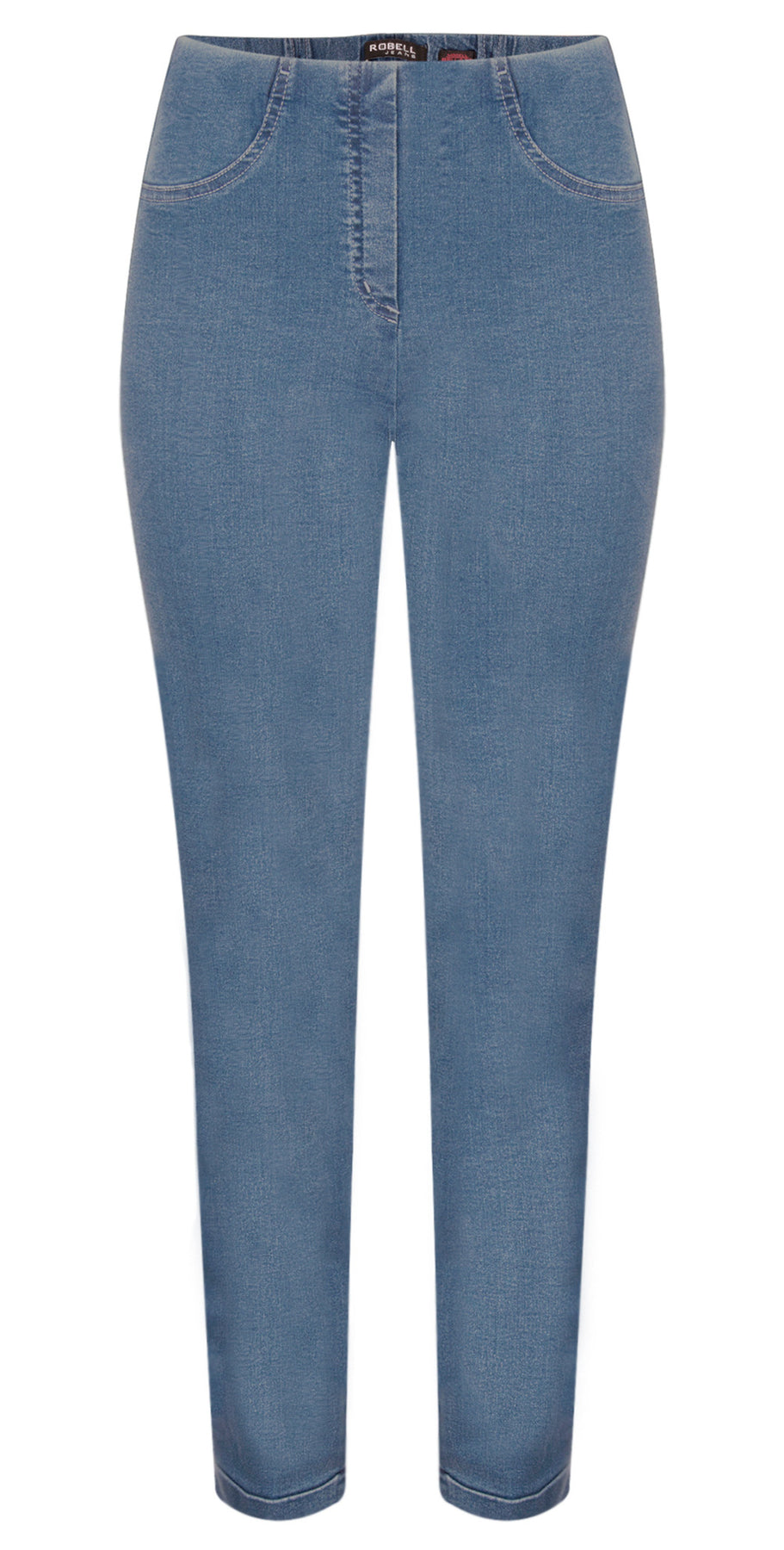 Robell súperþægilegar bómullar gallabuxur með teygju í mittið, rennilásaklauf að framan, en það er bara fyrir útlitið, eins eru saumar fyrir vasa, en þær eru vasalausar að framan en með ágætum rassvösum. Saumar niður skálmar að aftan gefa skemmtilegt og sportlegt útlit. Flottar og þægilegar hversdagsbuxur sem sitja vel, góðar stærðir og mikið strech í efni.