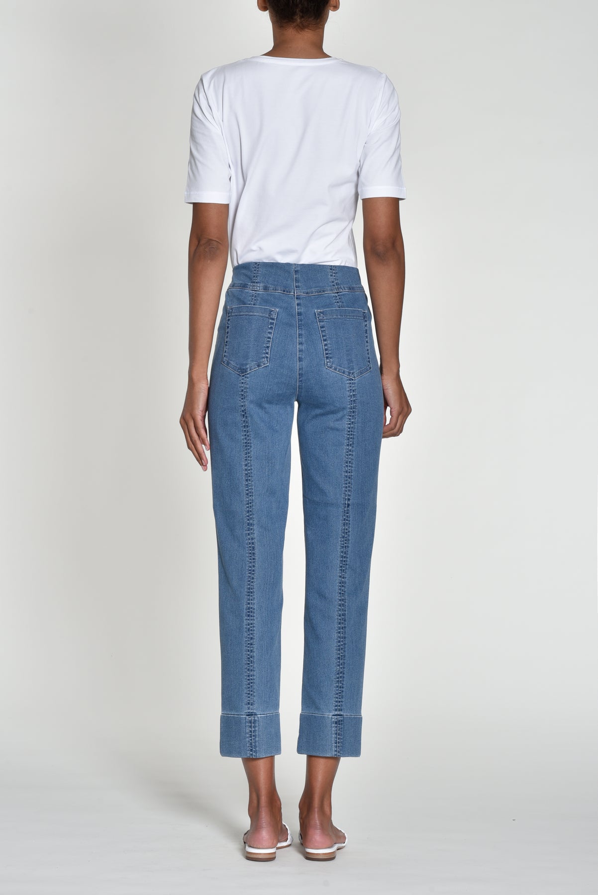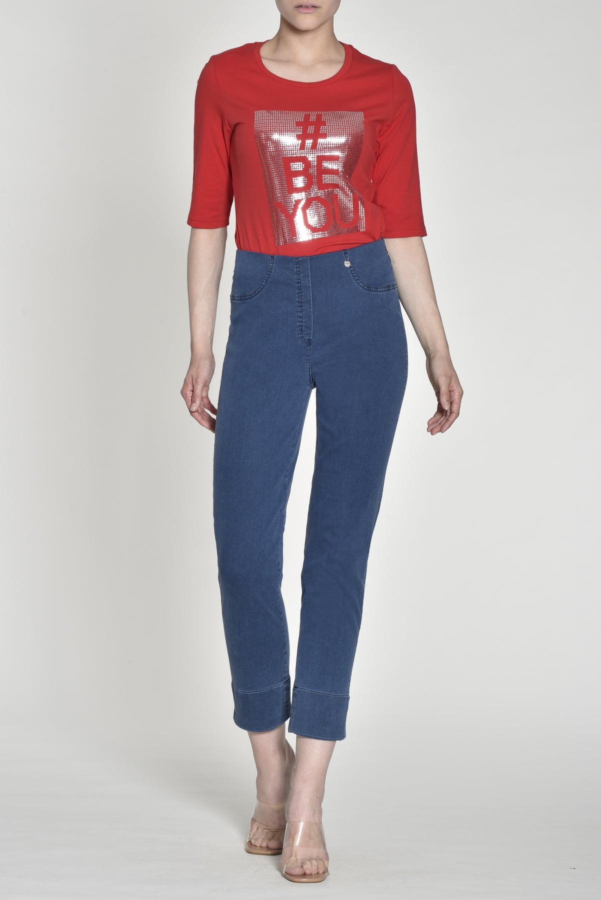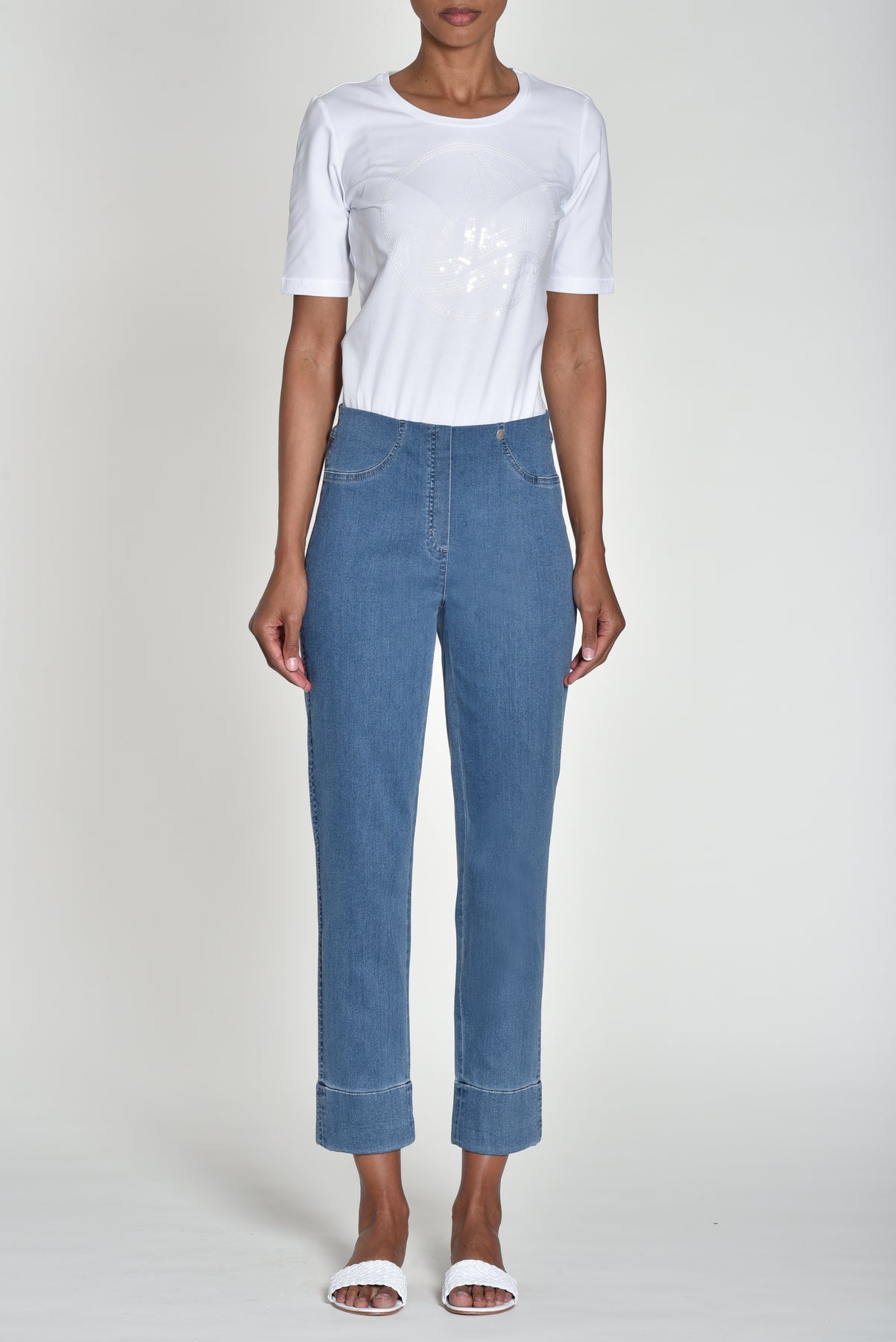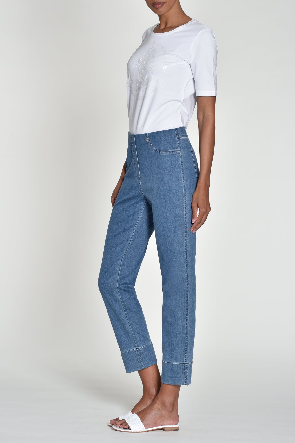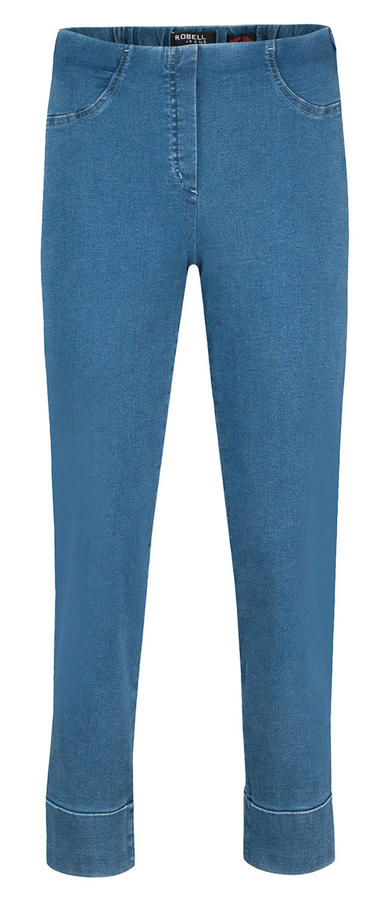 Robell Bella 09 - súperþægilegar ökklasíðar gallabuxur með teygju í mittið og föstu uppábroti, rennilásaklauf að framan, en það er bara fyrir útlitið, eins eru saumar fyrir vasa, en þær eru vasalausar að framan en með ágætum rassvösum. Saumar niður skálmar að aftan gefa skemmtilegt og sportlegt útlit. Flottar og þægilegar hversdagsbuxur sem sitja vel, góðar stærðir og mikið strech í efni. Síddin er ca 68 cm og henta vel sem síðbuxur fyrir konur sem þurfa styttri sídd