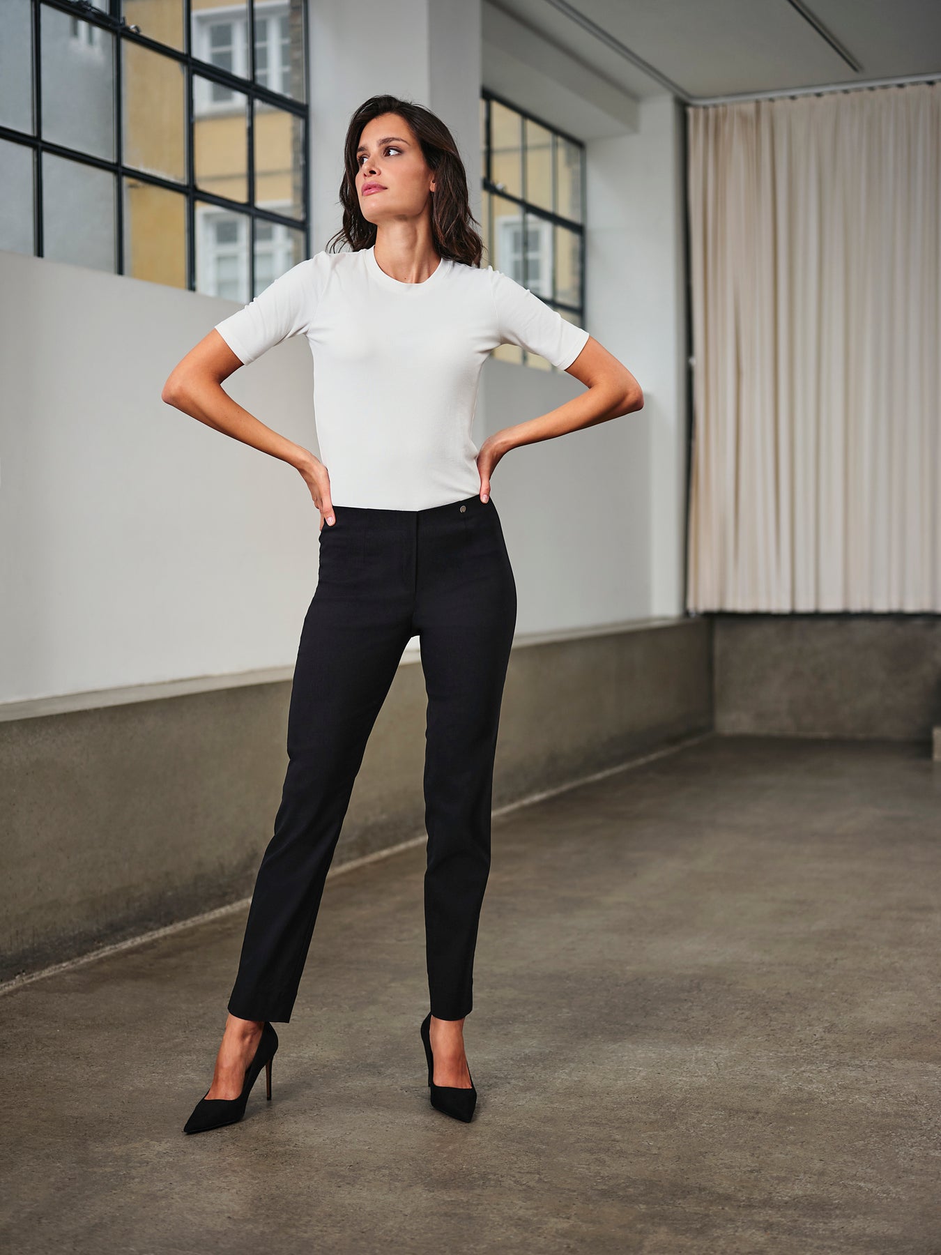 Robell súperþægilegar strechbuxur með teygju í mittið, rennilásaklauf að framan, en það er bara fyrir útlitið. Flottar og þægilegar hversdagsbuxur sem sitja vel, góðar stærðir og mikið strech í efni. Síddin er ca 78 cm.