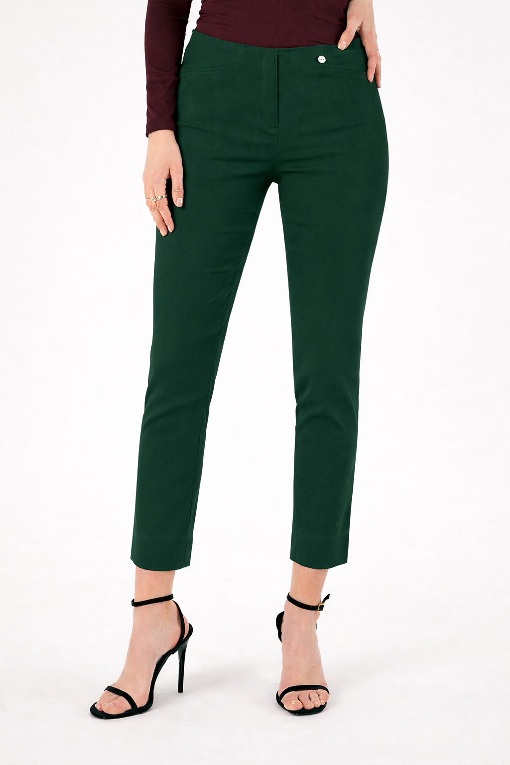 Robell súperþægilegar ökklabuxur úr strechefni, með teygju í mittið, rennilásaklauf að framan, sem er bara fyrir útlitið tveimur skrautröndum neðst á skálmum sem gefur sparilegt og skemmtilegt útlit. Flottar og þægilegar buxur sem sitja vel og virka bæði hversdags og spari, góðar stærðir og mikið strech í efni. Innanfótarmál er ca 68 cm, flottar ökklabuxur og virka líka vel sem síðbuxur, fyrir þær sem þurfa aðeins styttri sídd.