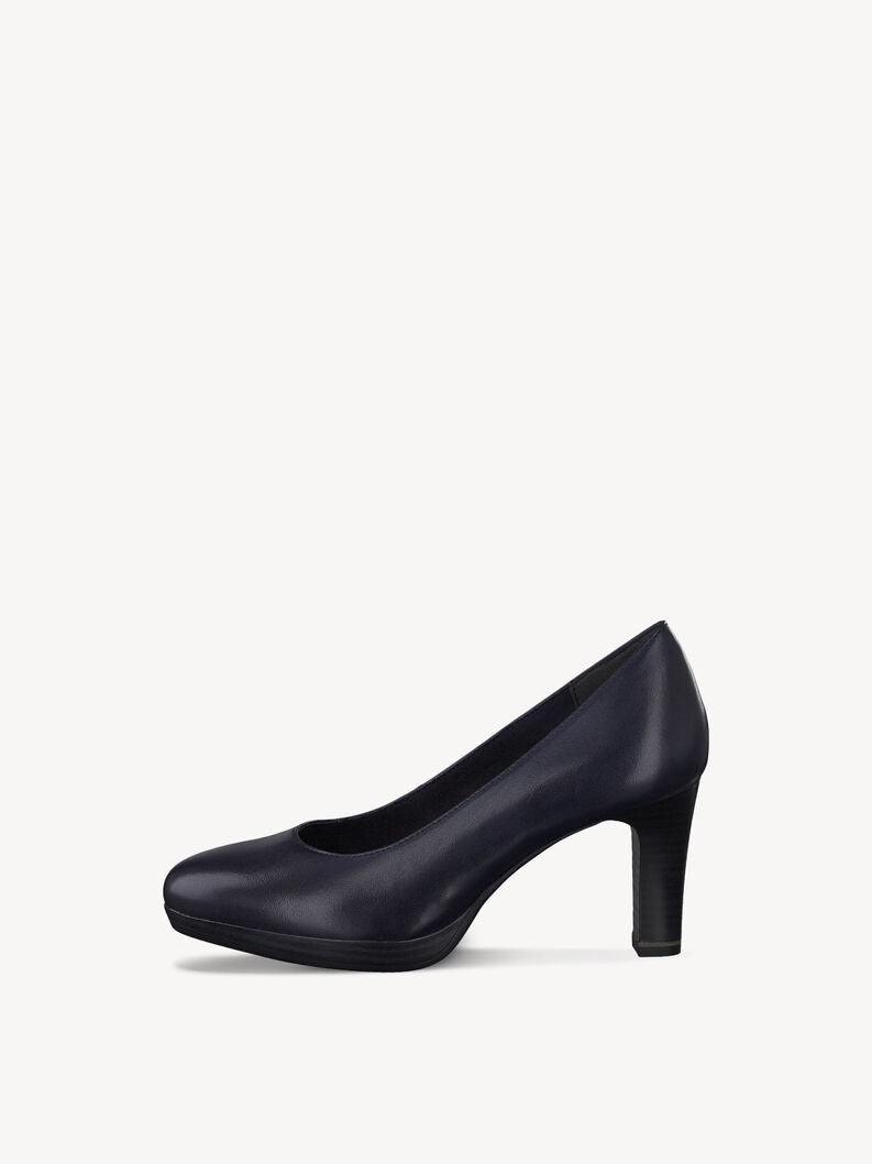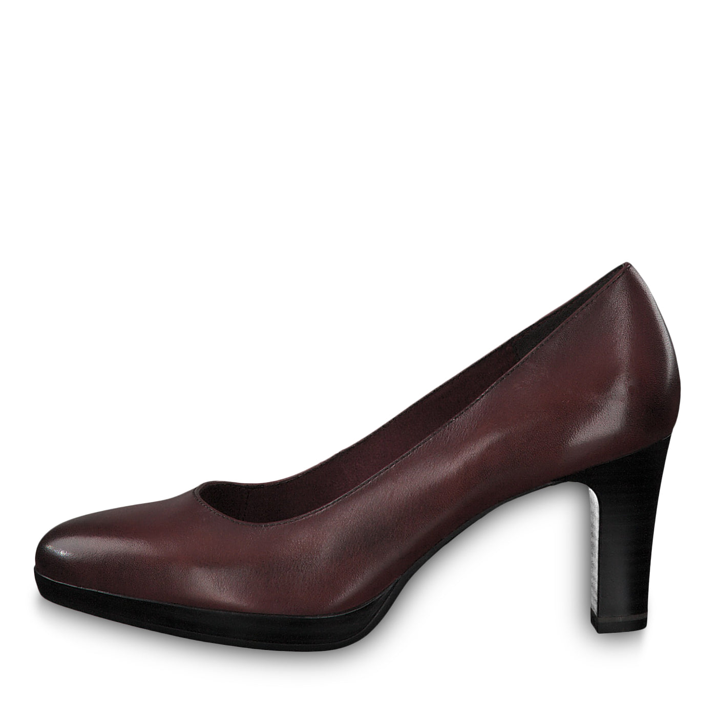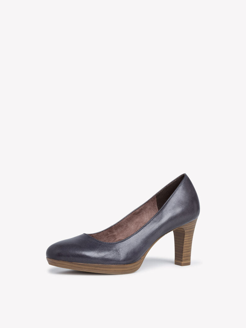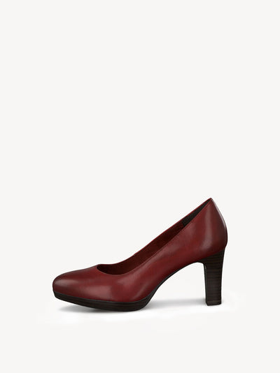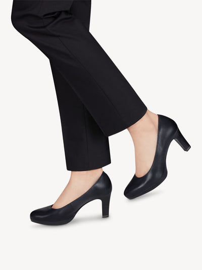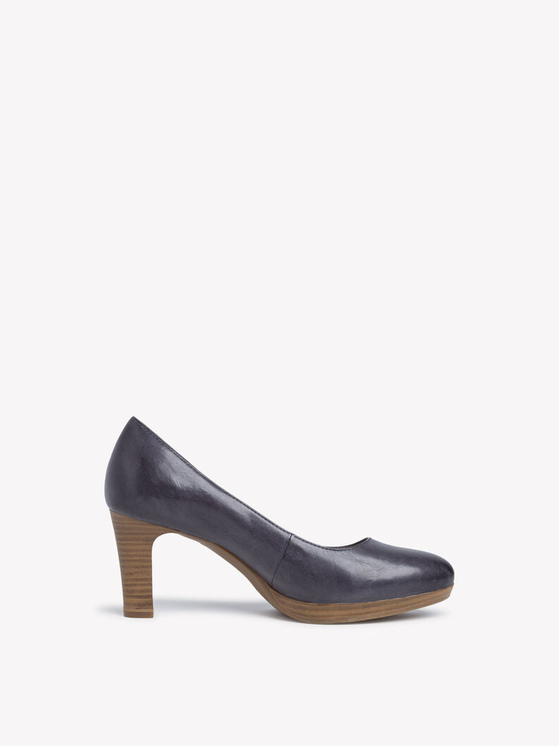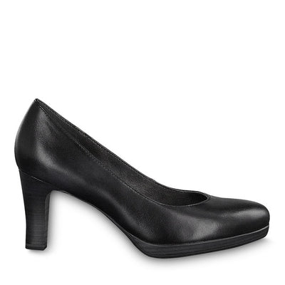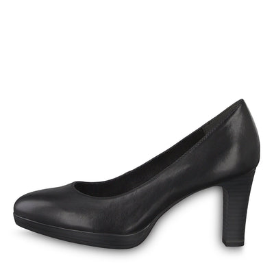 Leðurskór með rúnaðri tá og 7 cm hæl, mjúkt "platform" =1 cm upphækkun undir il, þannig að hann virkar hærri en hann er í raun og veru.