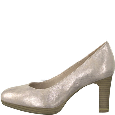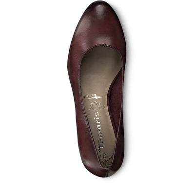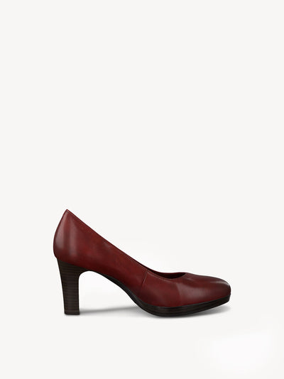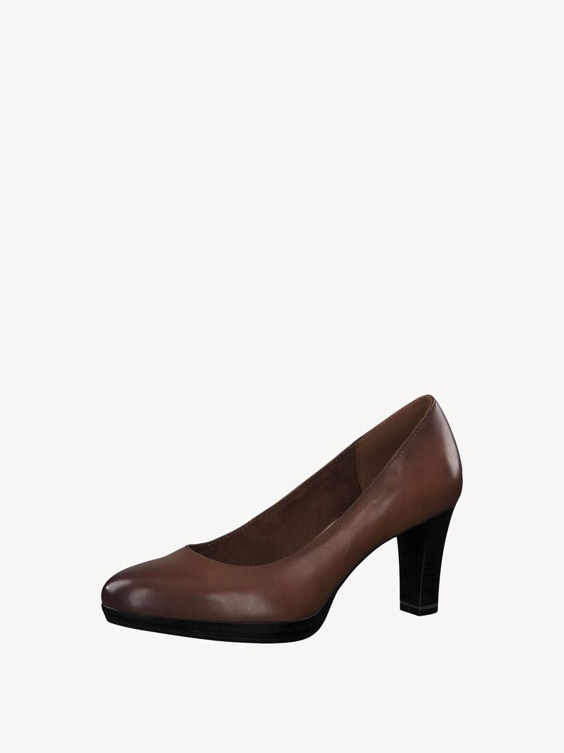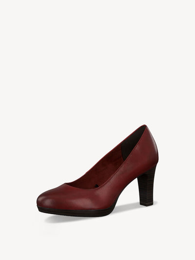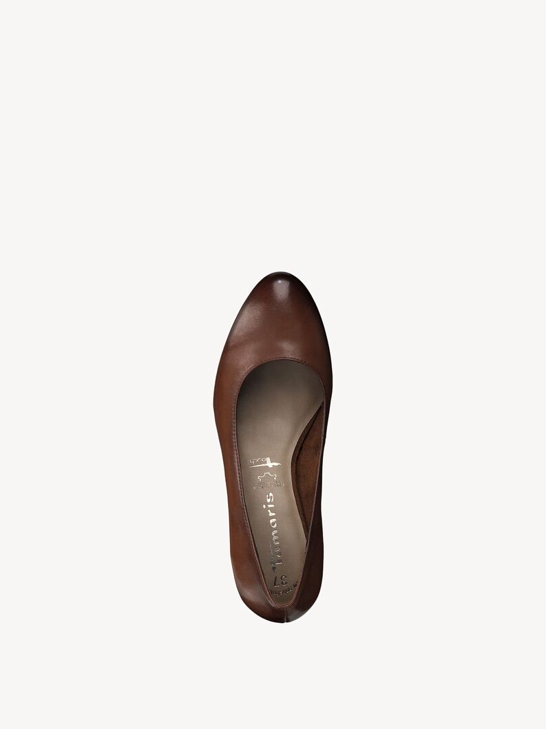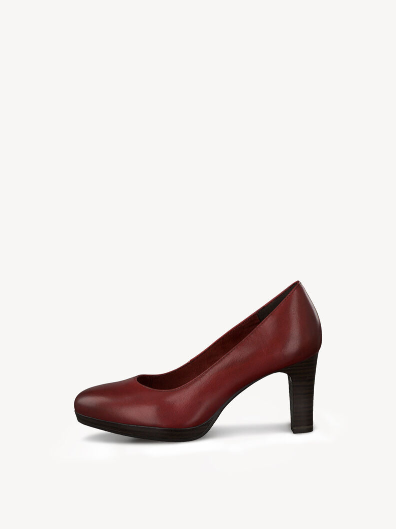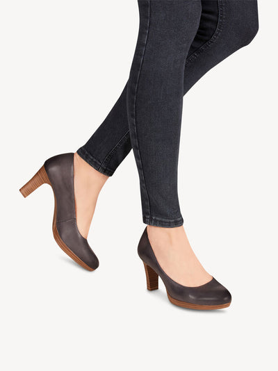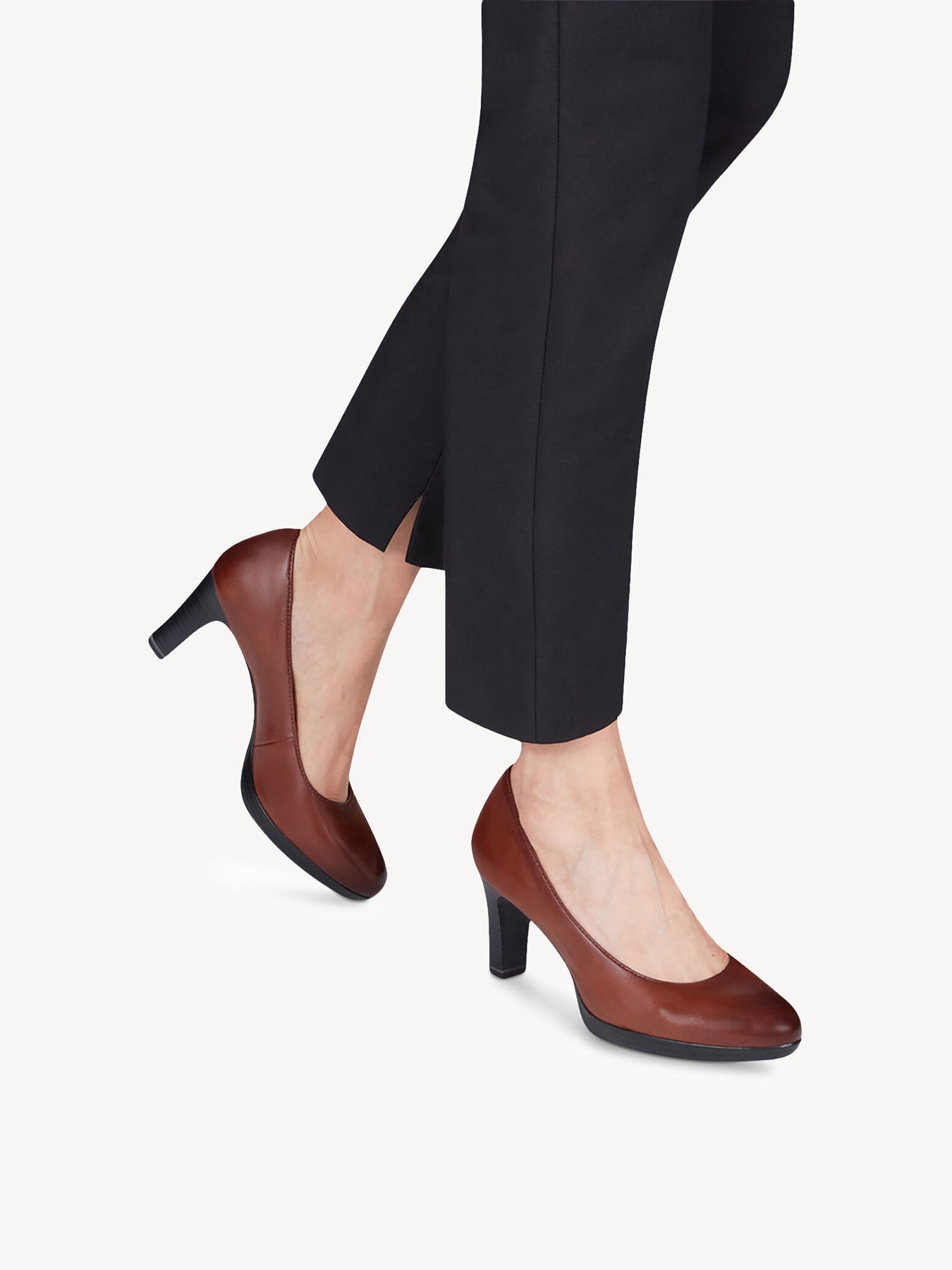 Leðurskór með rúnaðri tá og 7 cm hæl, mjúkt "platform" =1 cm upphækkun undir il, þannig að hann virkar hærri en hann er í raun og veru.